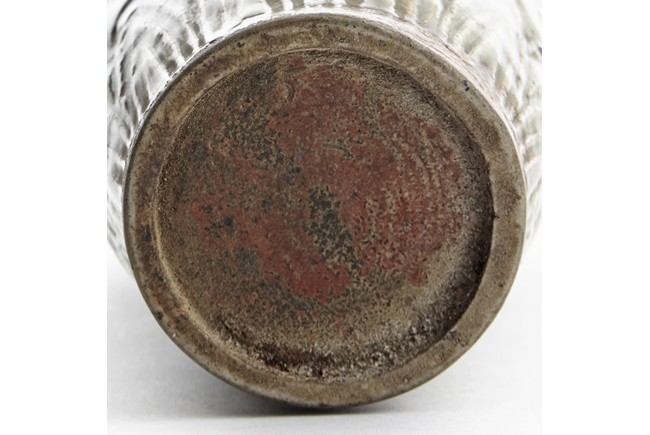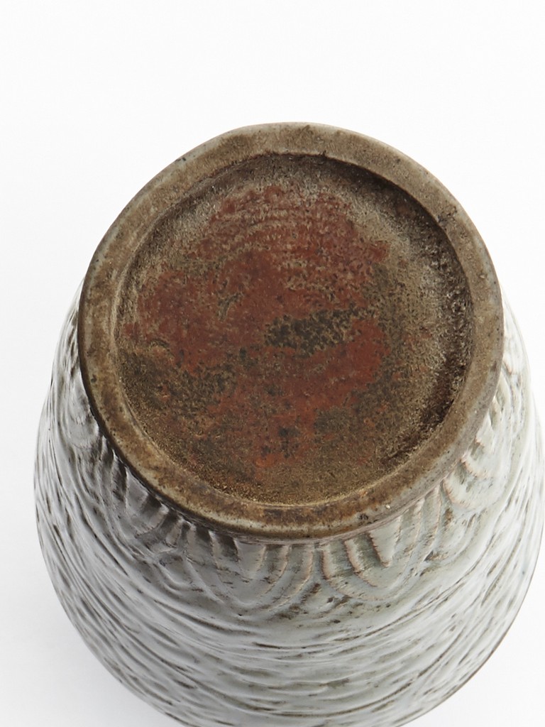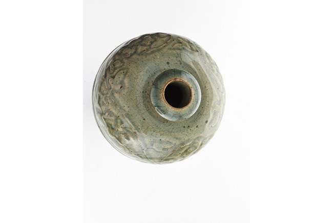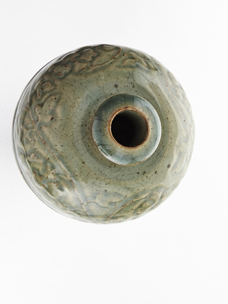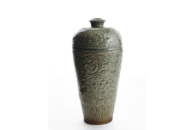 Of high shoulder and tapering form, the exterior finely carved with scrolling vines pattern, the foot encircled with a band of leave motif and entirely covered with a celadon green glaze. Ming Dynasty period.