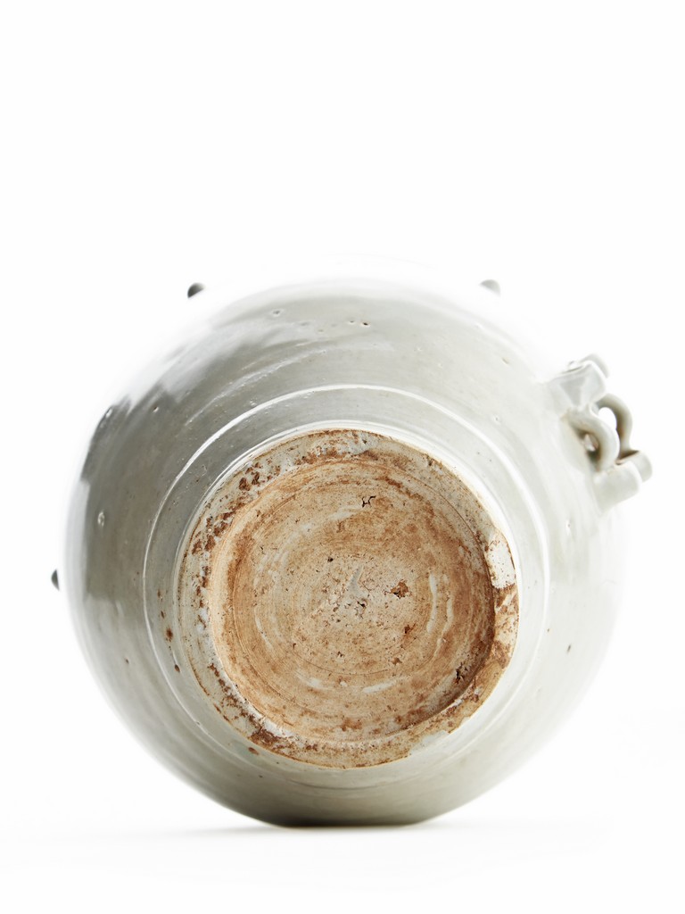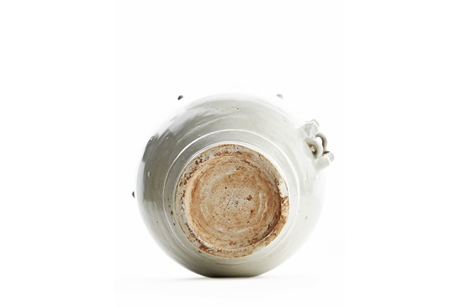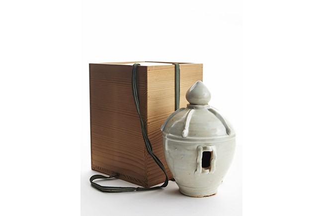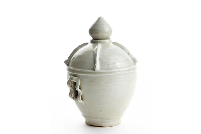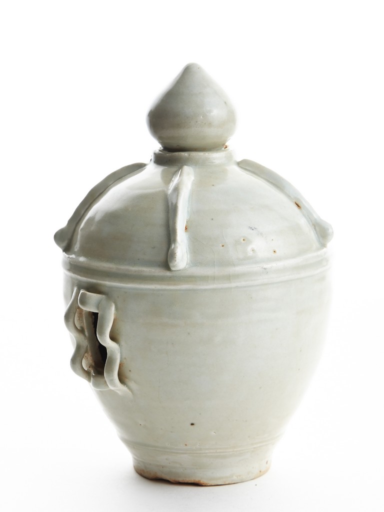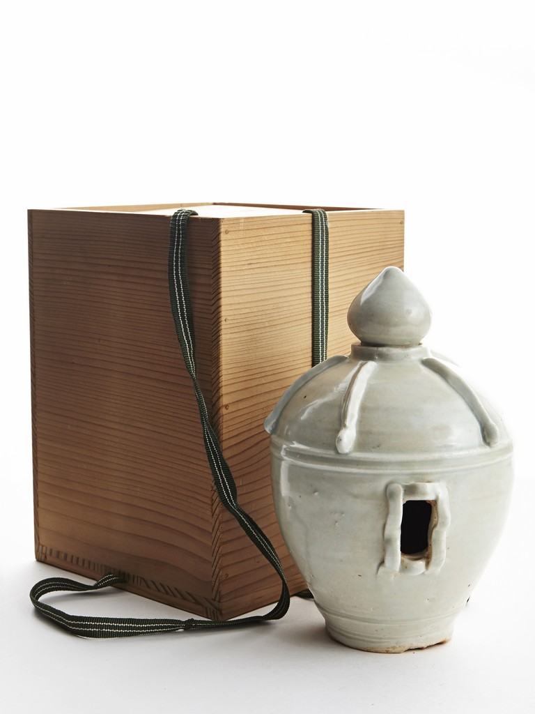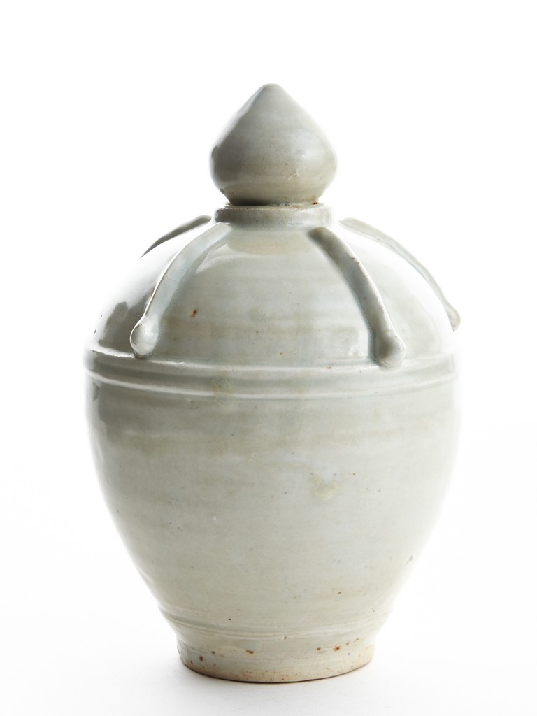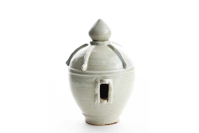Of ovoid form, the urn surmounted with a bud finial, the body with a rectangular opening, overall glazed in greenish white tone. Song Dynasty period.