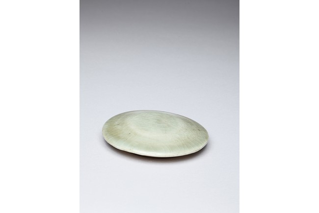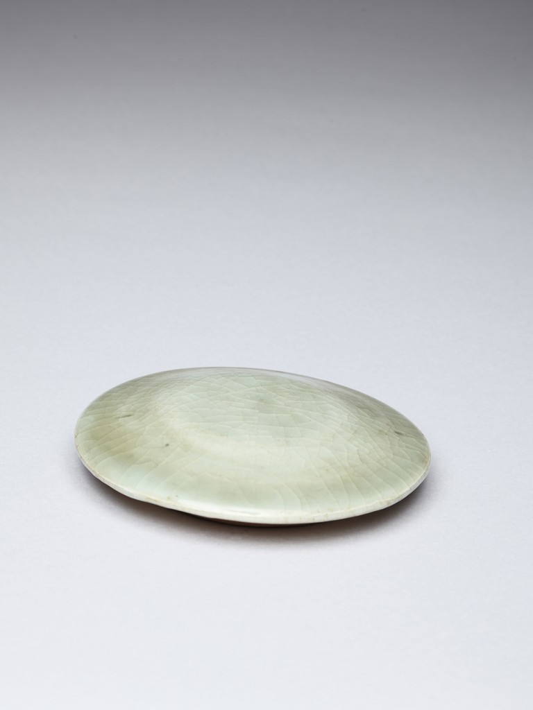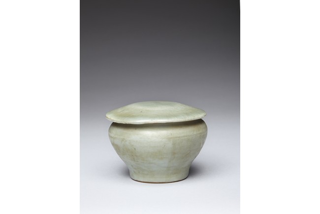 With rounded shoulders tapering to the feet and leaf-form cover, overall glazed in celadon tone. Song Dynasty period.