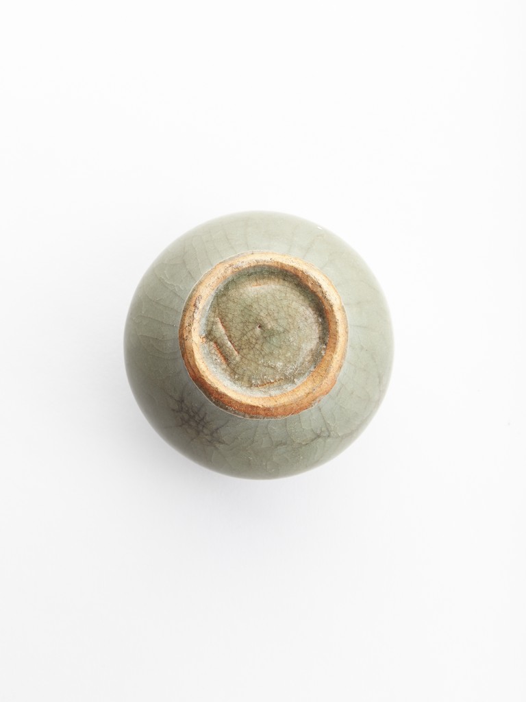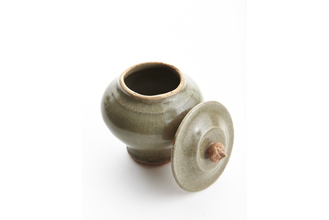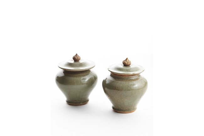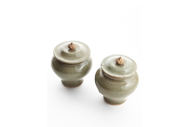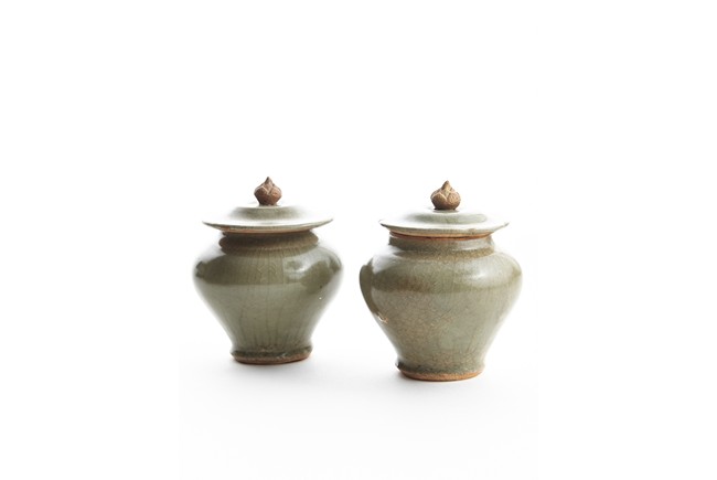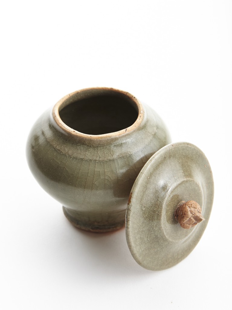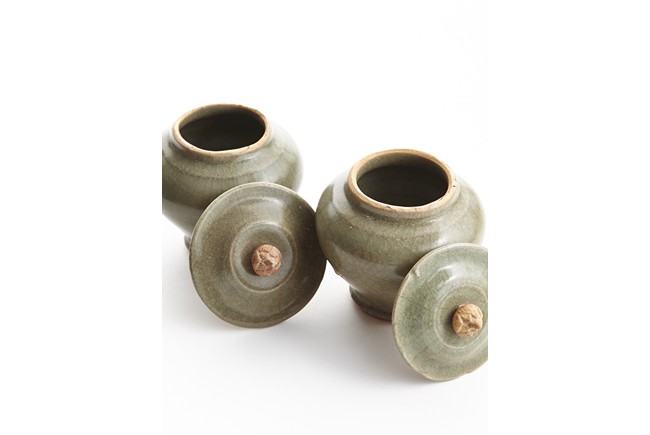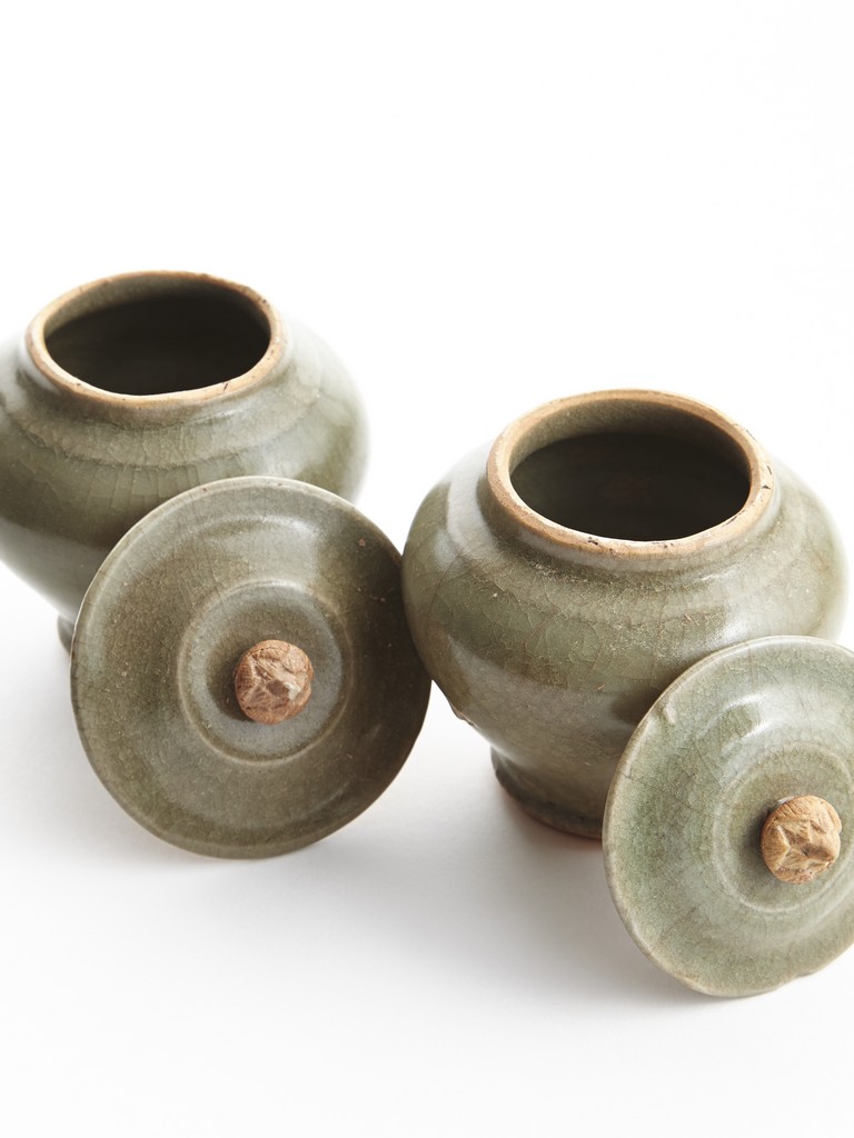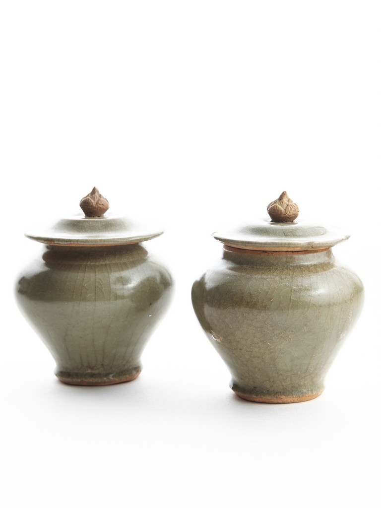 Each well-potted and with globular form body, the cover modelled with a unglazed lotus bud finial, the jar overall covered with attractive pale celadon green glaze. Yuan Dynasty period.