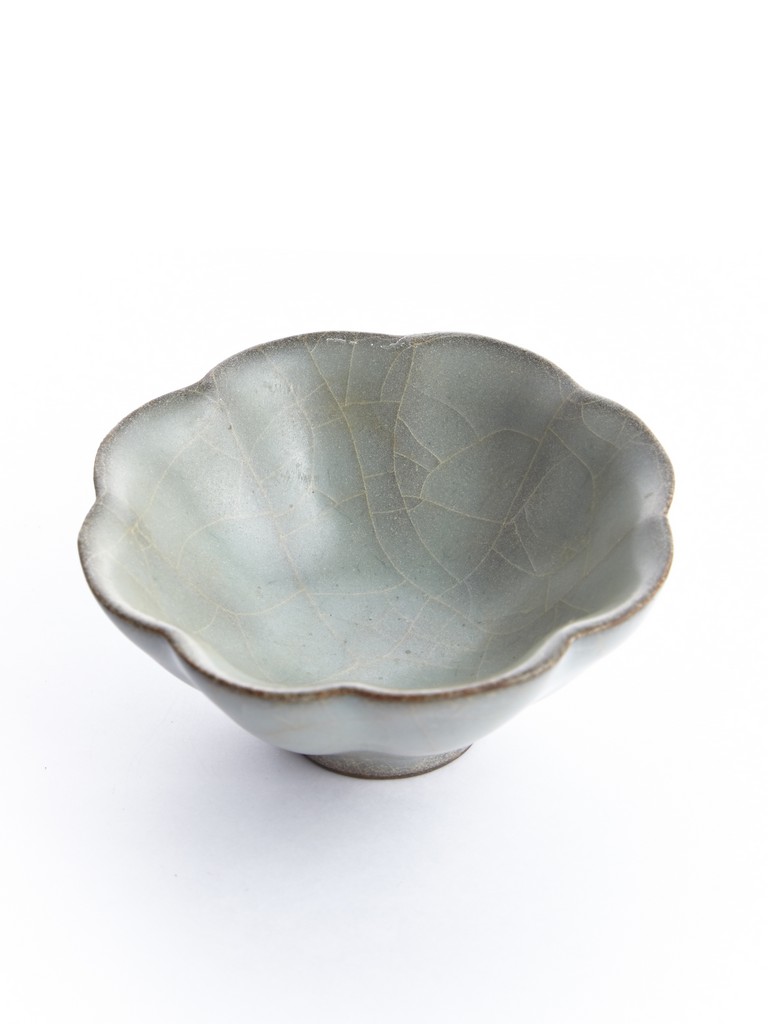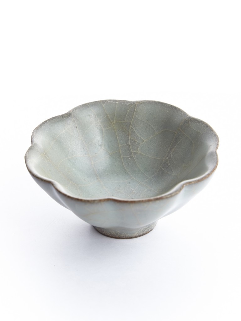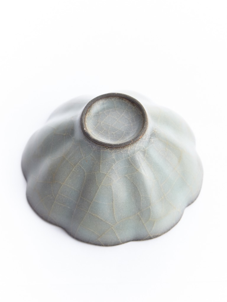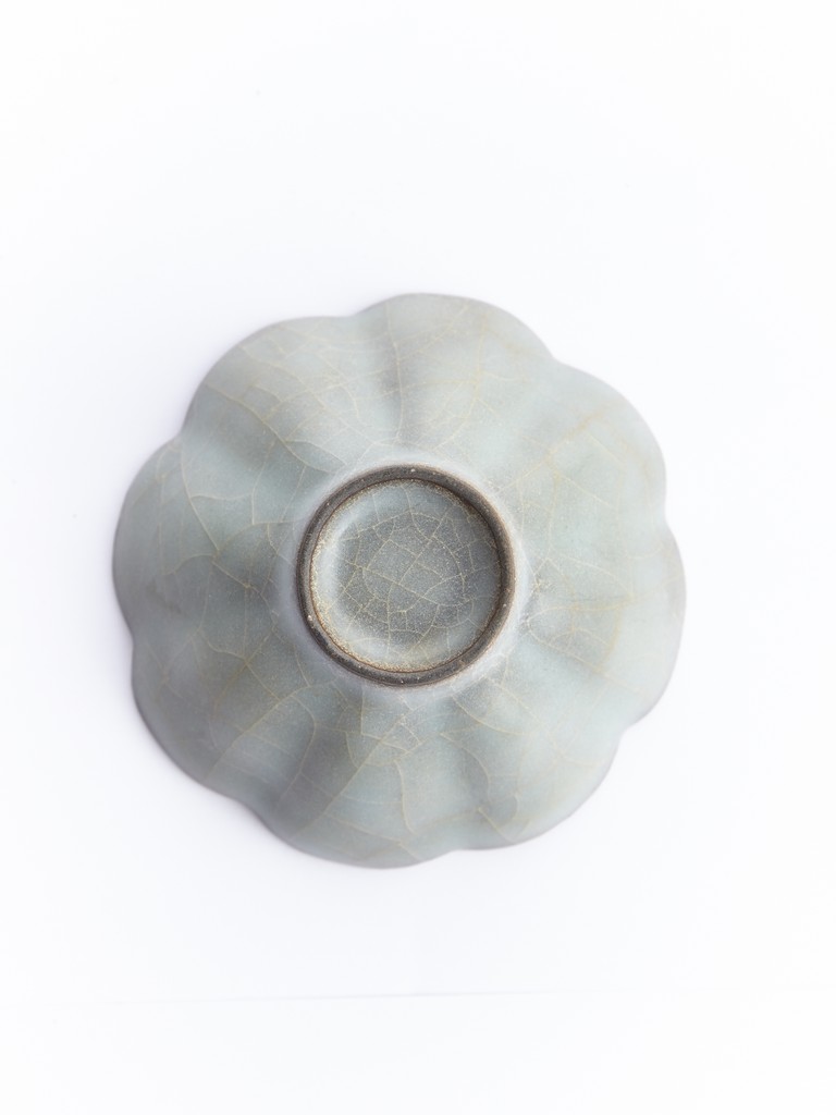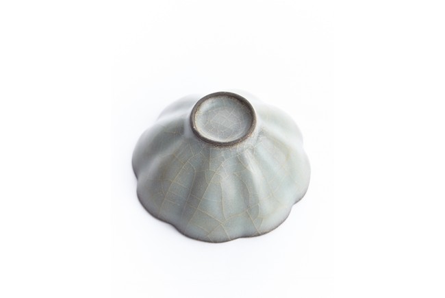 With gently rounded sides standing on short foot ring, the cup is of floriform form and shaped into eight flower petals, the body glazed in elegant celadon tone with crackle patterns, the foot ring unglazed. Song Dynasty period.