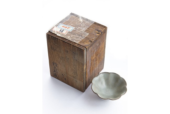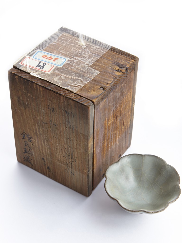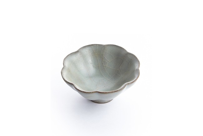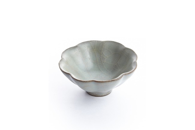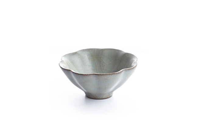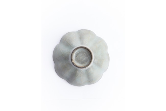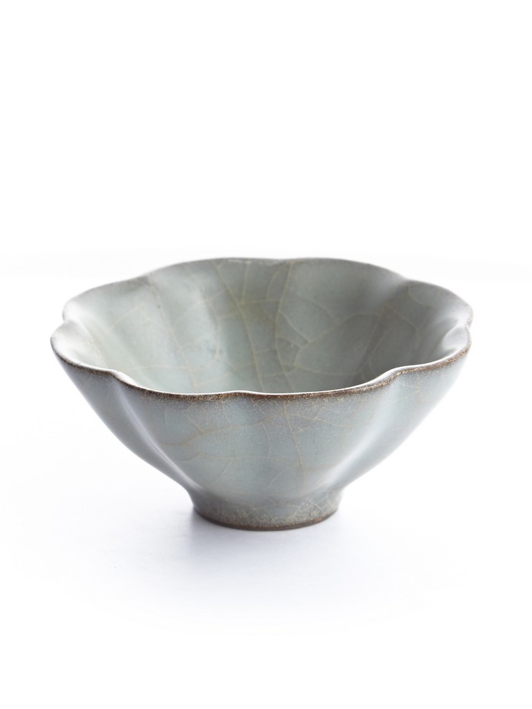 With gently rounded sides standing on short foot ring, the cup is of floriform form and shaped into eight flower petals, the body glazed in elegant celadon tone with crackle patterns, the foot ring unglazed. Song Dynasty period.
