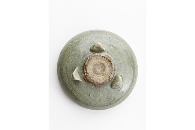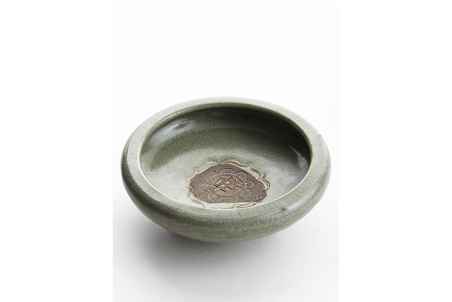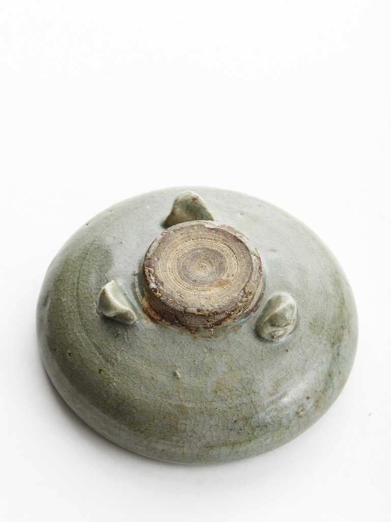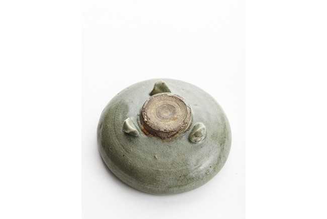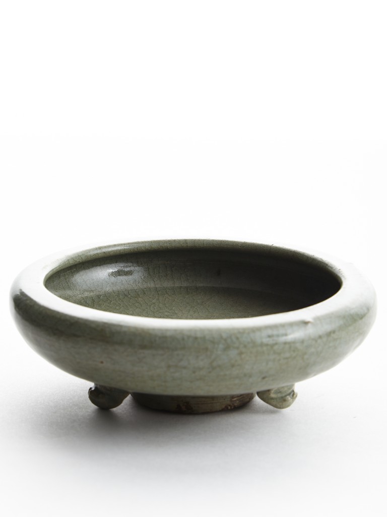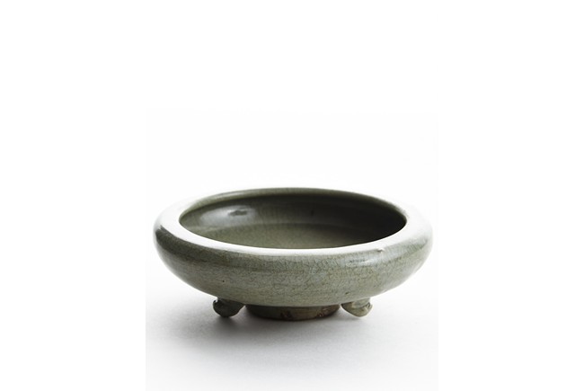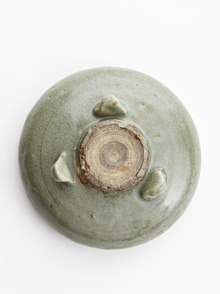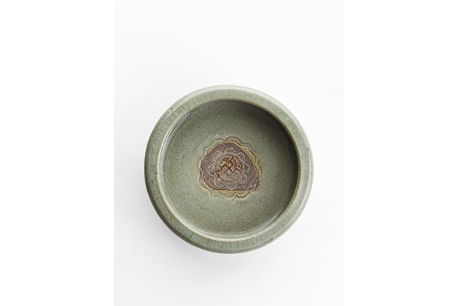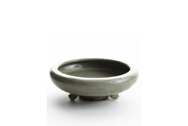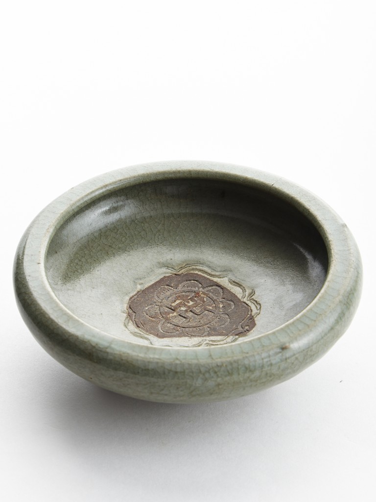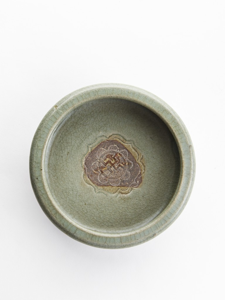 The compressed washer rising from a circular foot and three short stubs, the interior moulded with a Buddhist swastika symbol, the exterior finely suffused with attractive celadon green tone. Yuan Dynasty period.