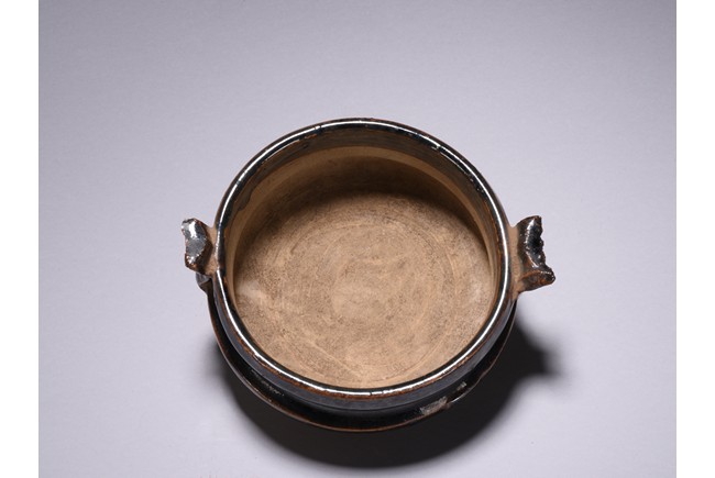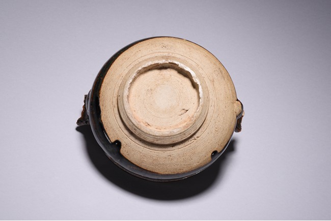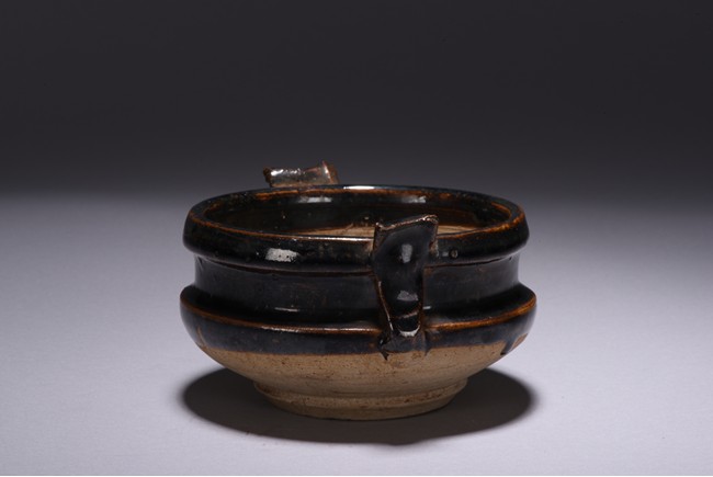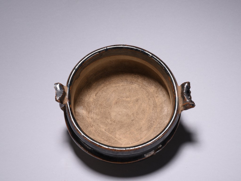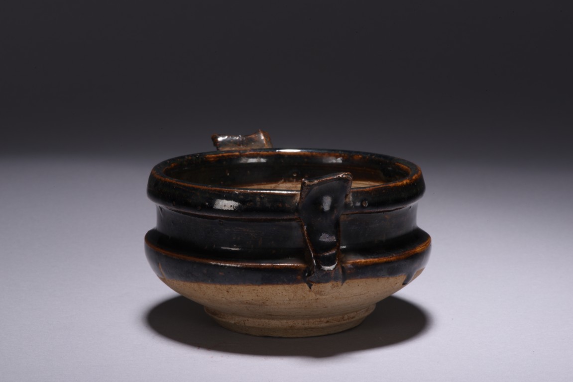 The bowl covered with brownish black glaze half way towards feet, the side flanked by two handles. The interior and base unglazed. Song Dynasty period.