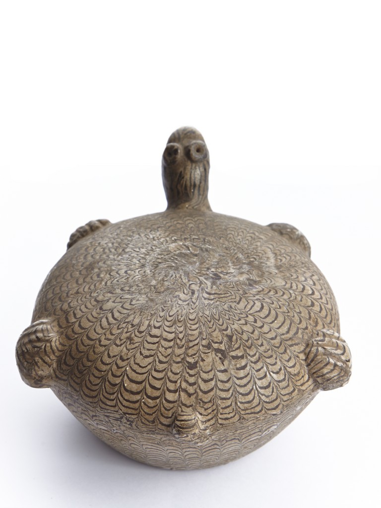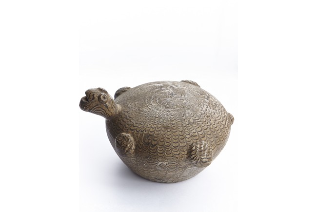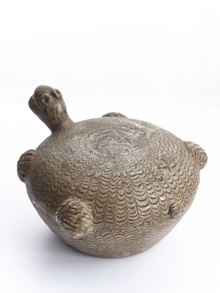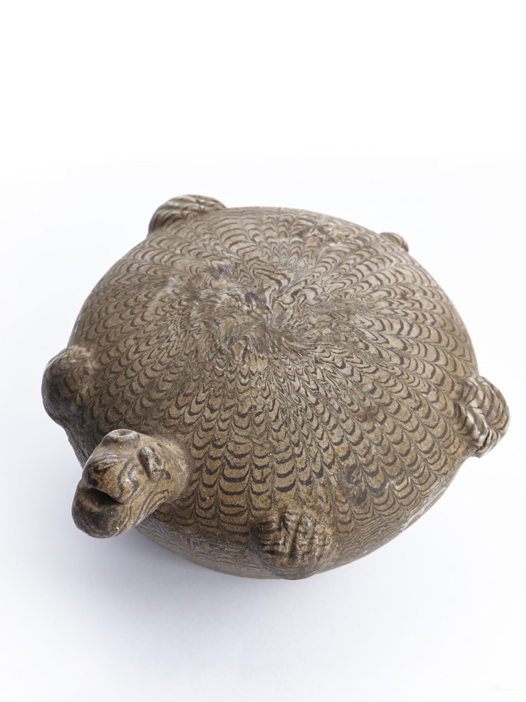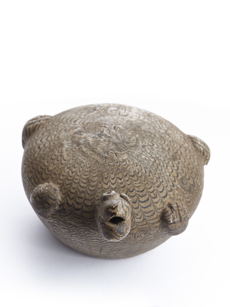 The porcelain water drip in the form of a turtle, the body and shell of water drip patterns, the four short legs extending out from the sides, with the head raised high and open mouth. song dynasty period.