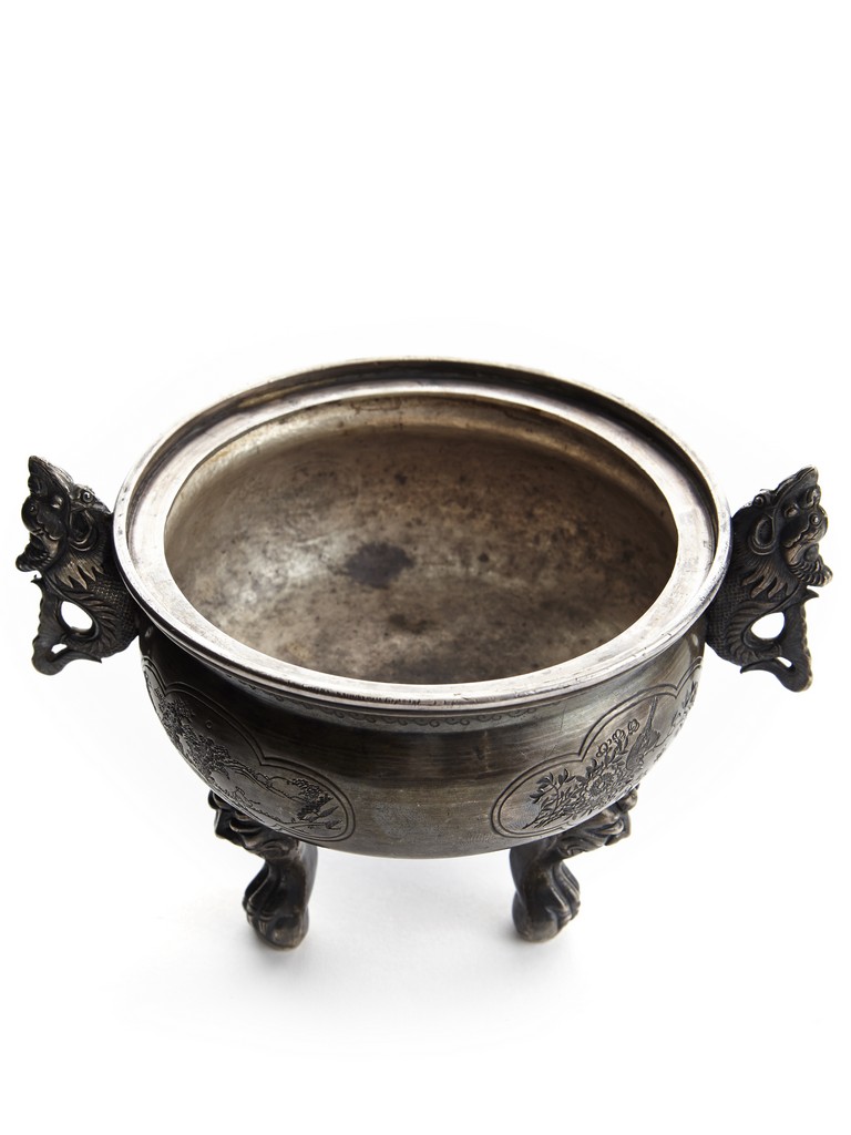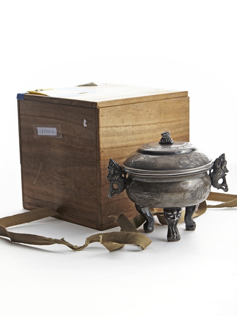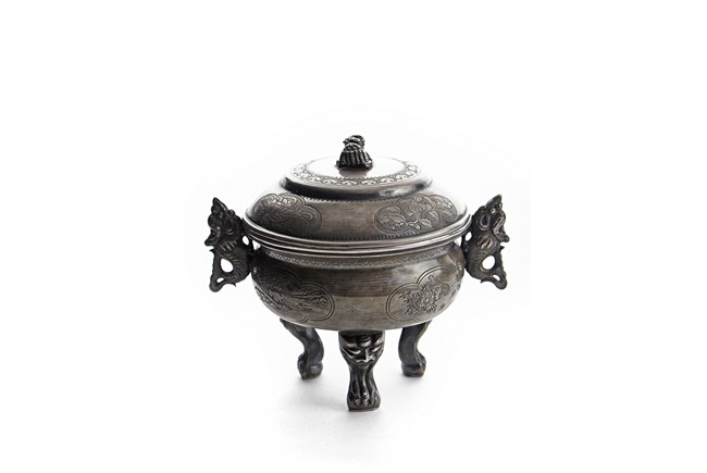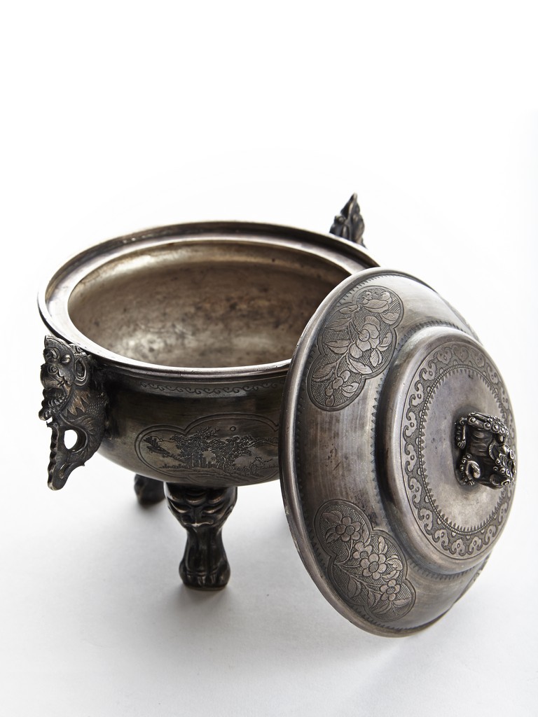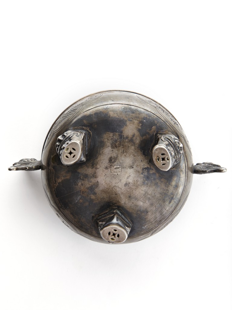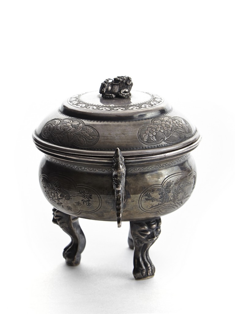 Supported on three mythical beast mask feet, the body is of compressed globular form etche with four shaped panels enclosing scene of landscape and bird upon flowering branch, flanked by two fish-formed handles, the domed cover further decorated with similar panels of flowering leafy branch and surmounted with a recumbent Buddhist lion finial. The base etched with mark 'Feiwenyuanyu ji'. Accompanied with wooden box. Qing Dynasty Jiaqing period.
