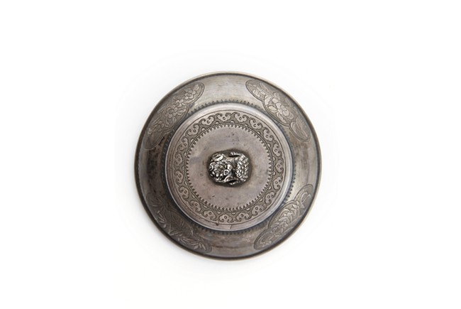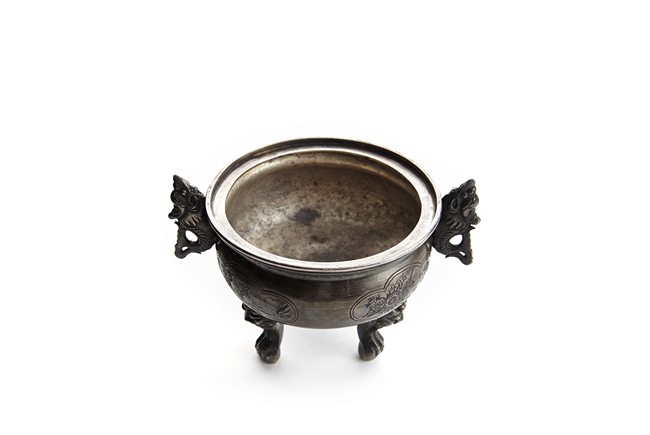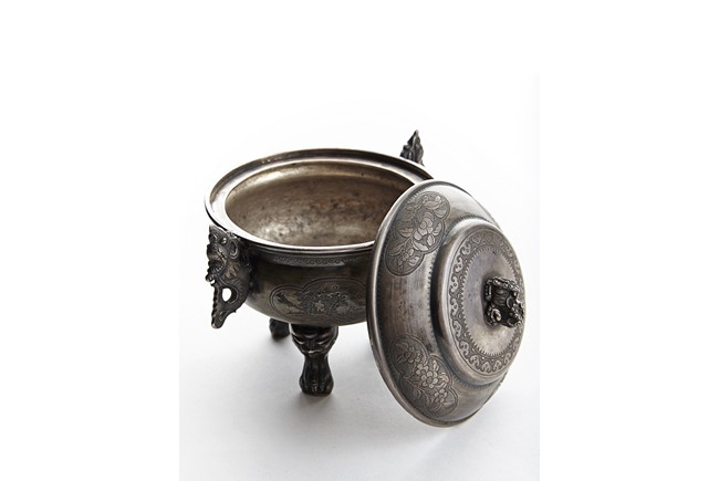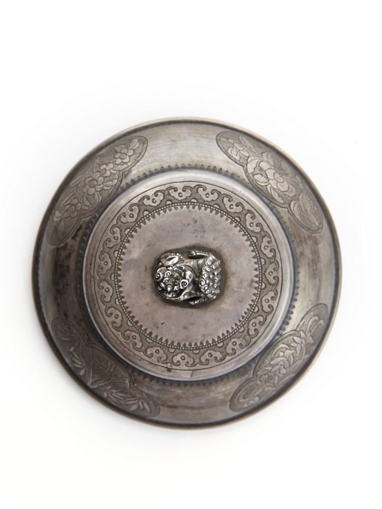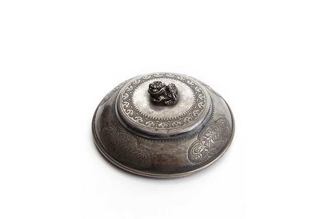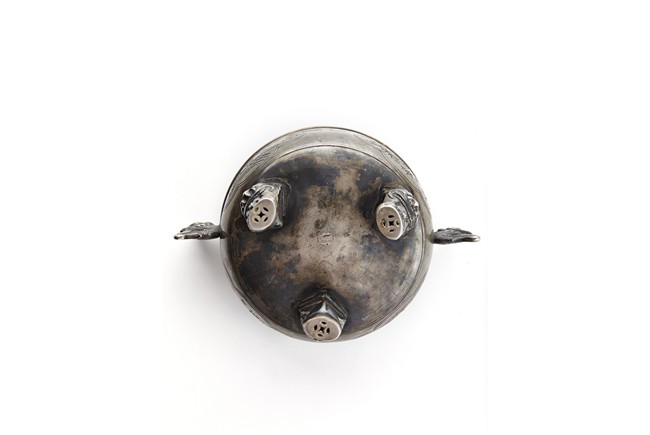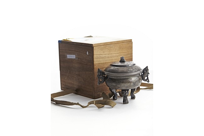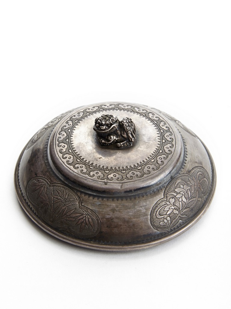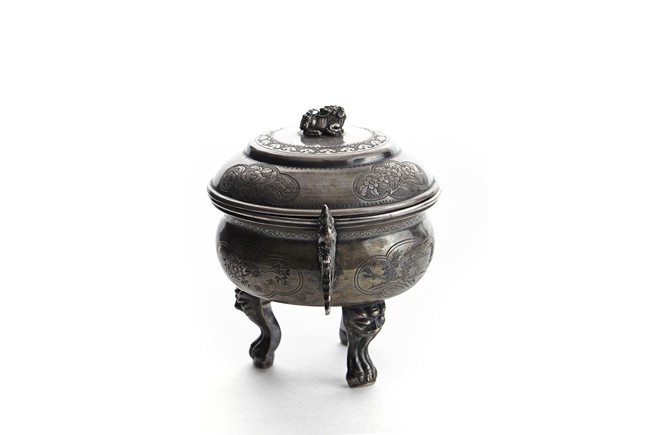 Supported on three mythical beast mask feet, the body is of compressed globular form etche with four shaped panels enclosing scene of landscape and bird upon flowering branch, flanked by two fish-formed handles, the domed cover further decorated with similar panels of flowering leafy branch and surmounted with a recumbent Buddhist lion finial. The base etched with mark 'Feiwenyuanyu ji'. Accompanied with wooden box. Qing Dynasty Jiaqing period.