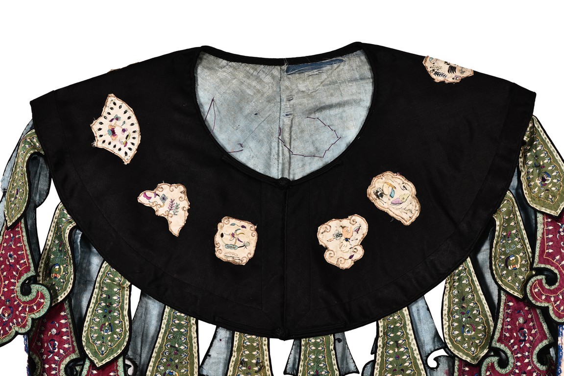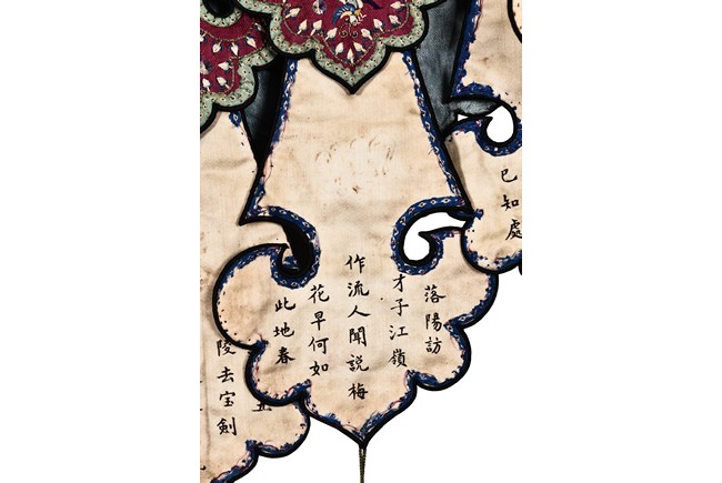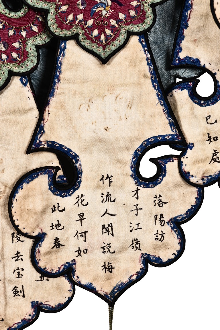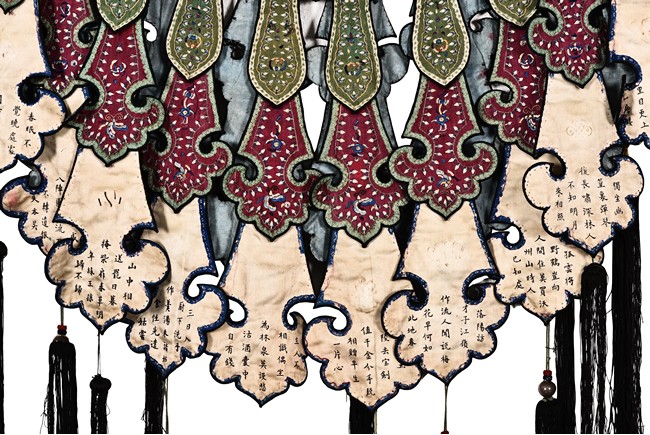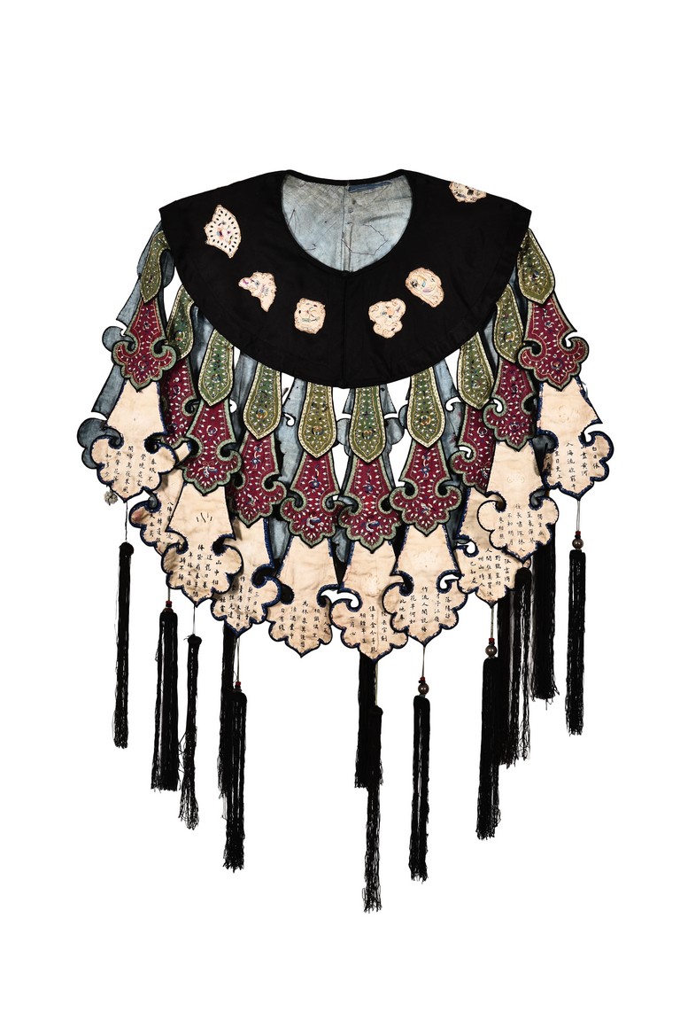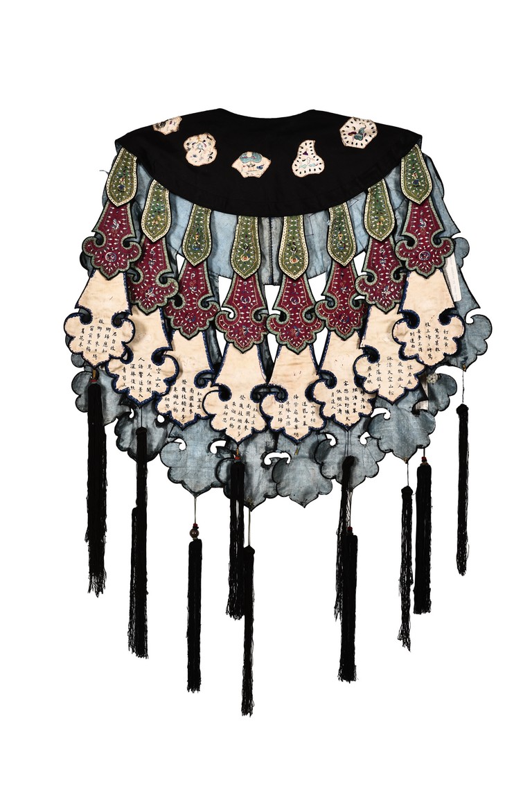 The collar is suspended with a three-sectioned embroidered tiers in silk green, red, and ivory tone, with the upper two sections decorated with floral motifs and lower section finely stitched with classical Chinese poems in Chinese characters, some with English translation on the back, the ends further attached with silk tassels. Qing Dynasty period.