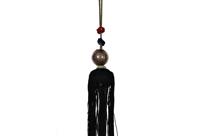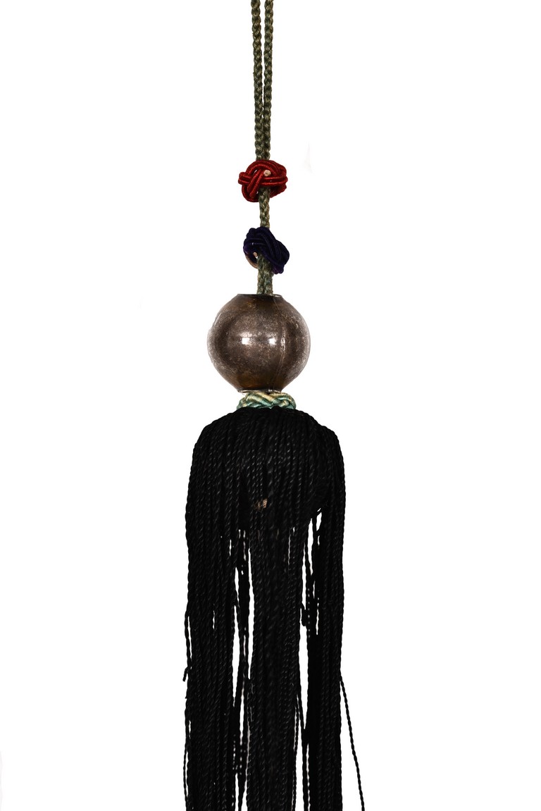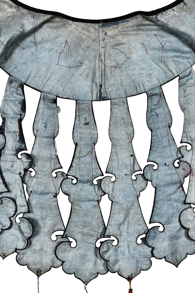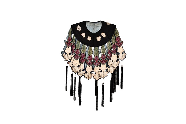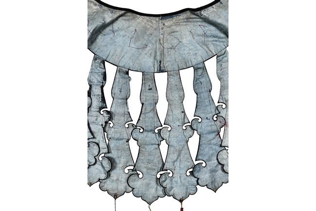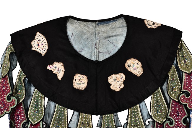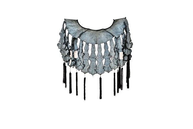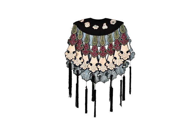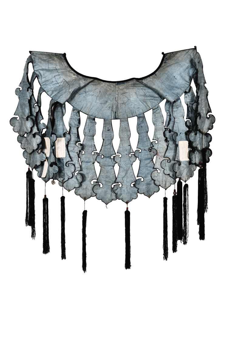 The collar is suspended with a three-sectioned embroidered tiers in silk green, red, and ivory tone, with the upper two sections decorated with floral motifs and lower section finely stitched with classical Chinese poems in Chinese characters, some with English translation on the back, the ends further attached with silk tassels. Qing Dynasty period.
