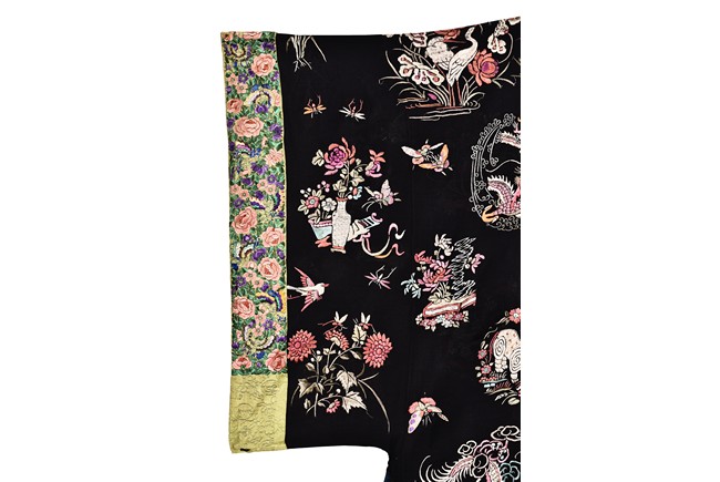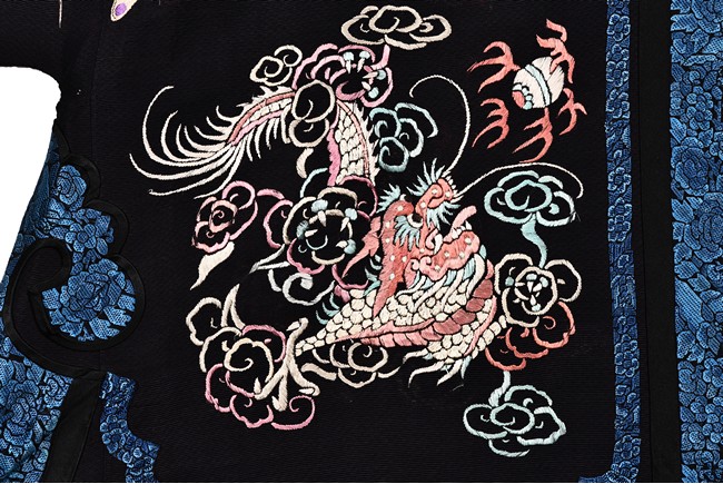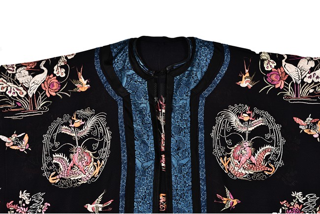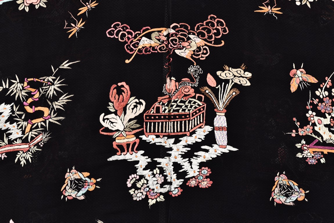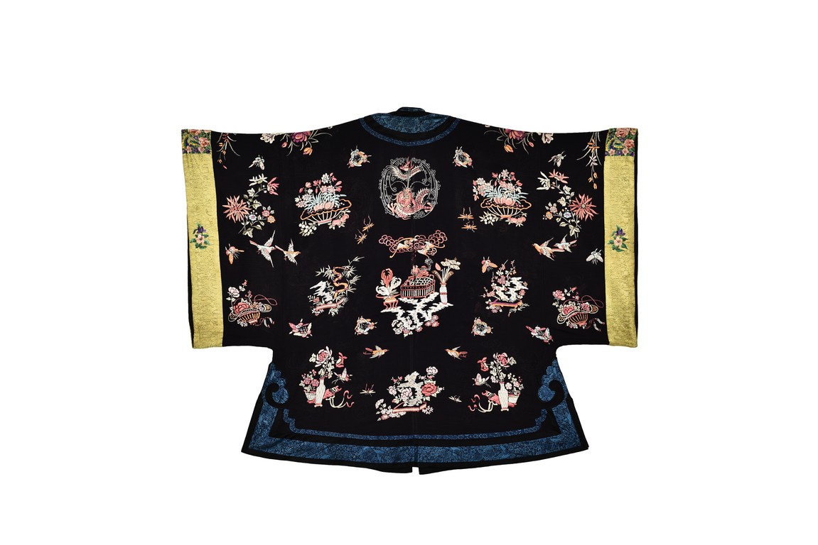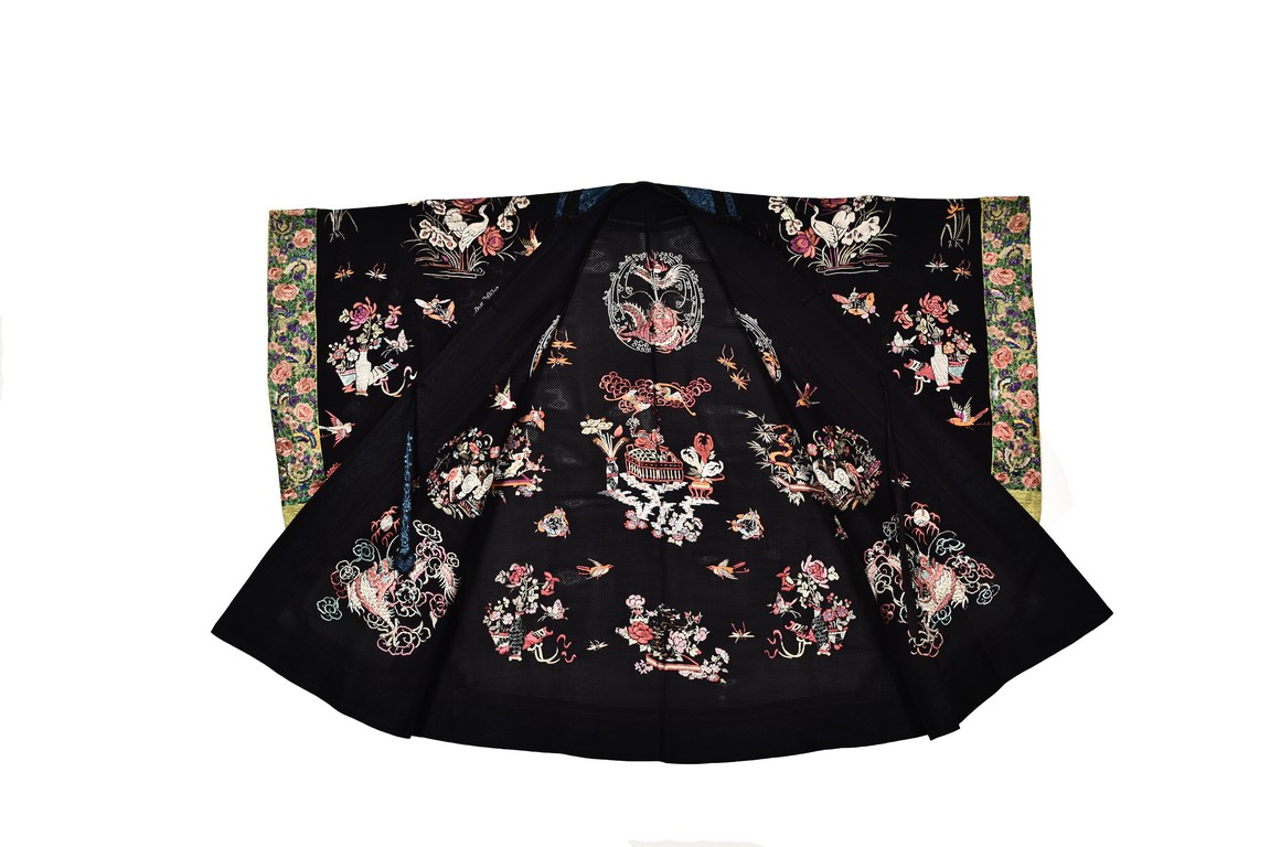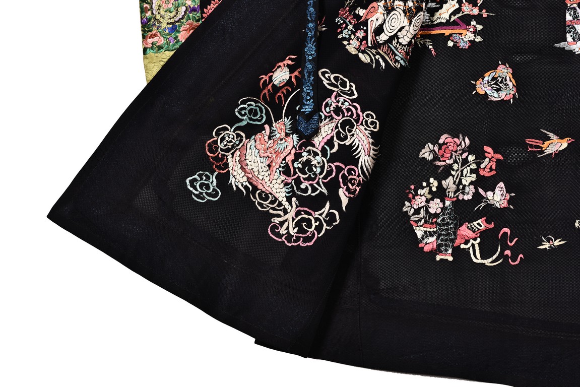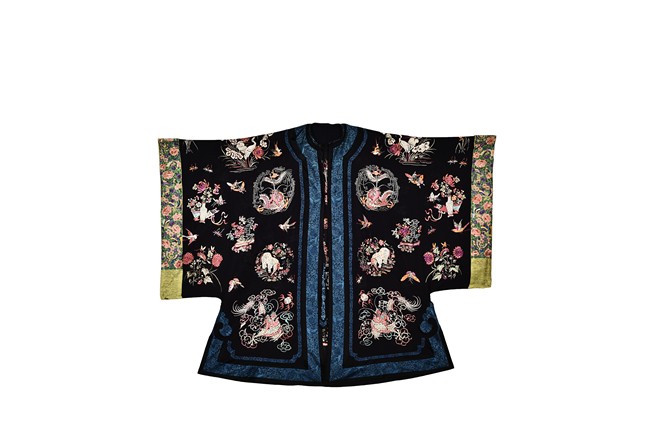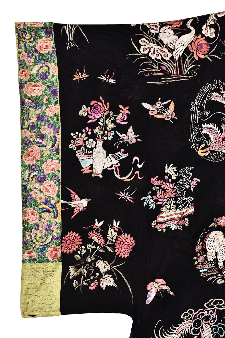 The robe is finely embroidered with roundels of auspicious floral and animal motifs, including elephant, dragon, and crane, and interspersed with butterflies and birds in flight. The sleeve bands densely decorated with leafy blossoms in pink, green, and purple against yellow ground.Qing Dynasty period.