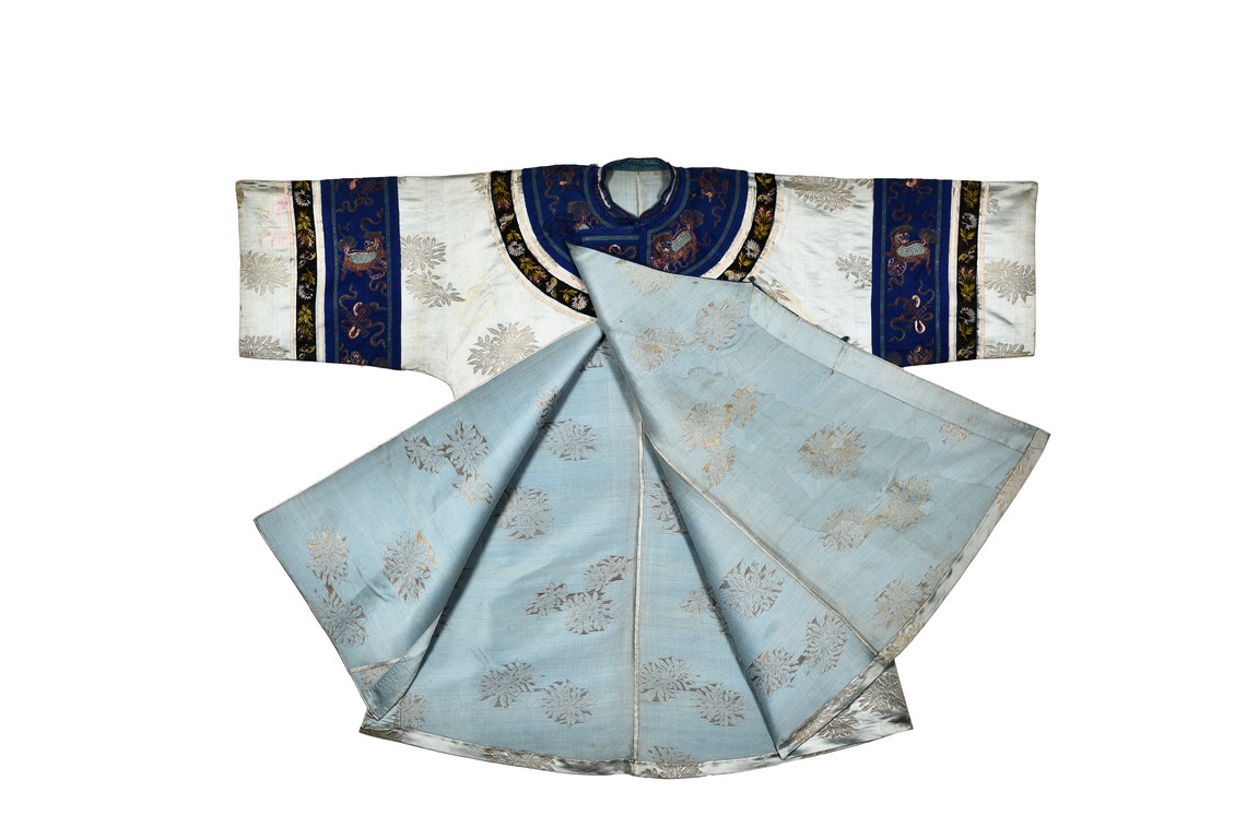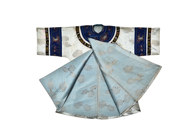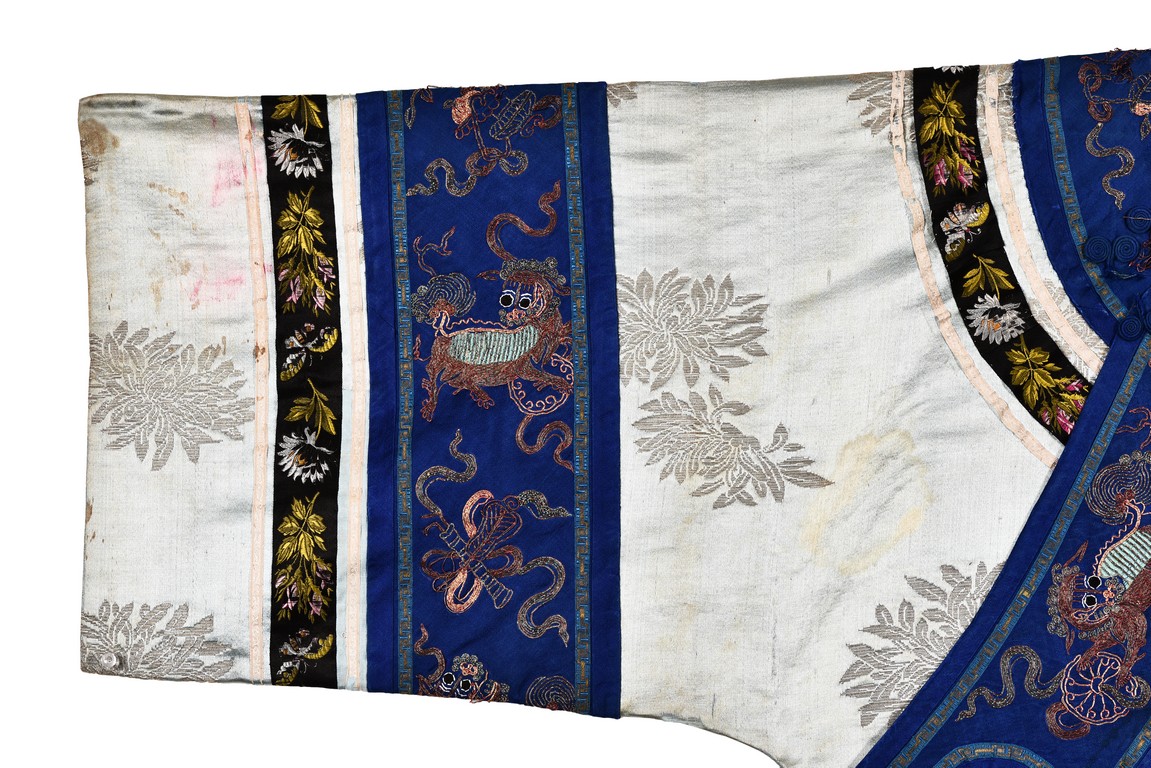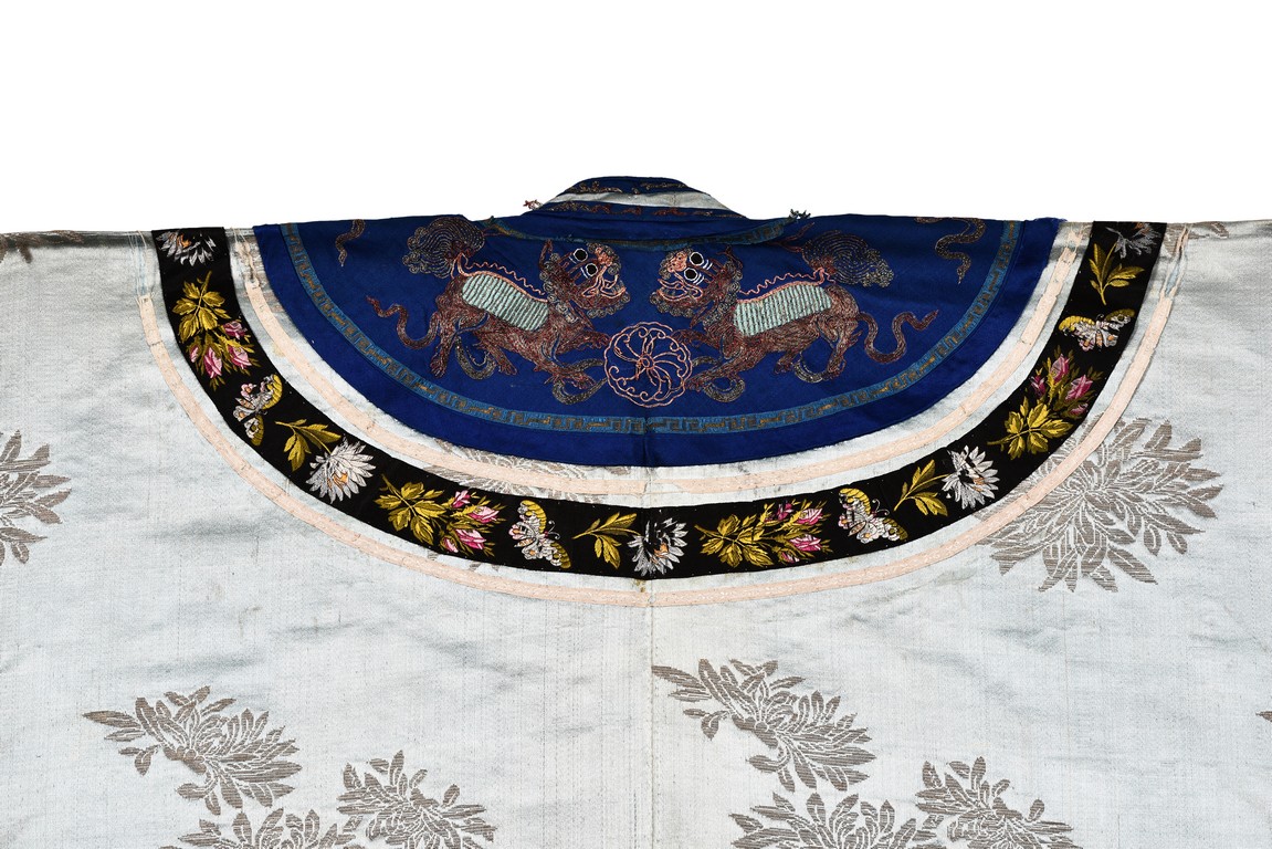 The robe is woven with peonies on a pale blue ground. The border and sleeve bands are couched in gold thread in designs of playful foo dogs as well as assorted auspicious symbols. Qing Dynasty period.