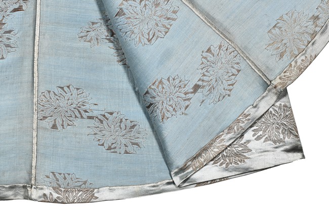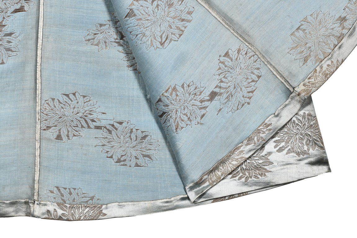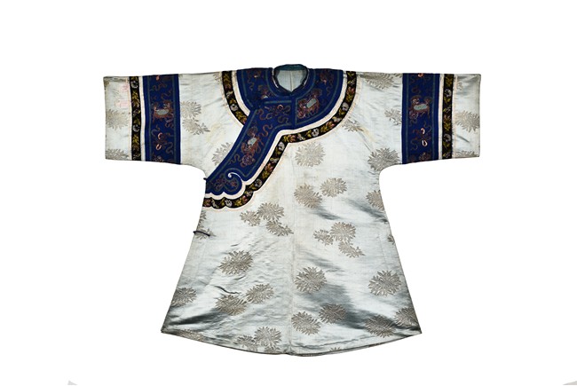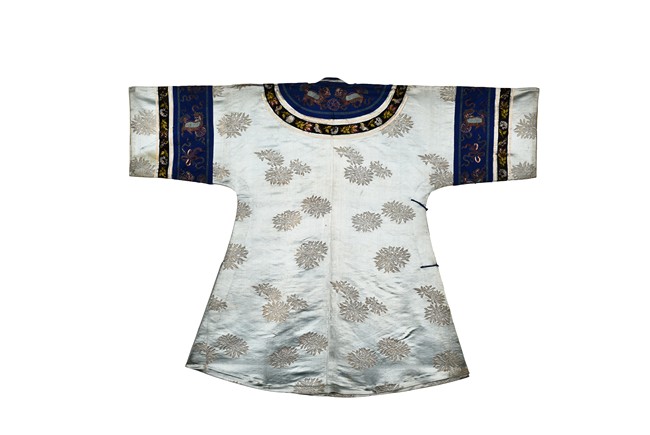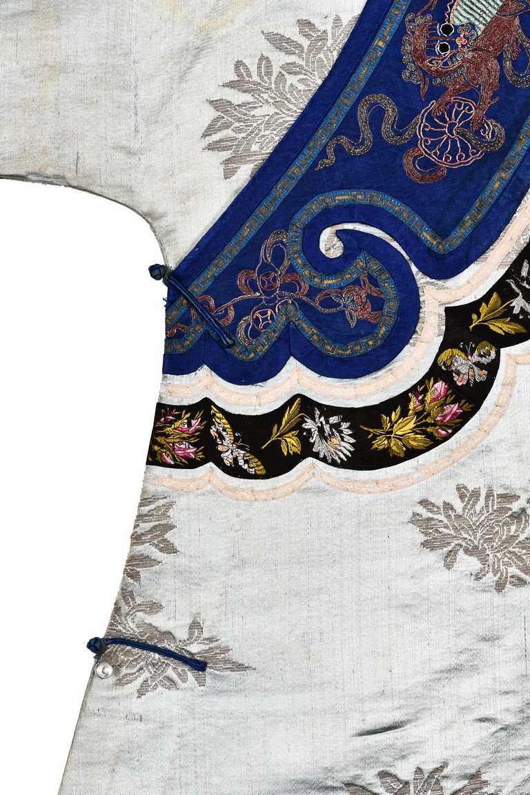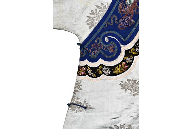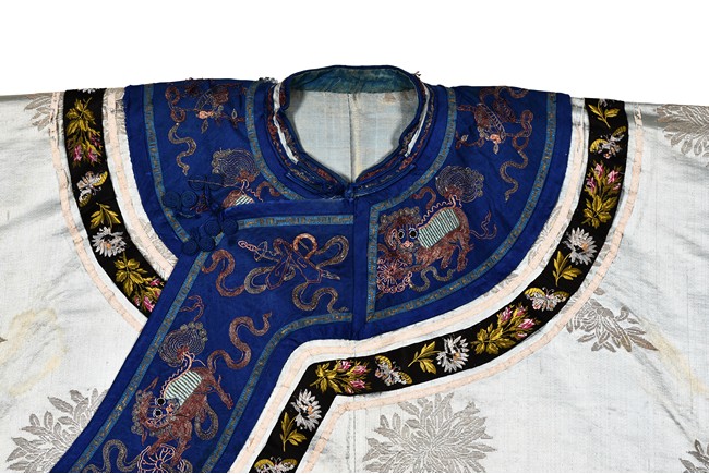 The robe is woven with peonies on a pale blue ground. The border and sleeve bands are couched in gold thread in designs of playful foo dogs as well as assorted auspicious symbols. Qing Dynasty period.