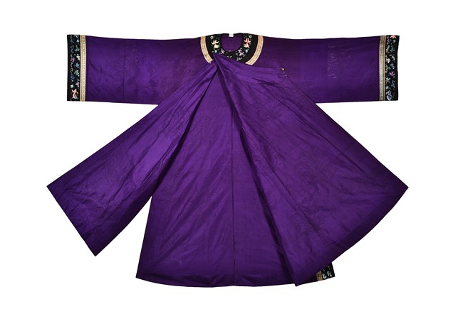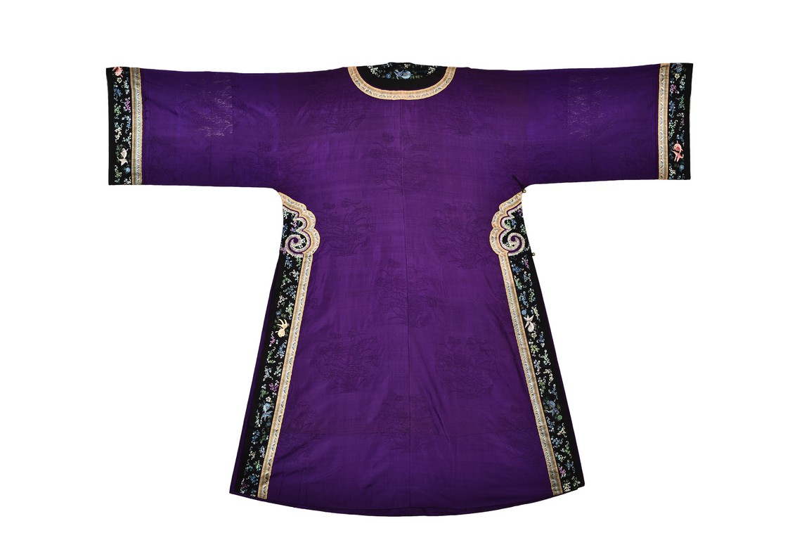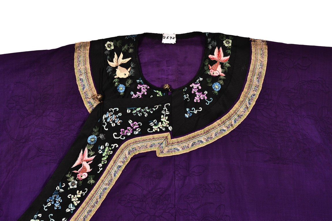 The robe is woven with motifs of lotus flower roundels on a purple ground, the collar, cuffs, and side borders are finely embroidered with various colored rare Chinese goldfish as well as assorted flowers on a black ground. Qing Dynasty period.