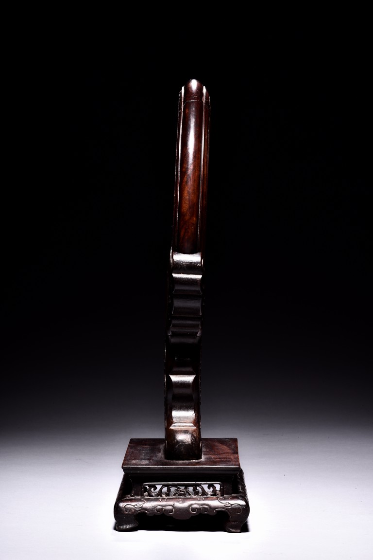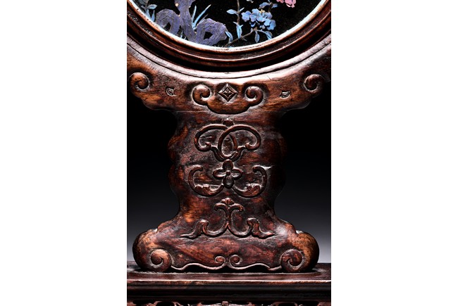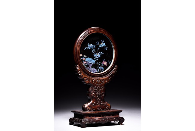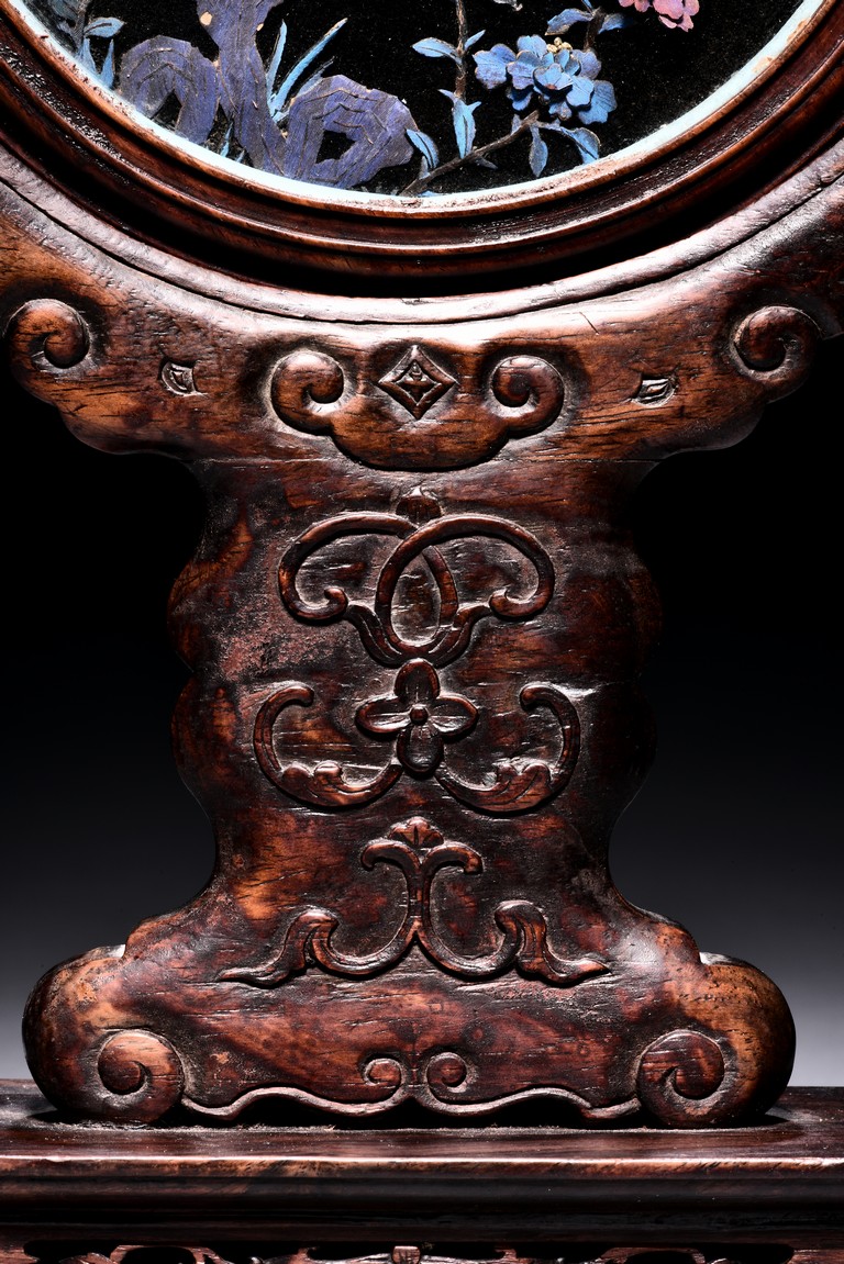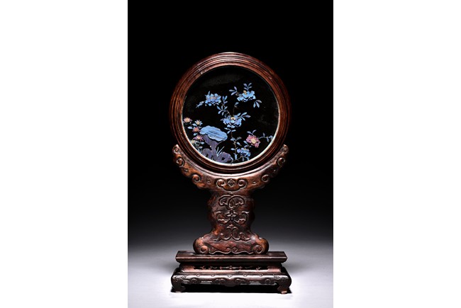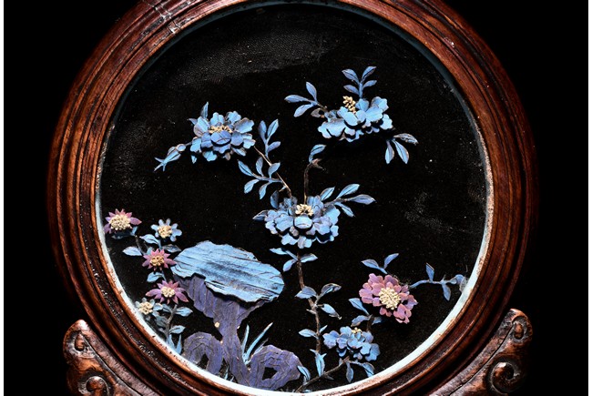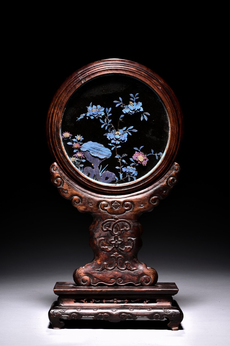 The small circular screen is decorated with flowering branches issuing from rocks, all inlaid with kingfisher feather of various colors, supported on hardwood handle carved with raised ruyi pattern upon rectangular four feet stand. Qing Dynasty period.