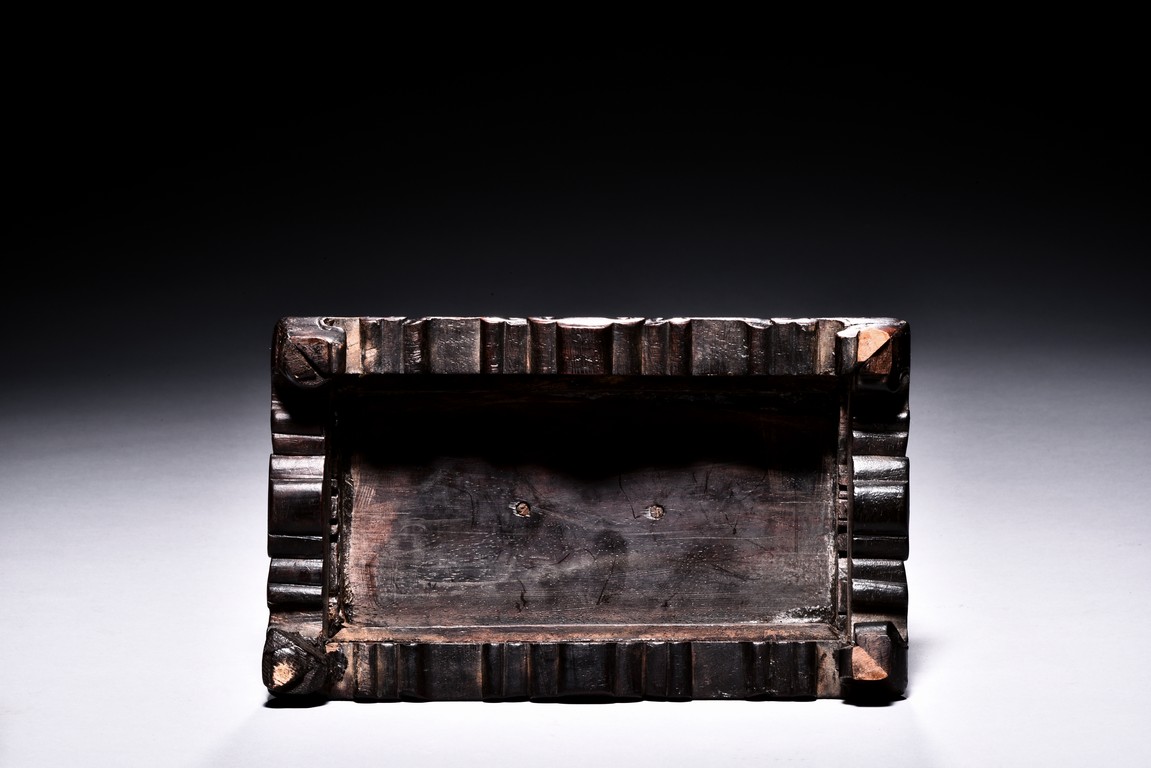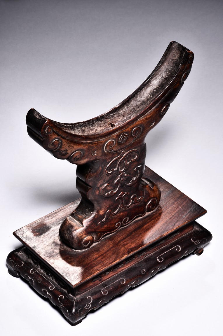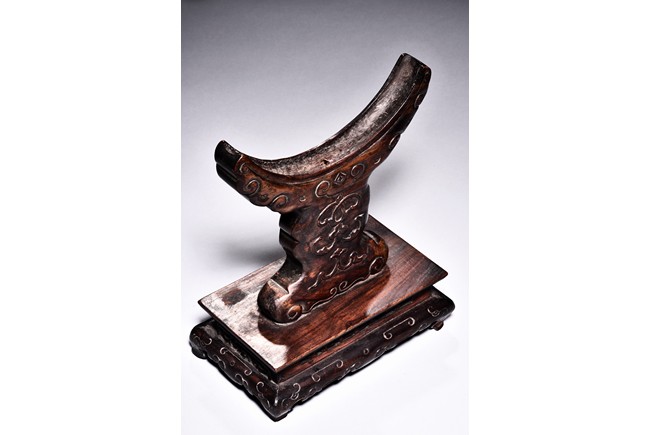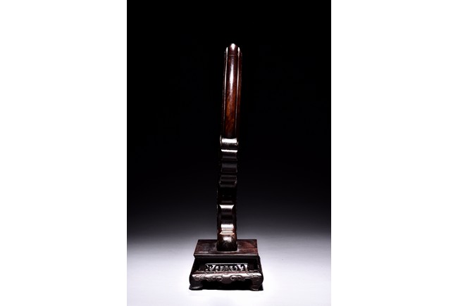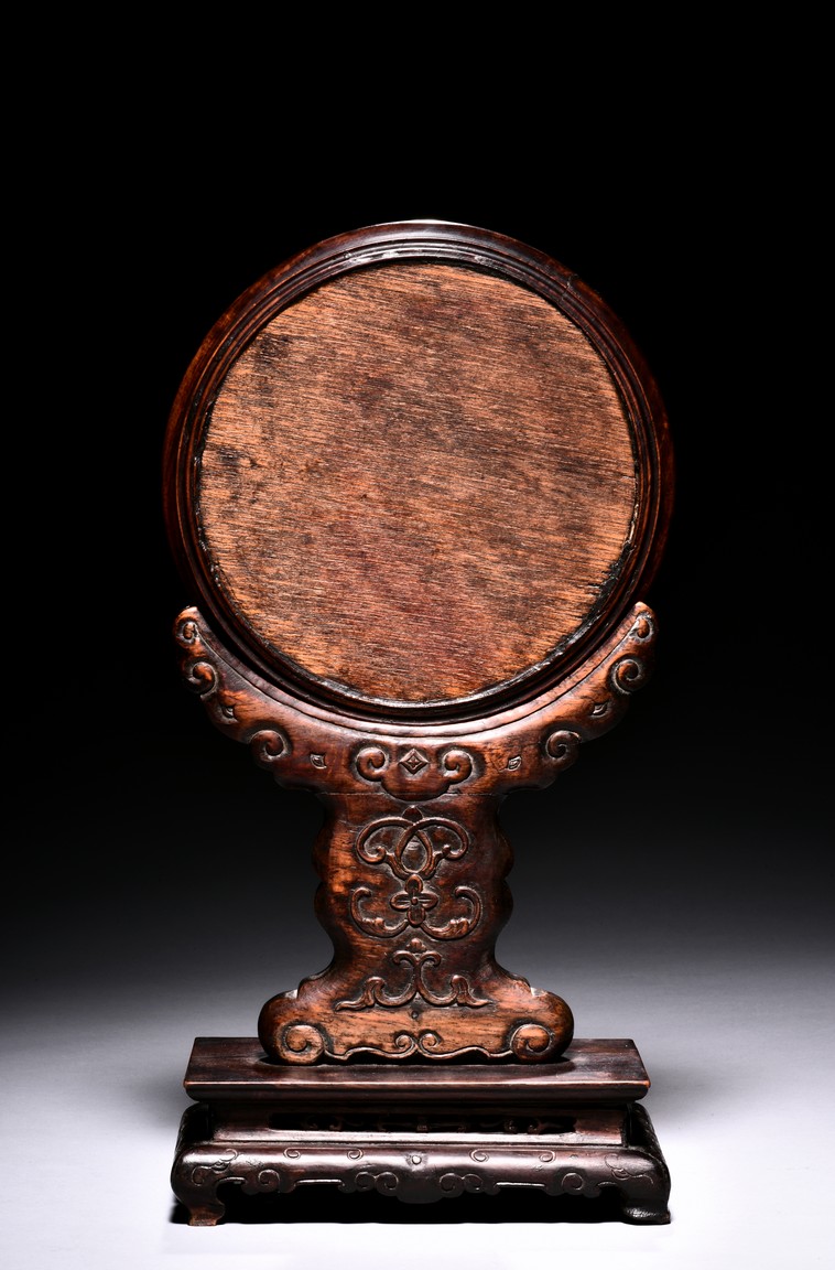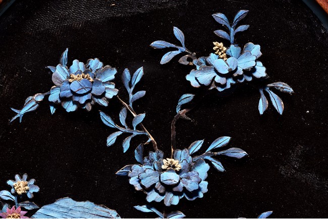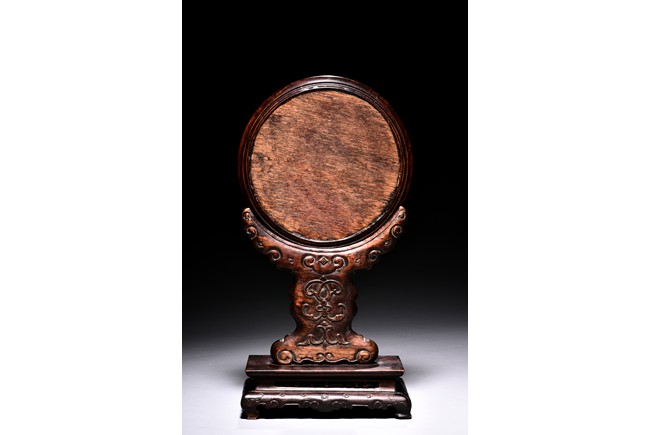 The small circular screen is decorated with flowering branches issuing from rocks, all inlaid with kingfisher feather of various colors, supported on hardwood handle carved with raised ruyi pattern upon rectangular four feet stand. Qing Dynasty period.