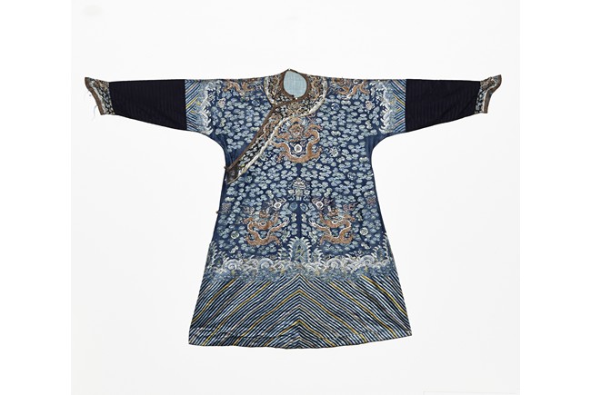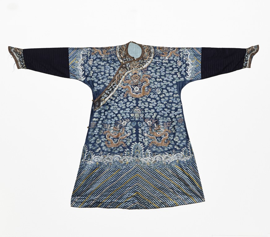 The blue robe is embroidered in shades of blue, gold, red, green, and white, depicting multiple flying five-clawed dragons chasing flaming spheres amidst stylized clouds, auspicious symbols, and above the lishui pattern at the bottom of the robe, the cuffs stitched with similar designs. 19/20th Century