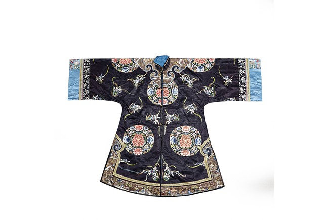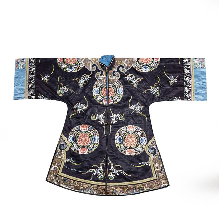 Embroidered with three roundels centered with by a single peony flower surrounded by further flowers, interspersed with further orchids and flowers on dark blue ground, the sleeve bands with floral sprays. 19/20th Century