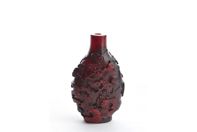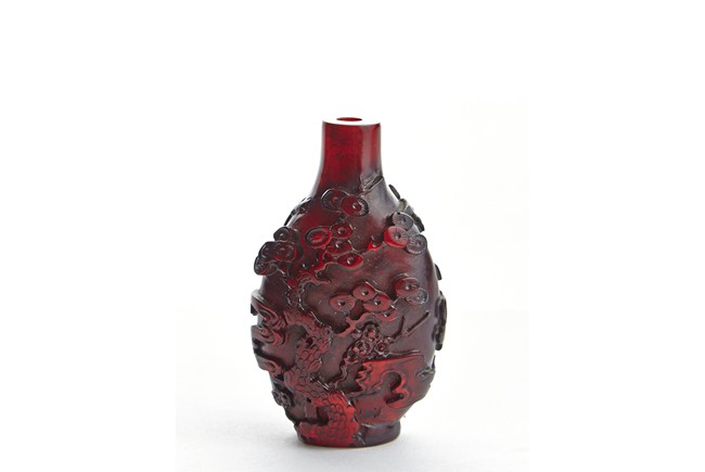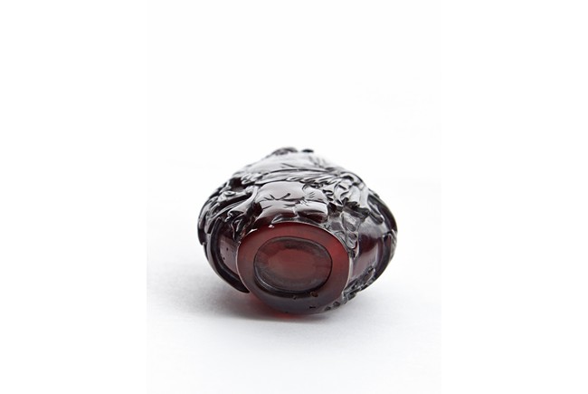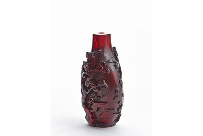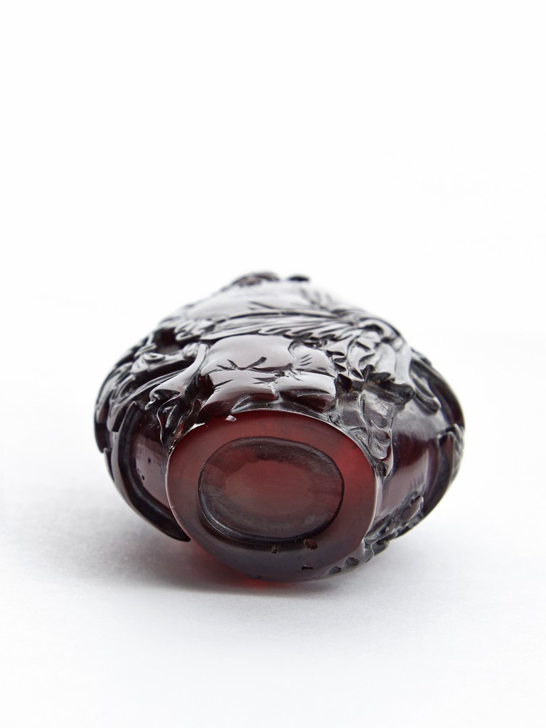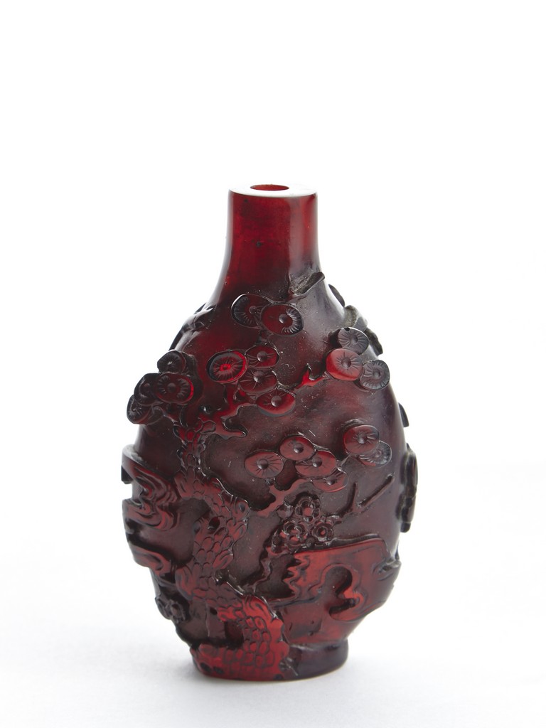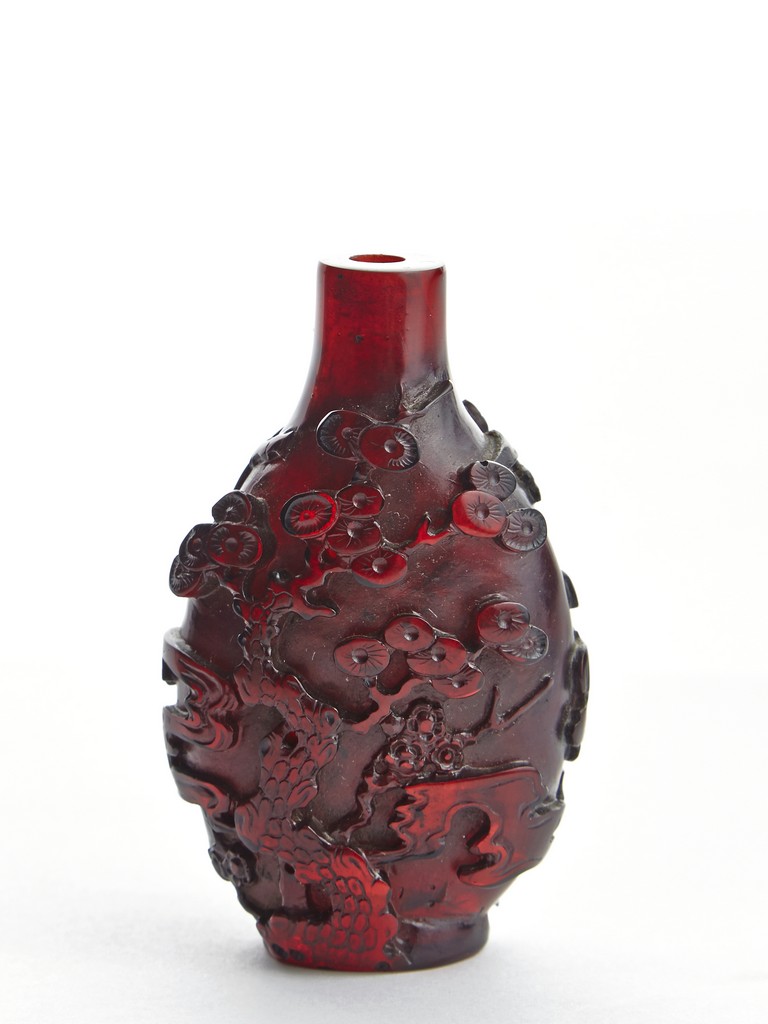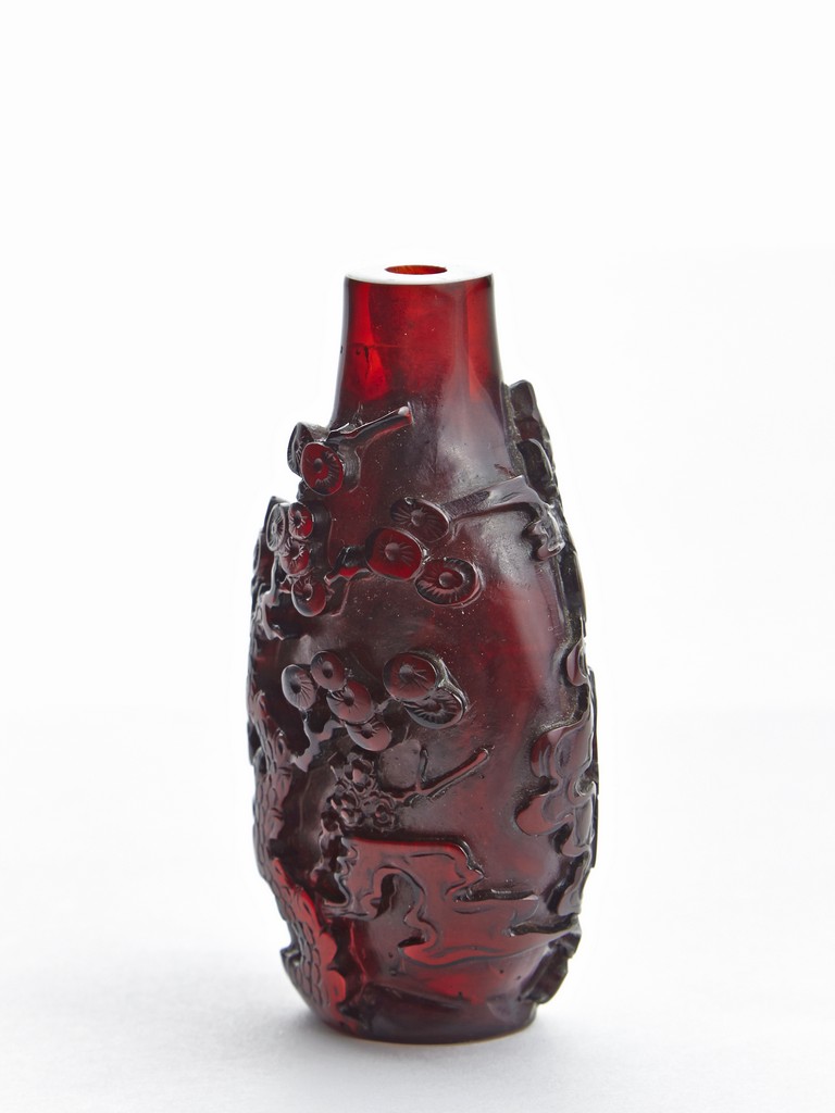The snuff bottle is vividly carved in relief to one side with Zhong Kui catching a ghost with a girl behind him, the reverse with a garden scene of gnarled pine tree and rockwork. Qing Dynasty period.