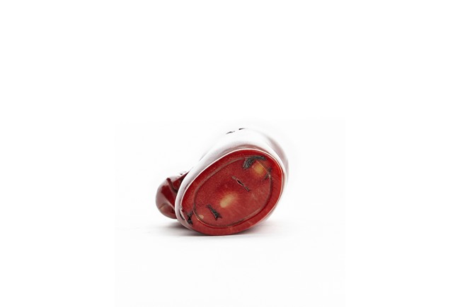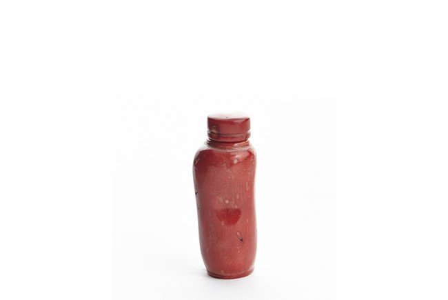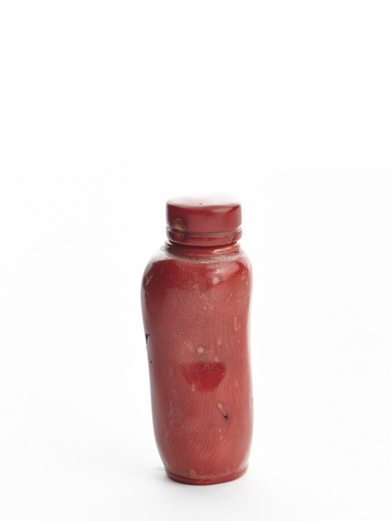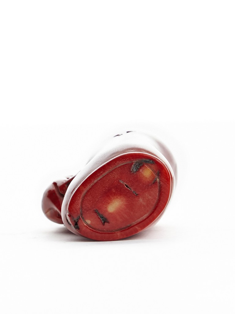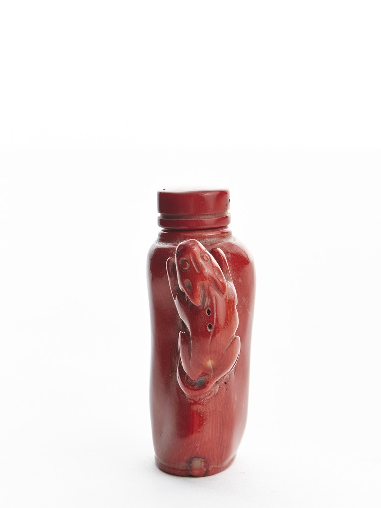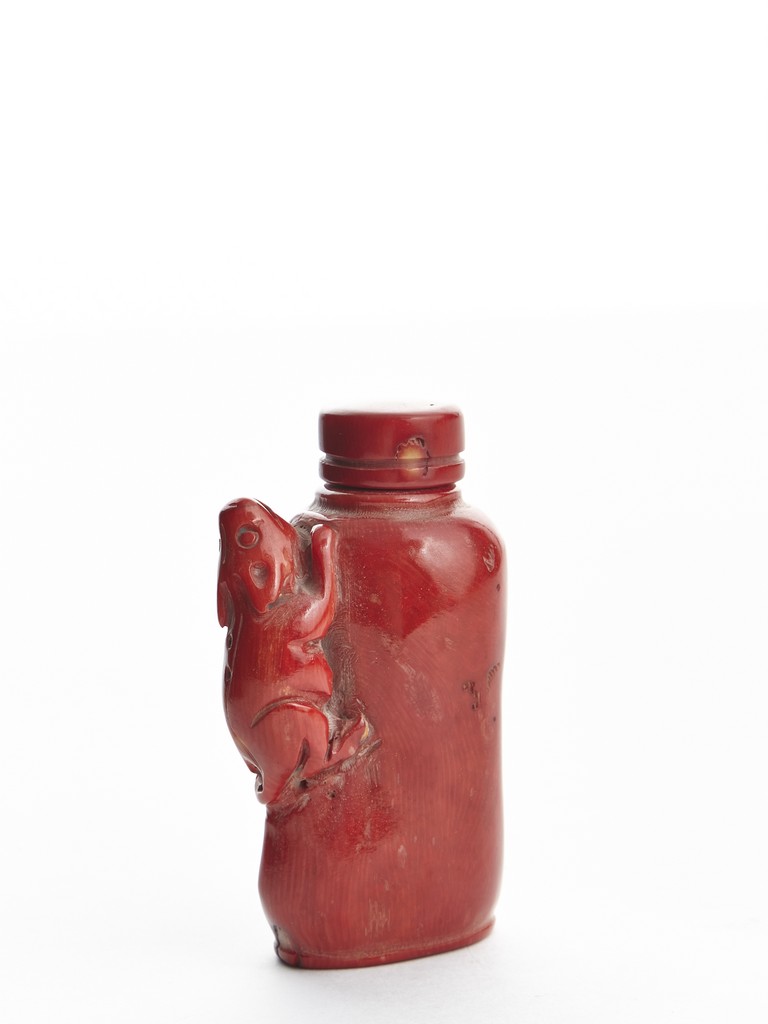 Of irregular rectangular form, the snuff bottle is carved with a squirrel in relief to the side, fitted with a circular stopper, the stone is of even deep red tone, all carved out of single coral. Qing Dynasty period.