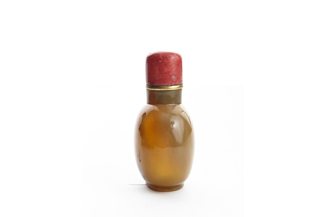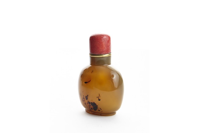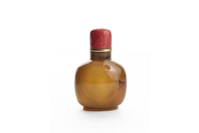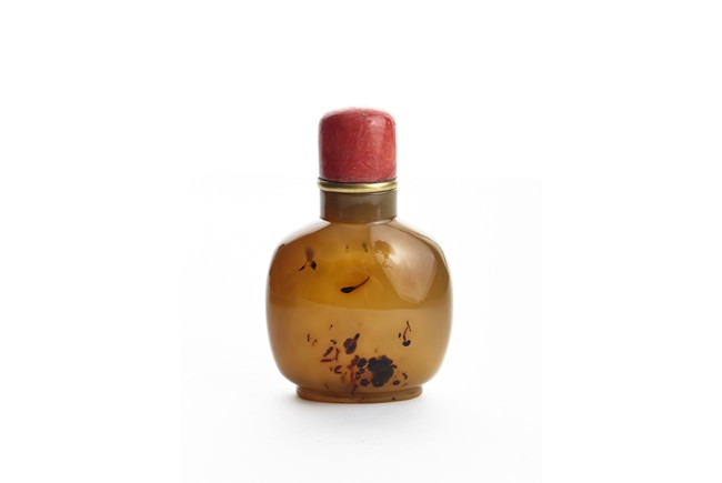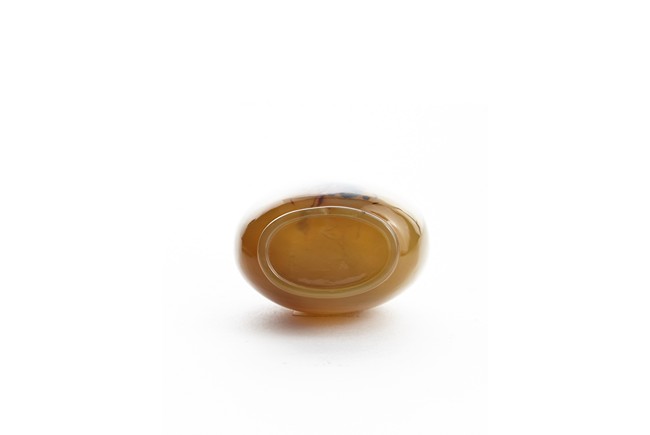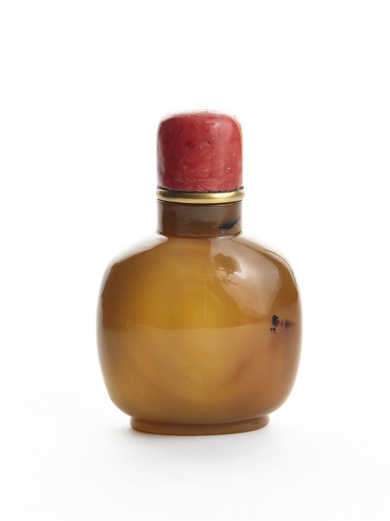 Of rounded square form, straight neck, subtly recessed rim, rounded oval foot ring, the stone is of translucent caramel tone with dark brown inclusions. Qing Dynasty period.