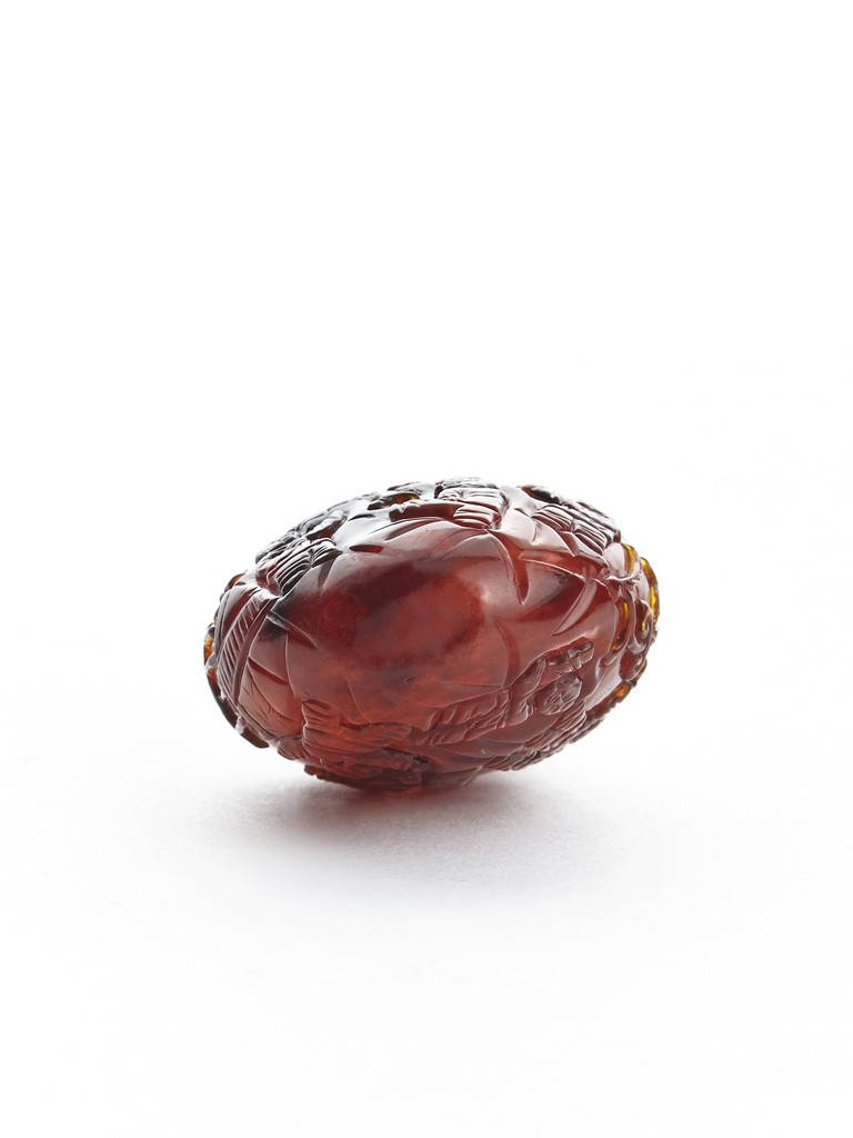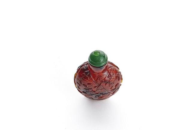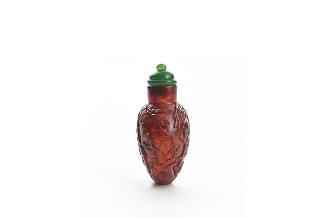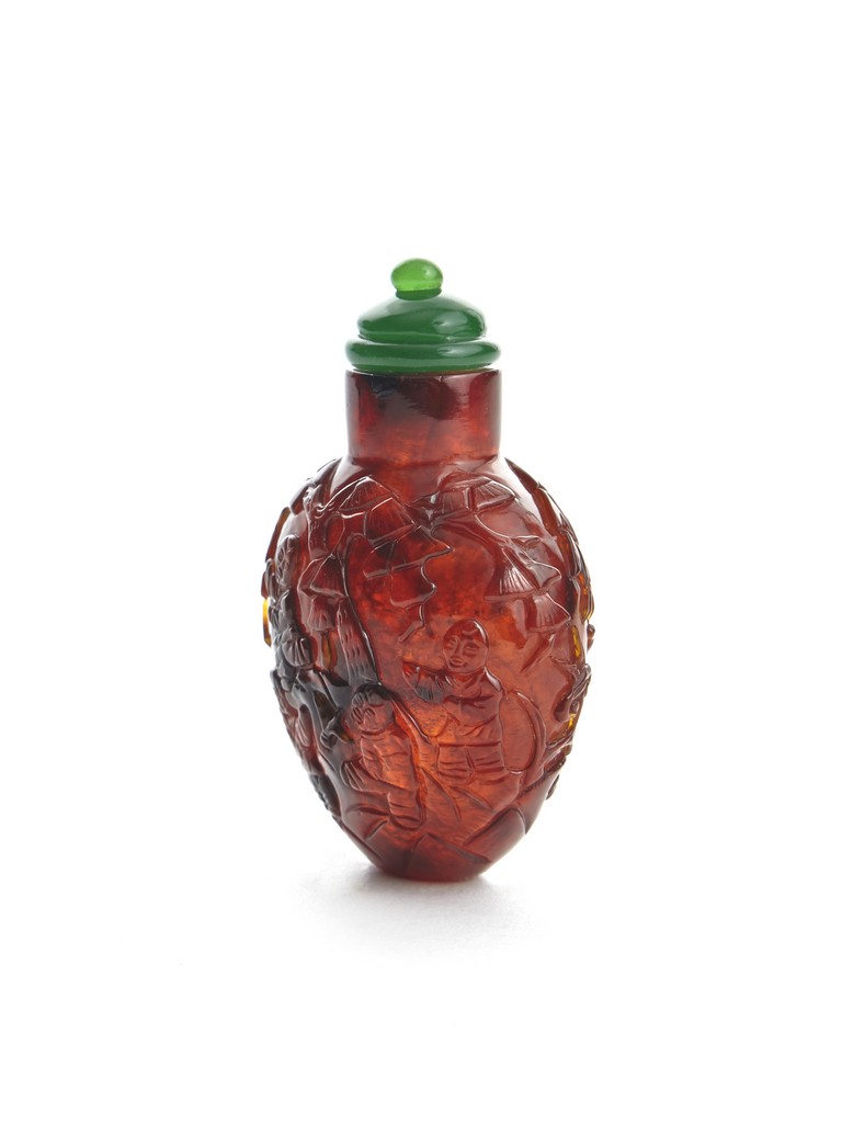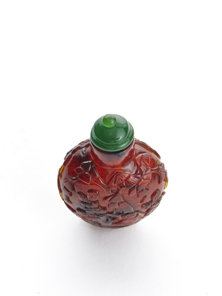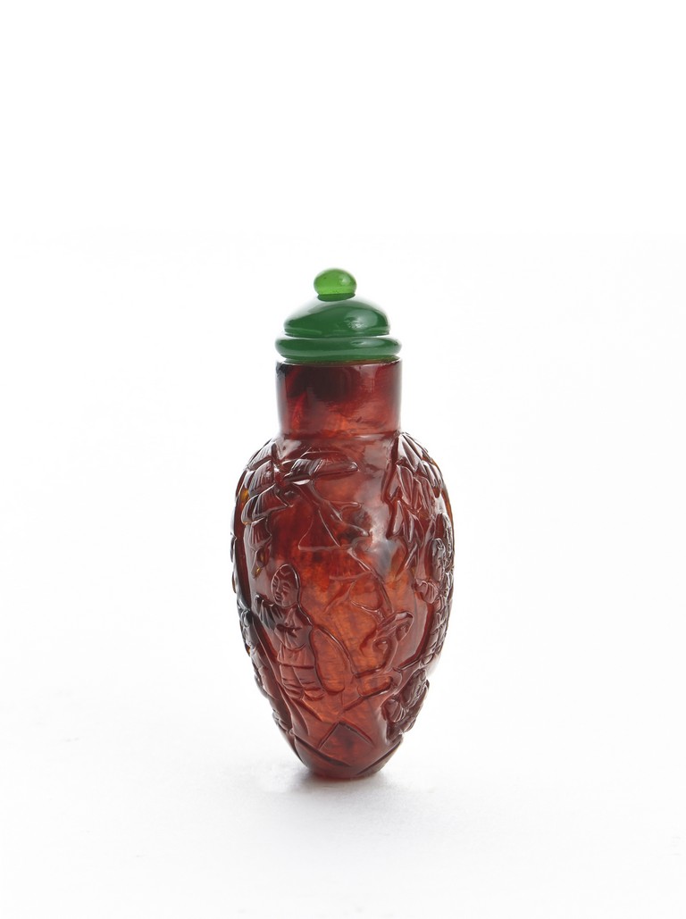 Of ovoid form rising to a straight cylindrical neck, the snuff bottle carved in shallow relief depicting boys playing at outdoor garden setting with pines, of high translucency. Qing Dynasty period.