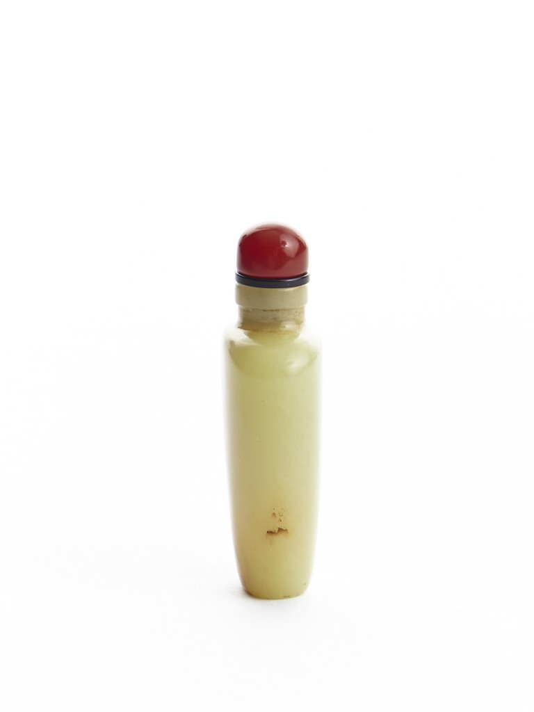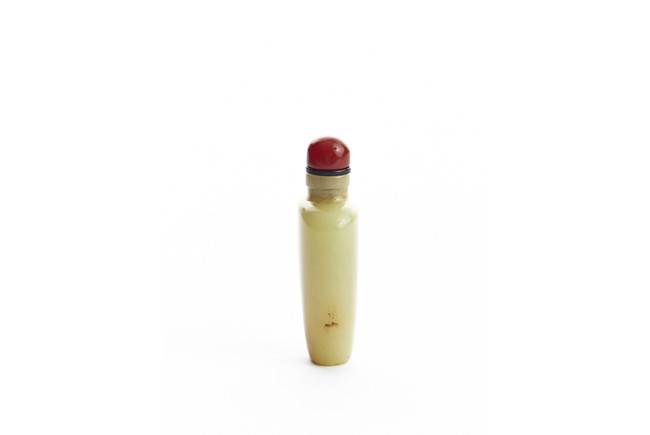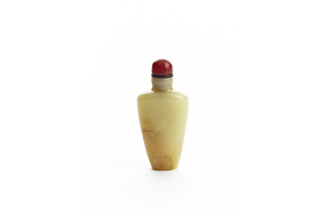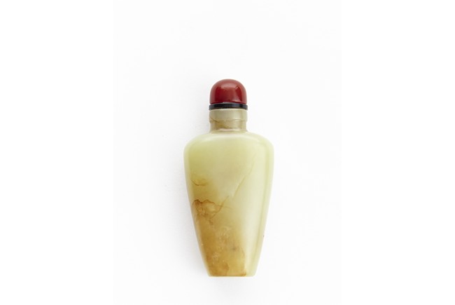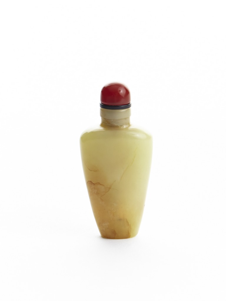 Of elongated form, the snuff bottle is of plain design, the stone is of translucent yellow tone with russet veins and markings. Qing Dynasty period.