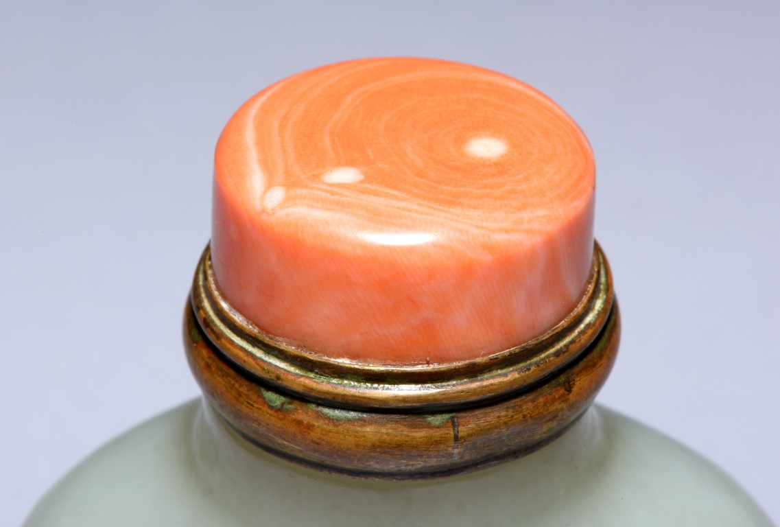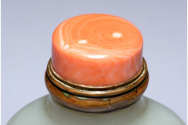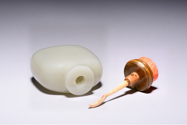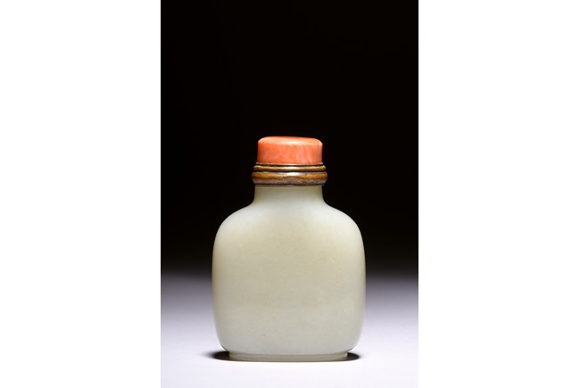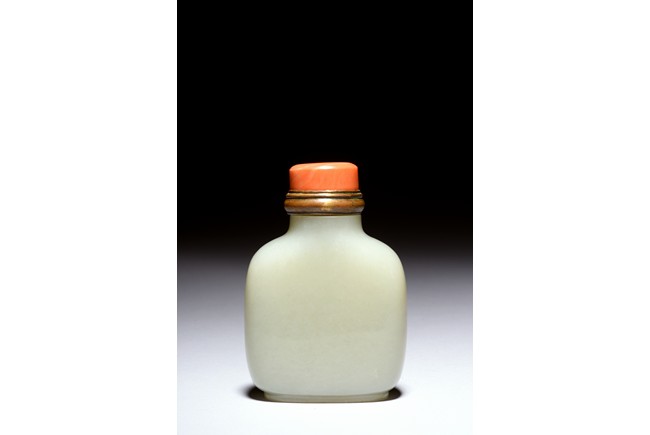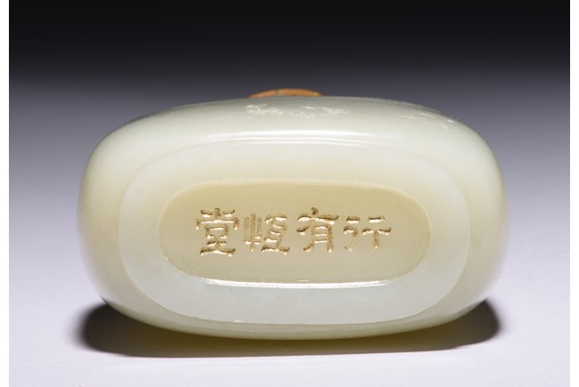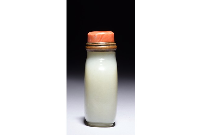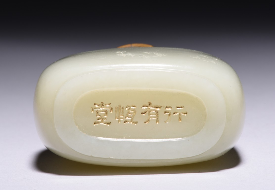 Of rounded rectangular form, straight neck, oval foot ring, coral stopper, the snuff bottle is of plain design, the base carved with four character 'XING YOU HENG TANG' mark. Qing Dynaty period.