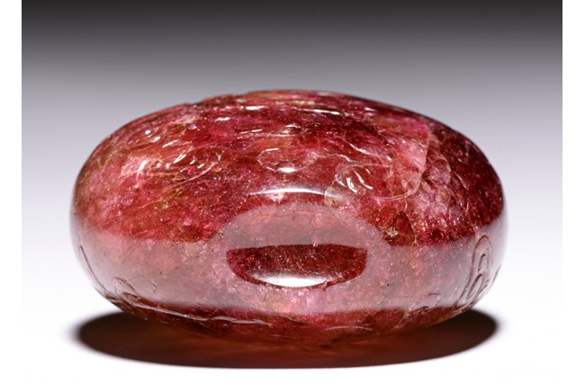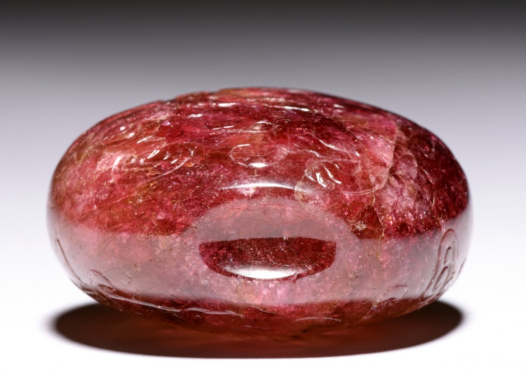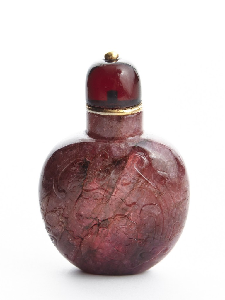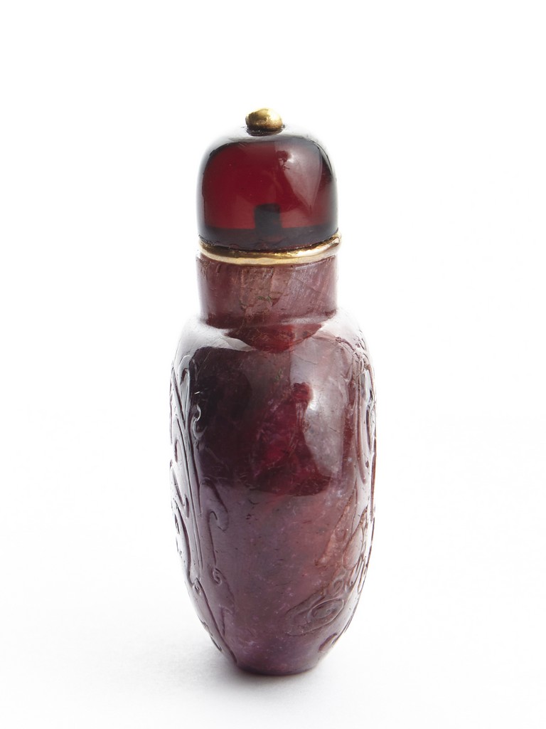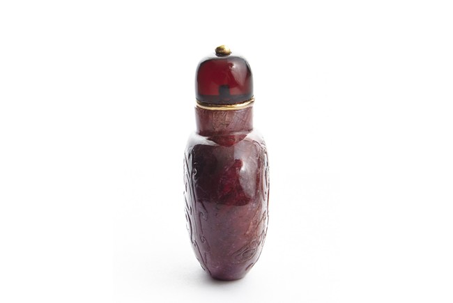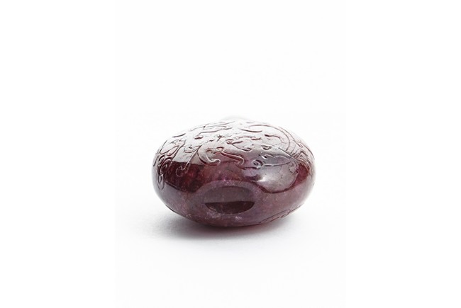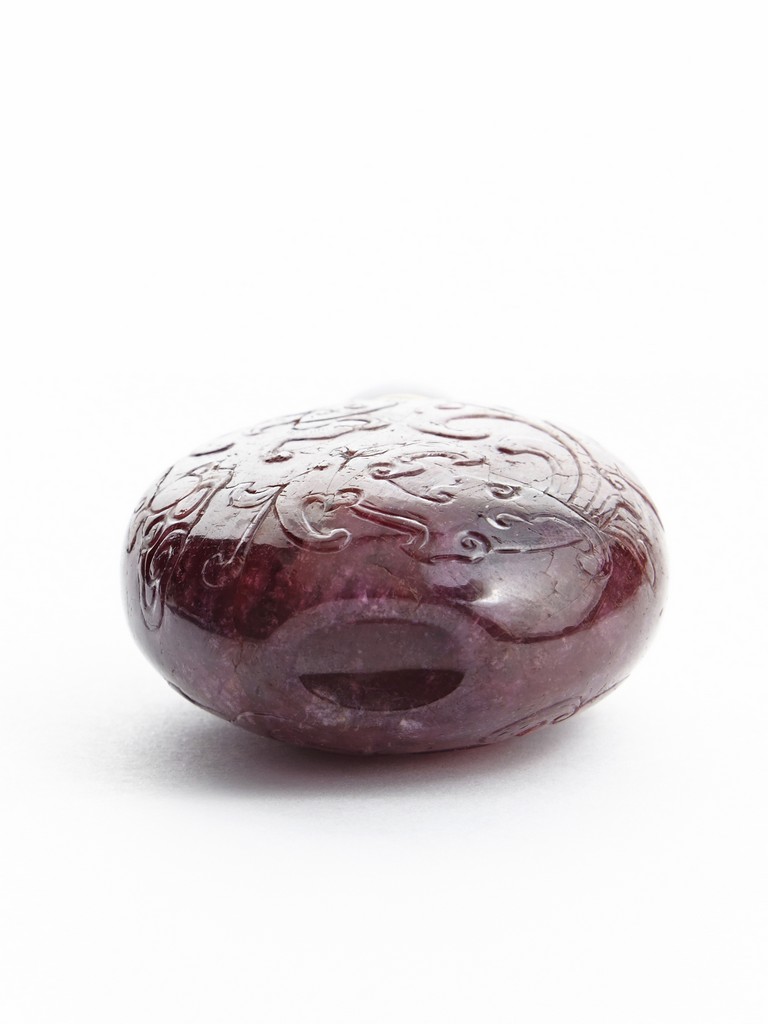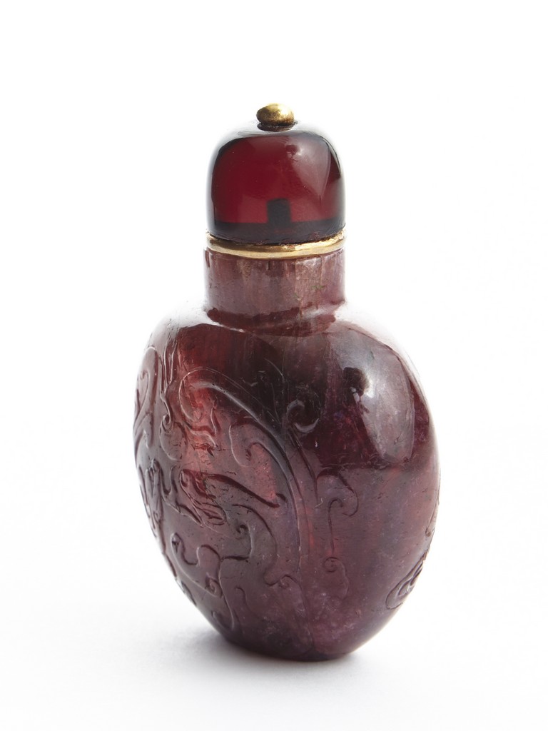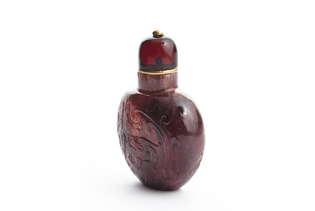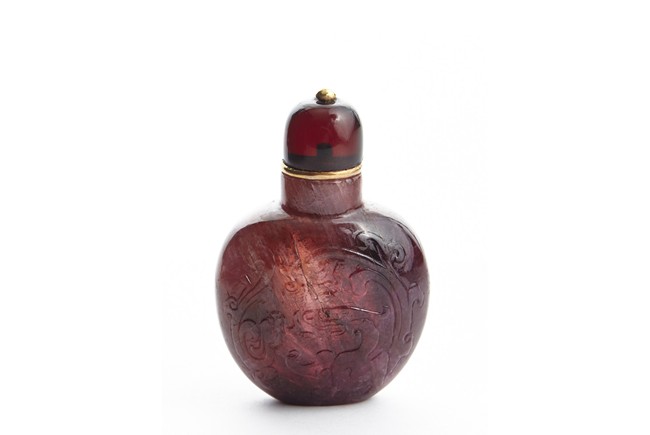 Of rounded form, the snuff bottle is carved with two chilong to front and reverse in shallow relief. Qing Dynasty period.