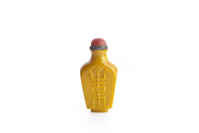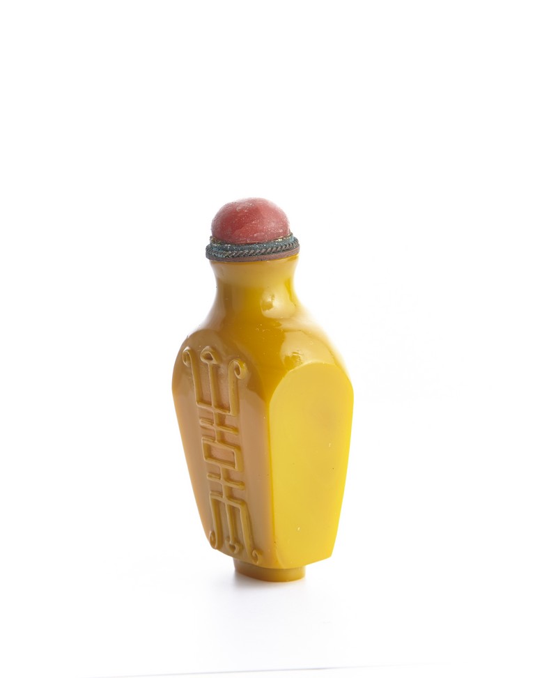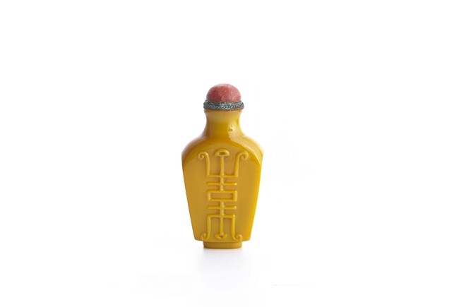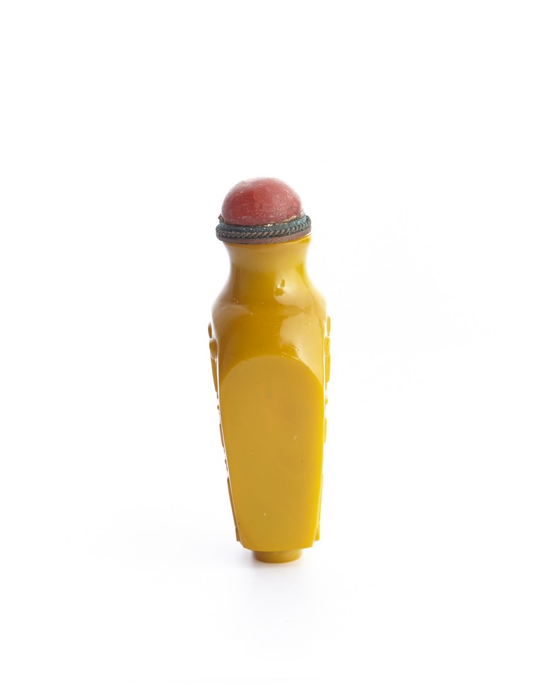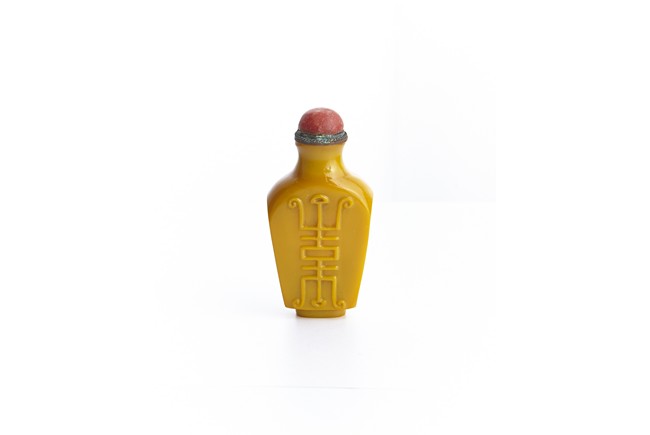 Raised on short foot, the bottle is carved with a stylized shou character on both sides of the body. The glass is of ochreish yelow tone. Qing Dynasty period.