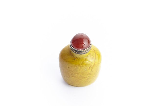 Of rounded rectangular form, the glass snuff bottle is of opaque swirls of yellow tone. Qing Dynasty period.