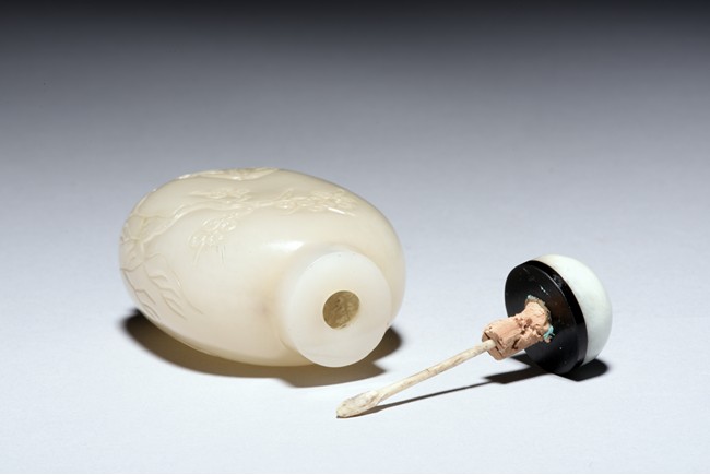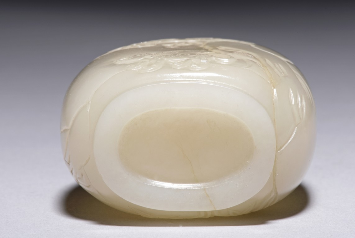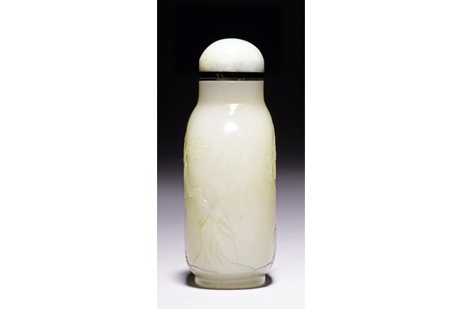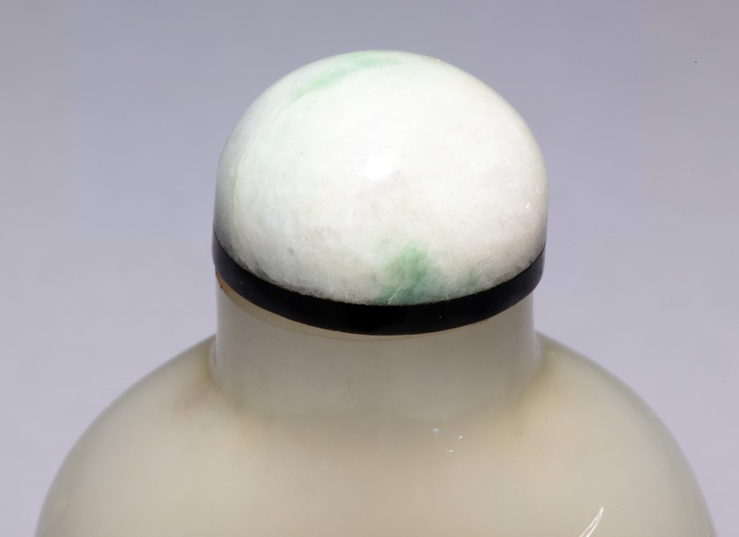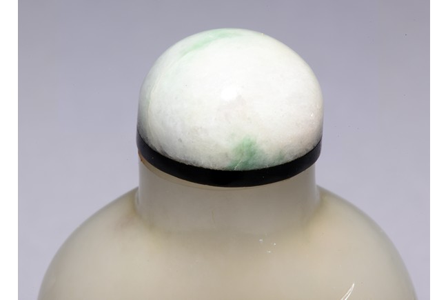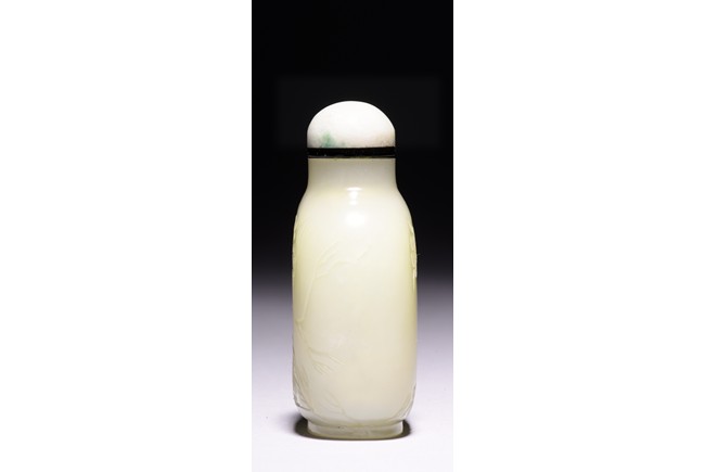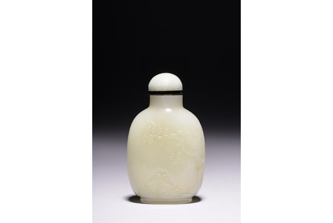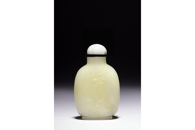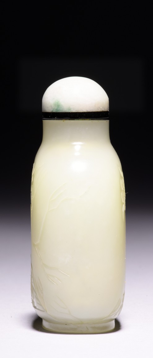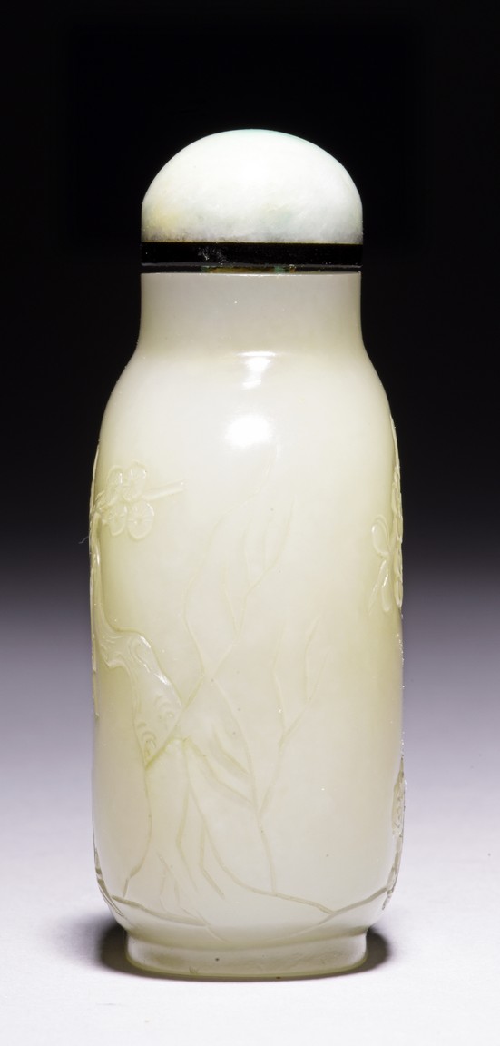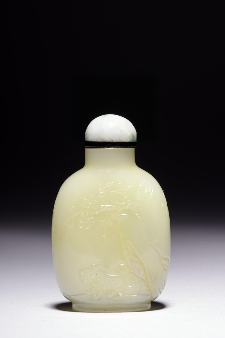 Of rounded rectangular form, the body carved in shallow relief with tiger beneath plum tree to the front, and bamboo to the reverse. The stone is of translucent even white tone. The stopper is of mottle green tone jadeite. Qing Dynasty period.