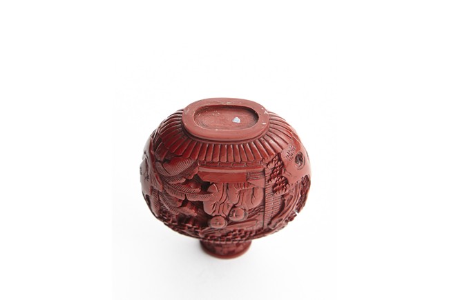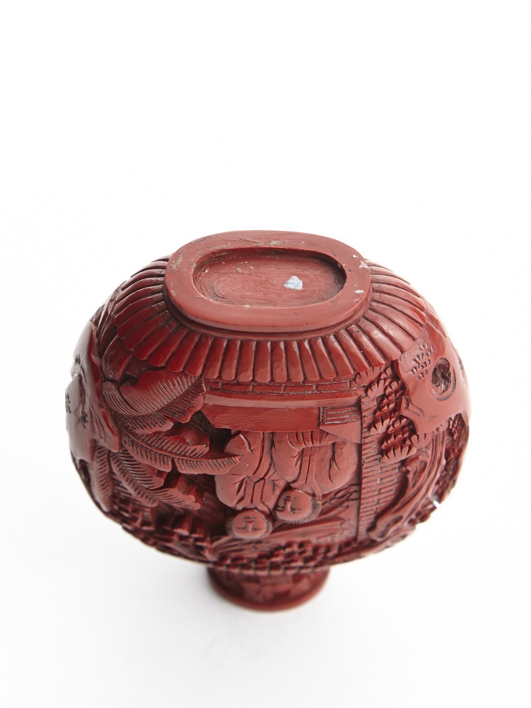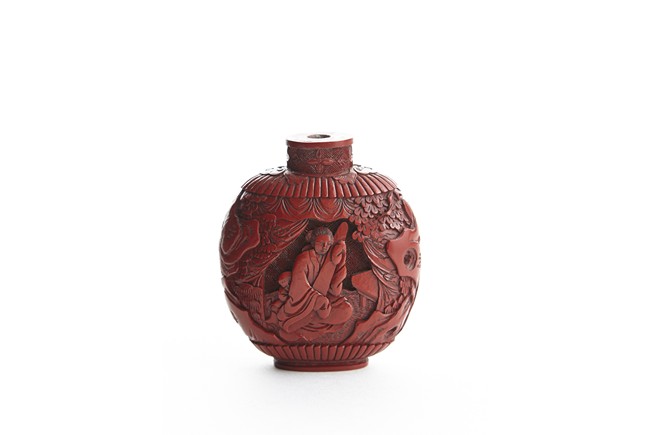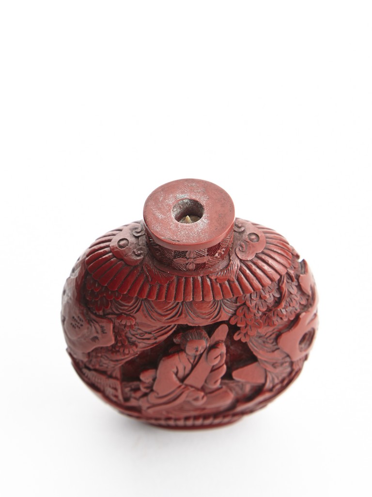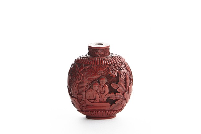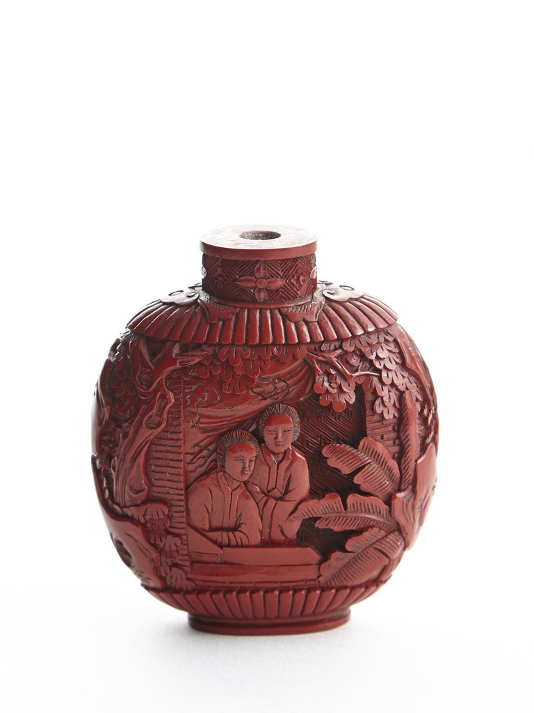 Of flattened round shape, the snuff bottle is deeply carved with two beauties behind a window to one side, the reverse with a boy hiding behind a beauty, the scenes separated by rockworks, wutong, and banana leaves. Qing Dynasty period.
