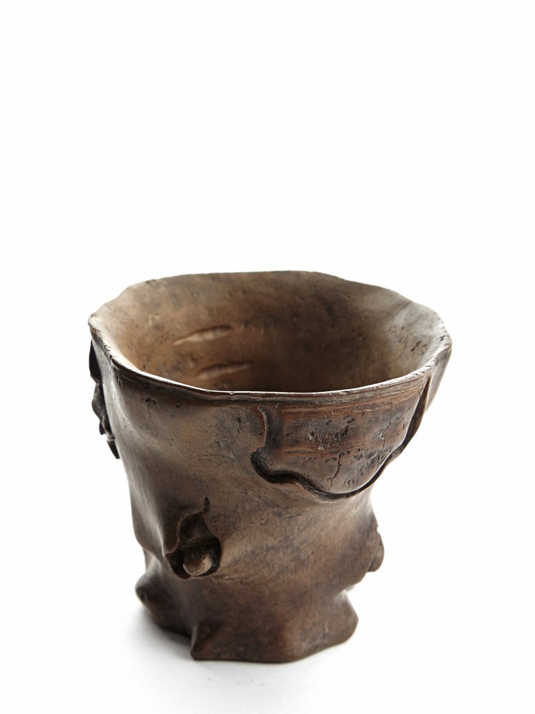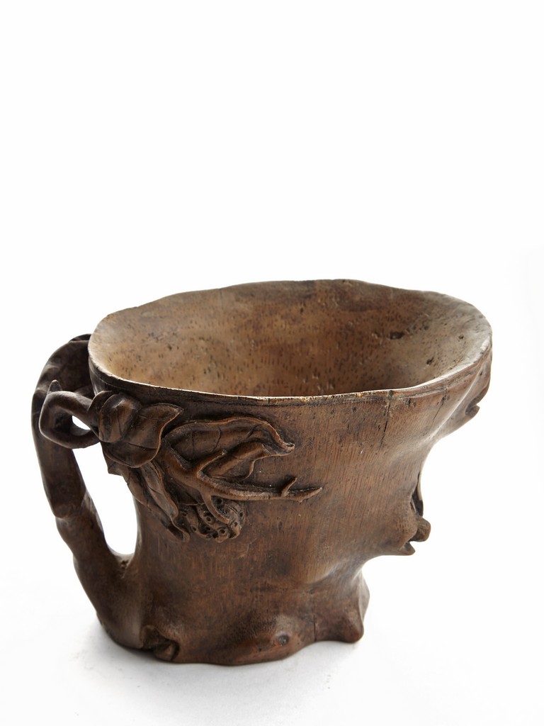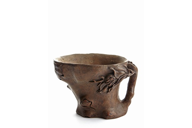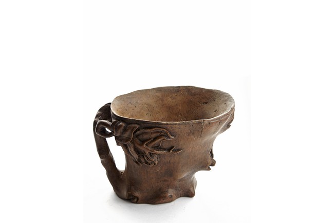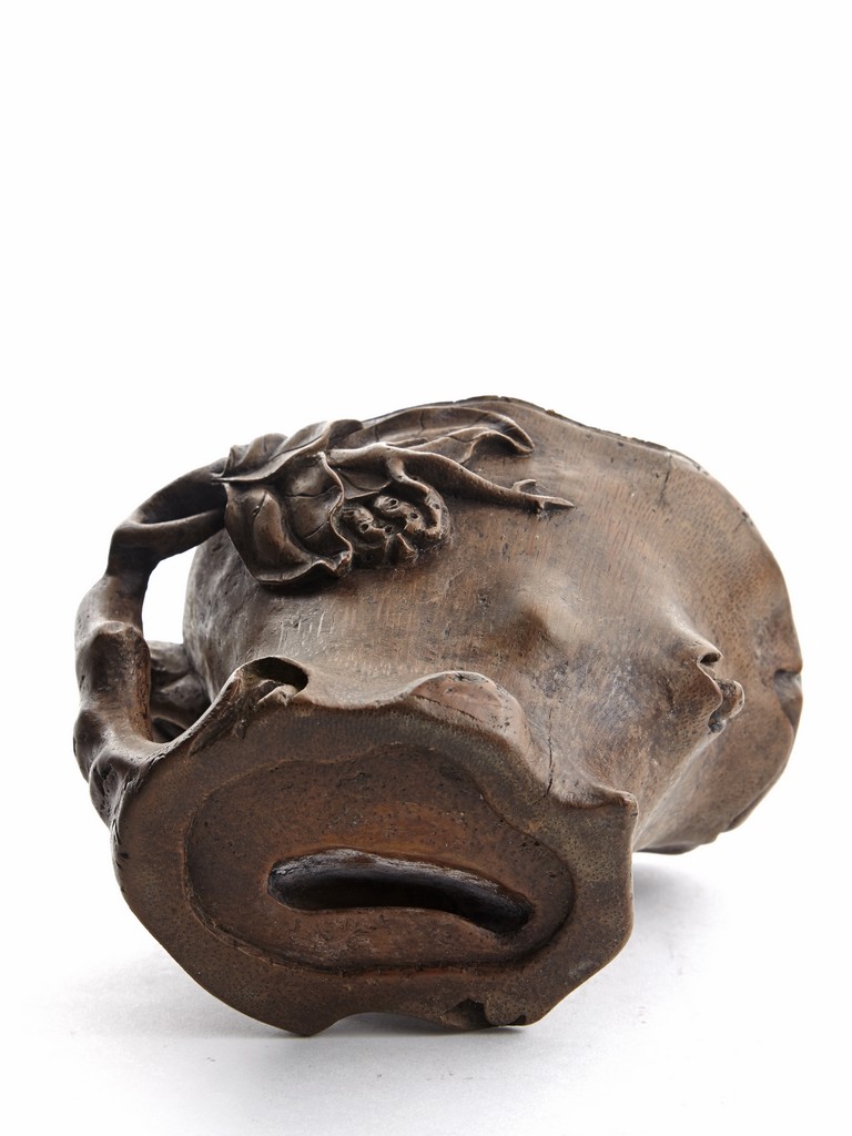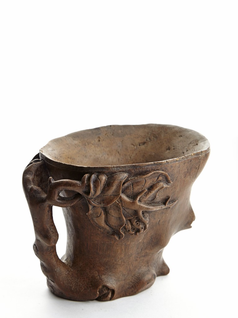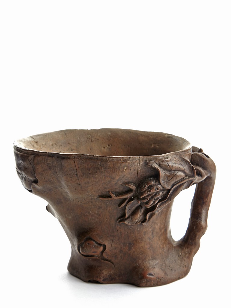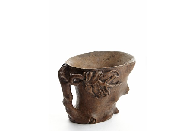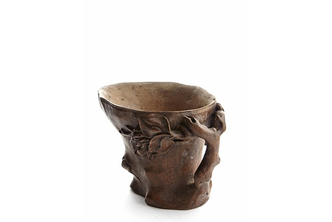 Carved in the form of rhinocerous libation cup, the bamboo cup is carved in relief to the side with leafy branches and Buddha's hand from a large gnarled stem. Qing Dynasty period.