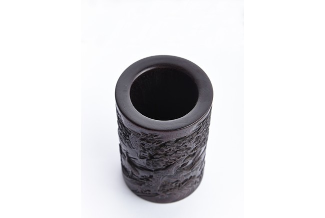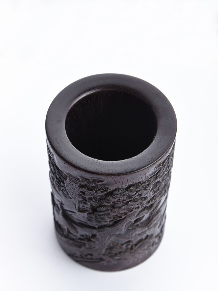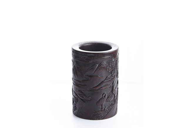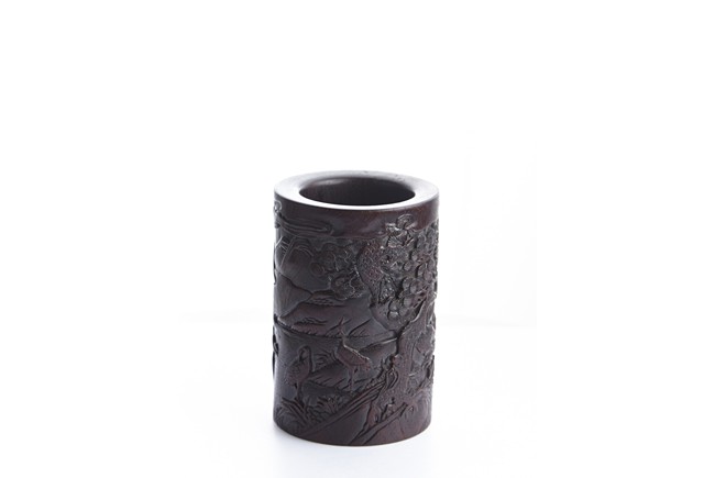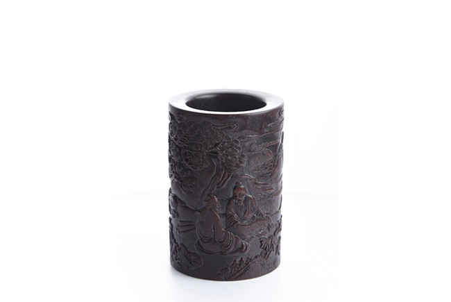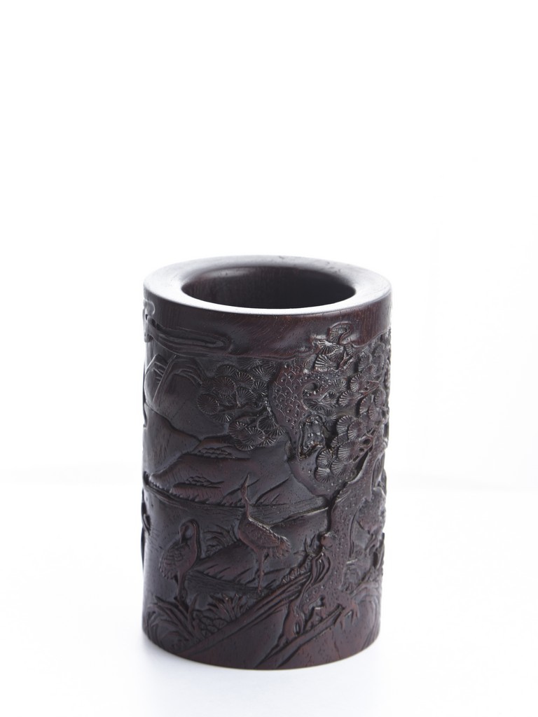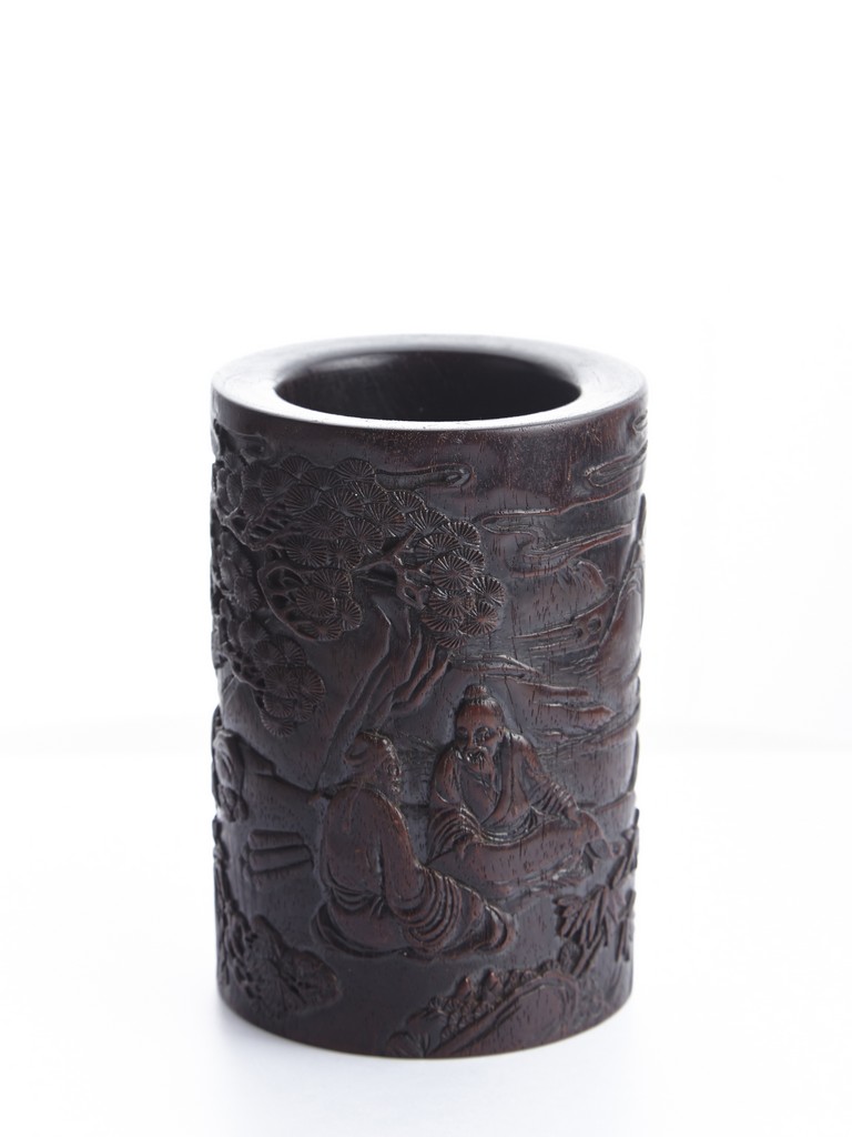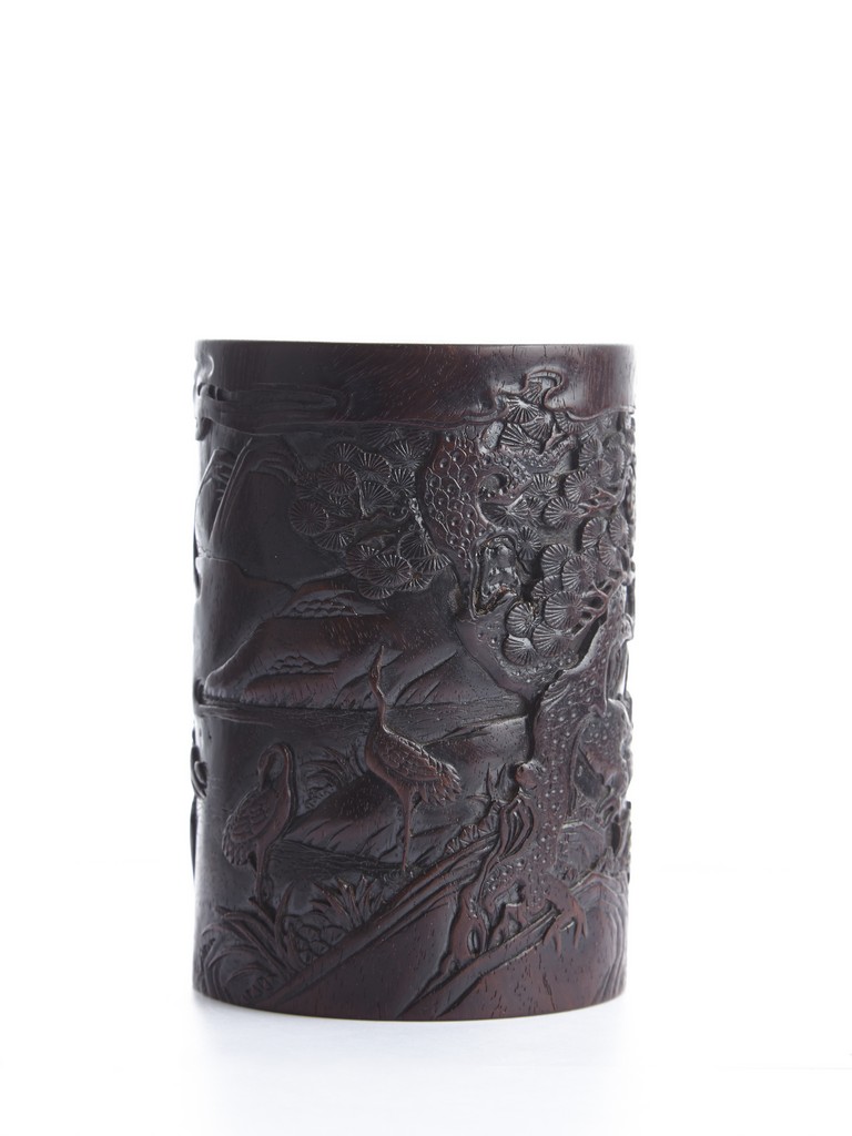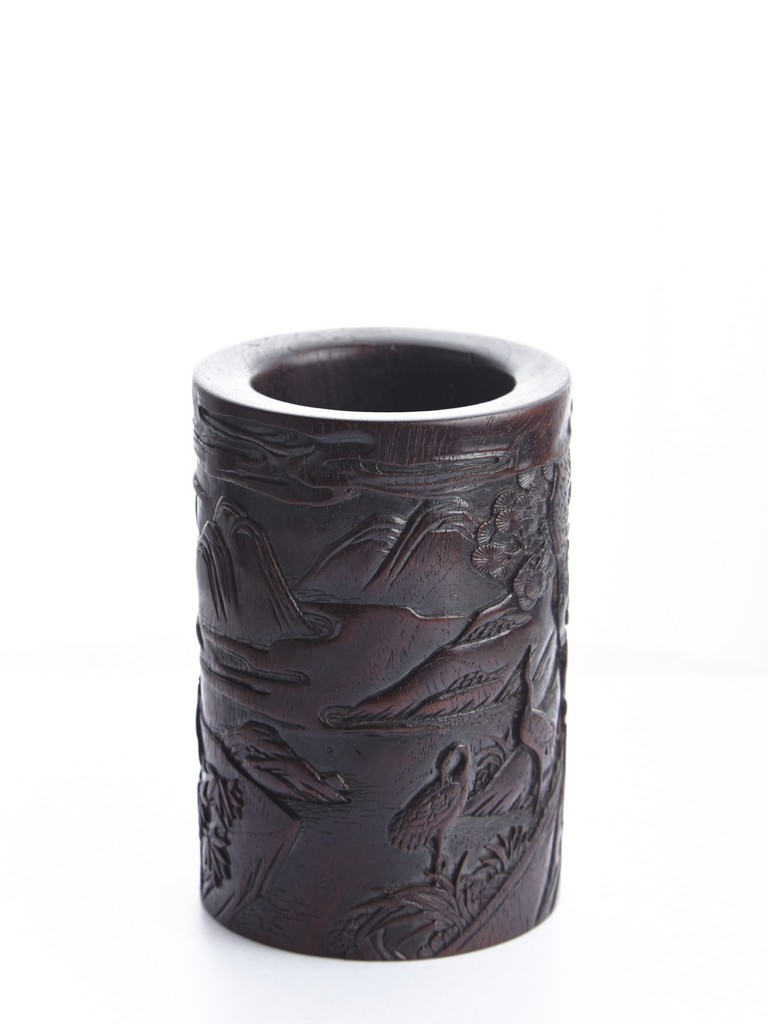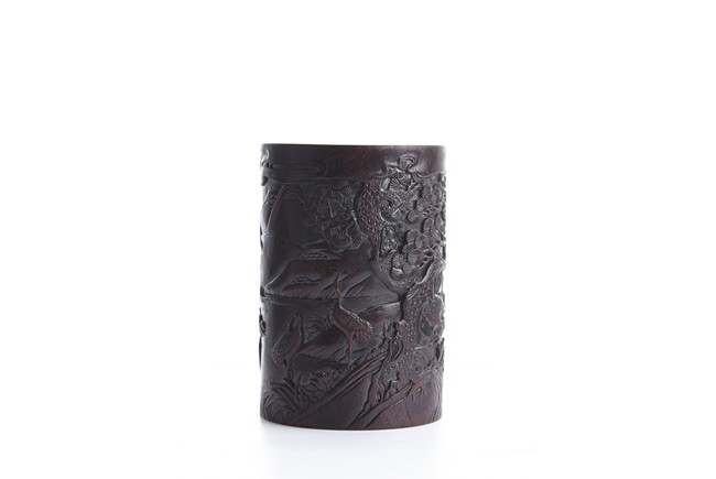 Of cylindrical form, the brush pot low relief carved with two seated elders conversing in forest setting, and two craness tanding in river bank, with pine trees, mountains, and rockworks in the backdrop. The wood brush pot with natural color, grains, and texture, and comes with en-suite plug on the bottom. Qing Dynasty period.