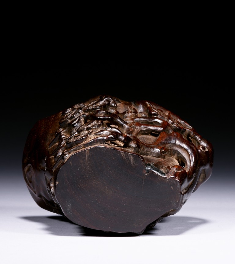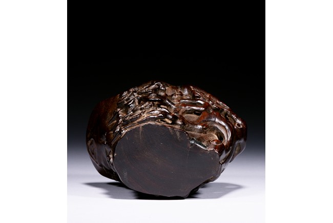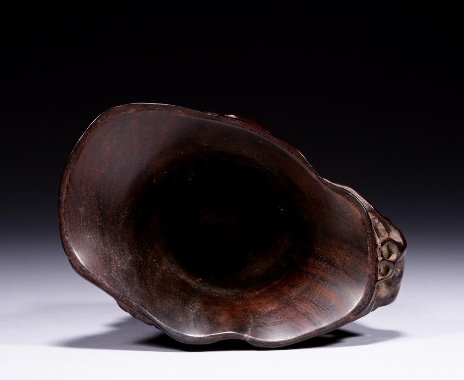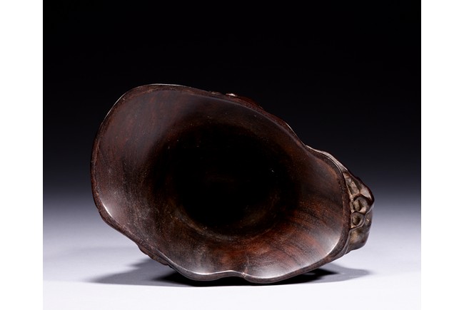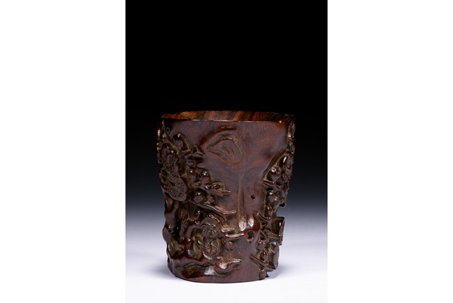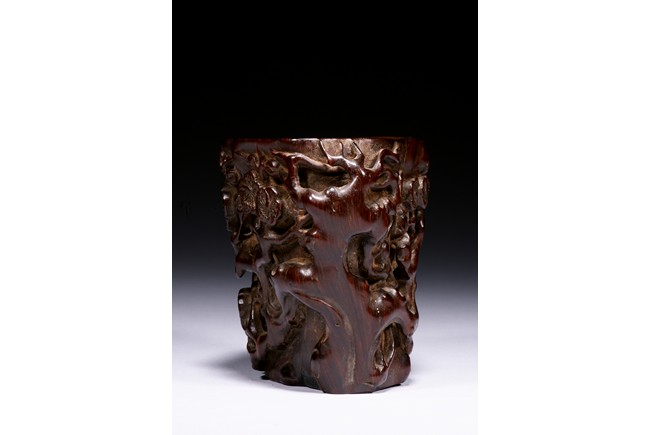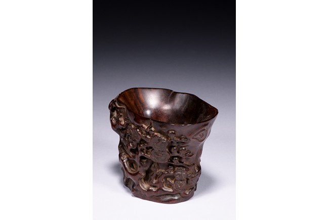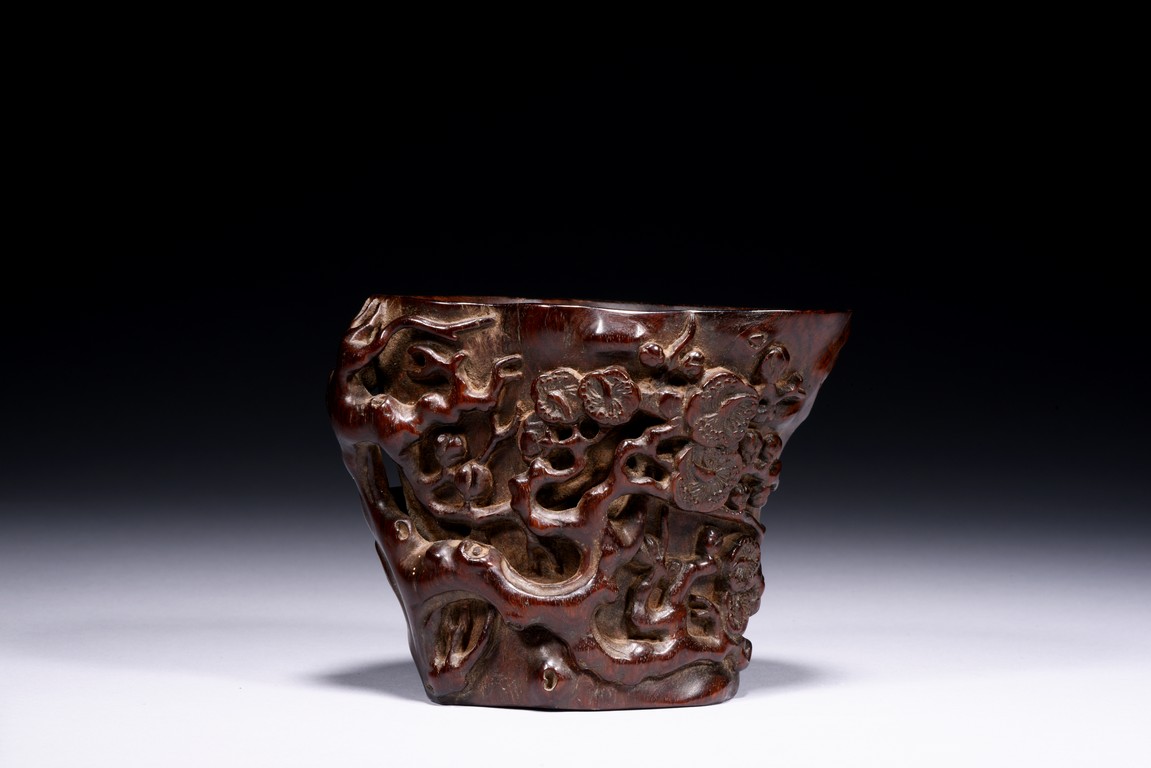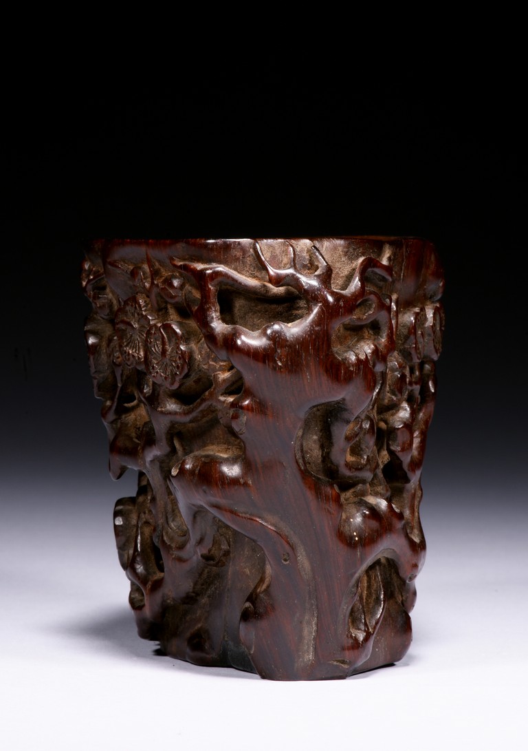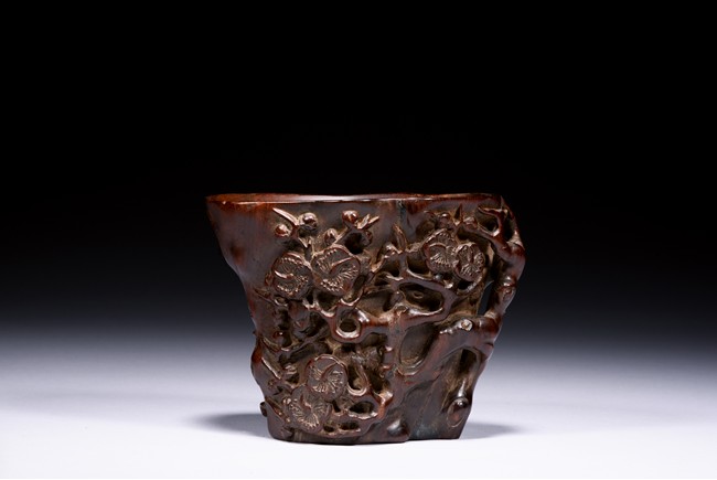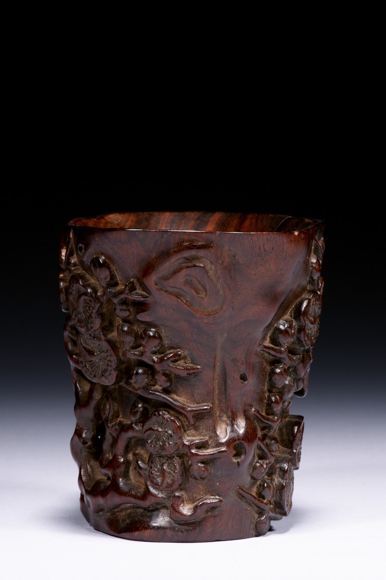 Modelled in the form of a libation cup, the exterior is carved in relief with plum blossoms and gnarled branches to both sides, all issuing from the same stem. Qing Dynasty period.