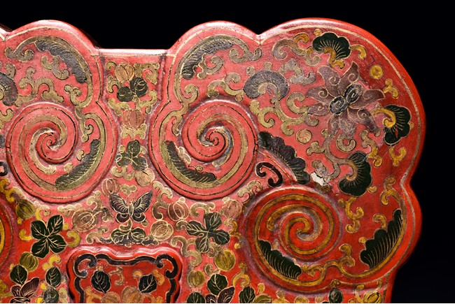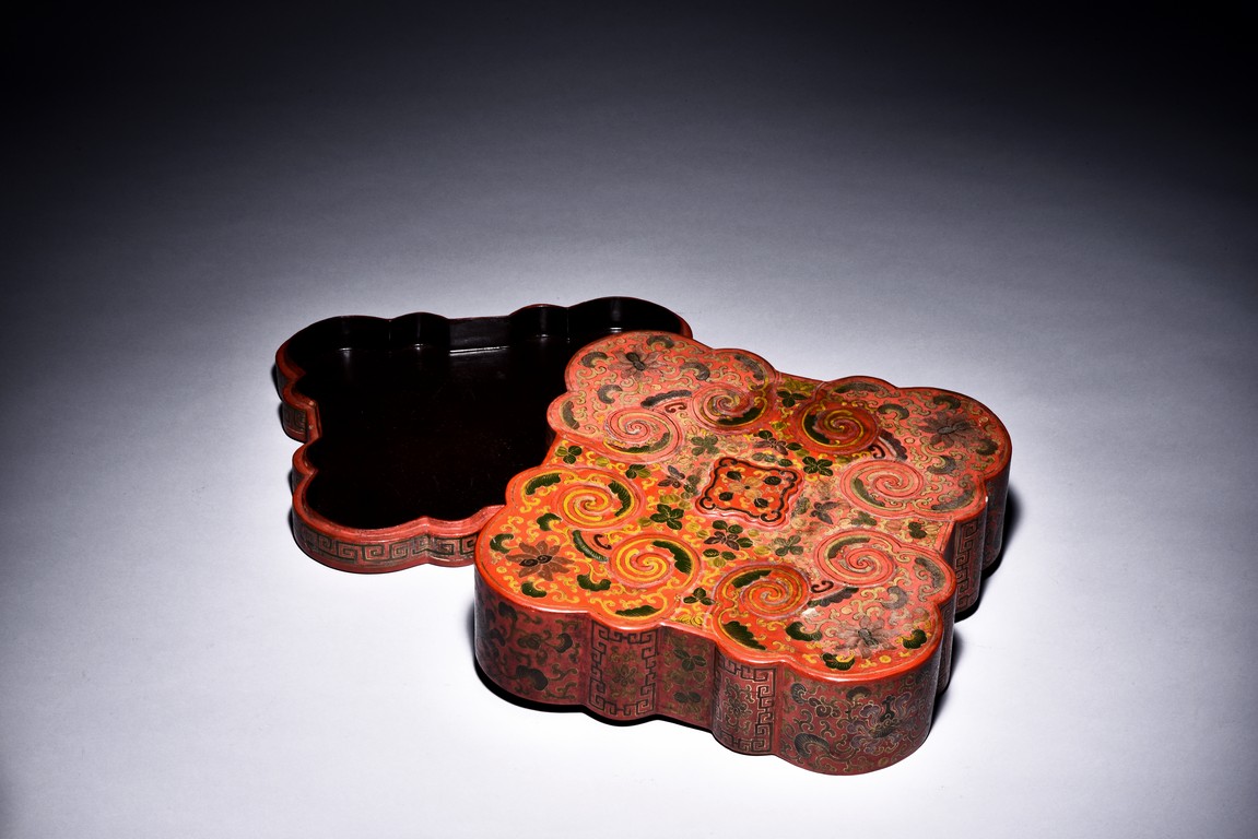 Of barbed form, the cover overall painted with scrolling floral lotus pattern and leaves in gilt and green aganit red lacquer ground, the box further decorated with a band of key-fret pattern. Qing Dynasty period.
