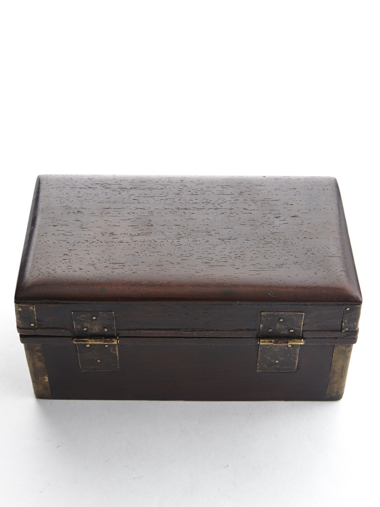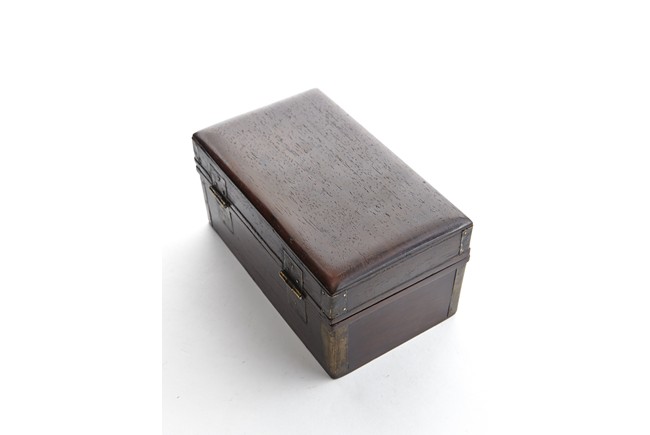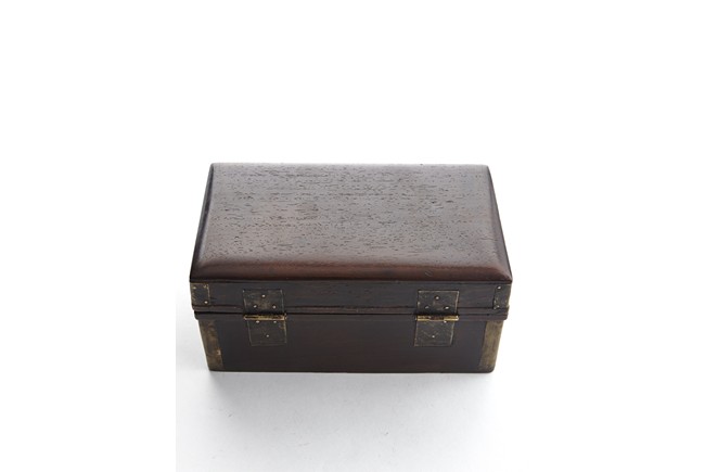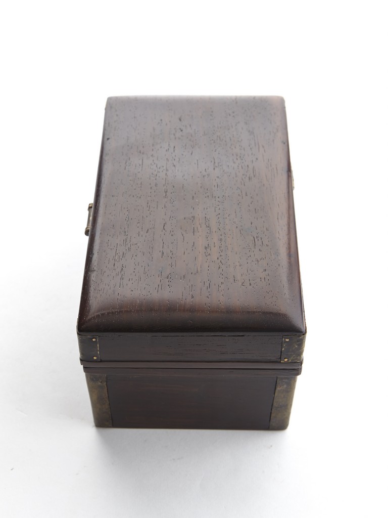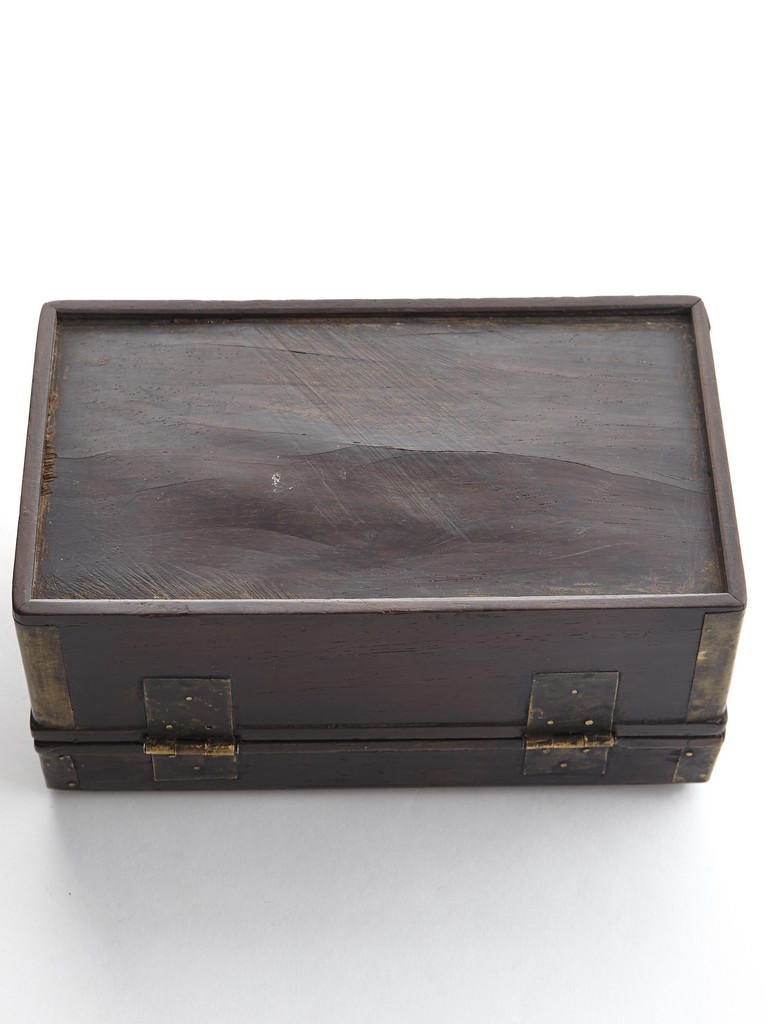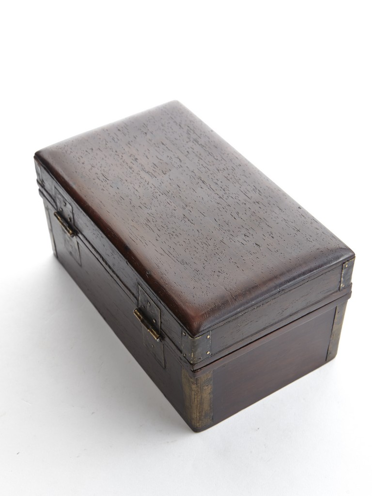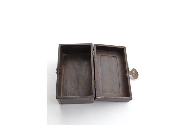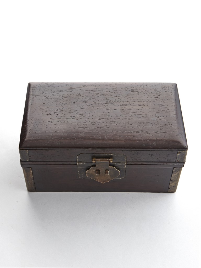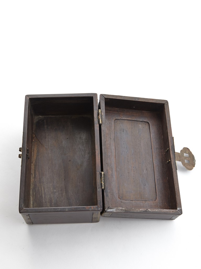 Of rectangular section, the hinged cover slightly rounded, the front with rectangular lock plate with cloud-form hasp. Qing Dynasty period.