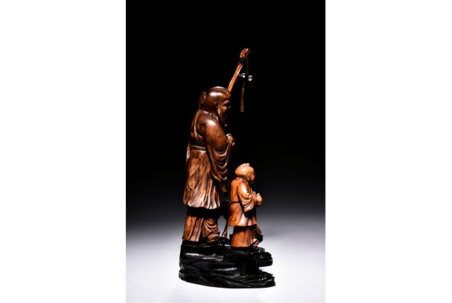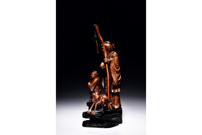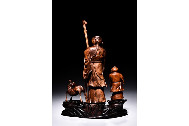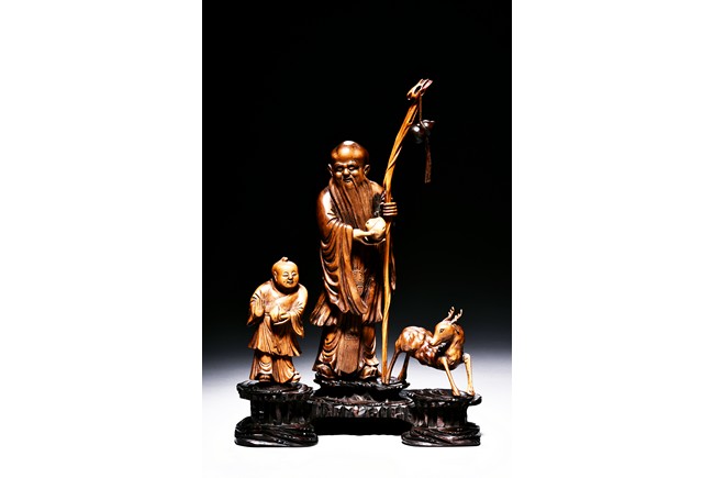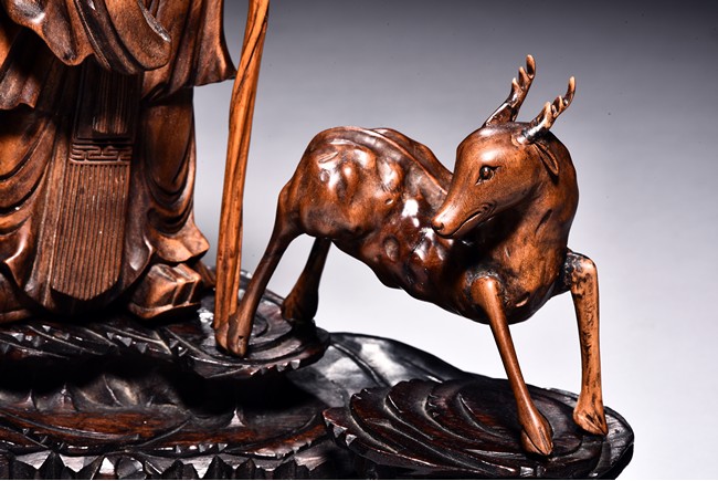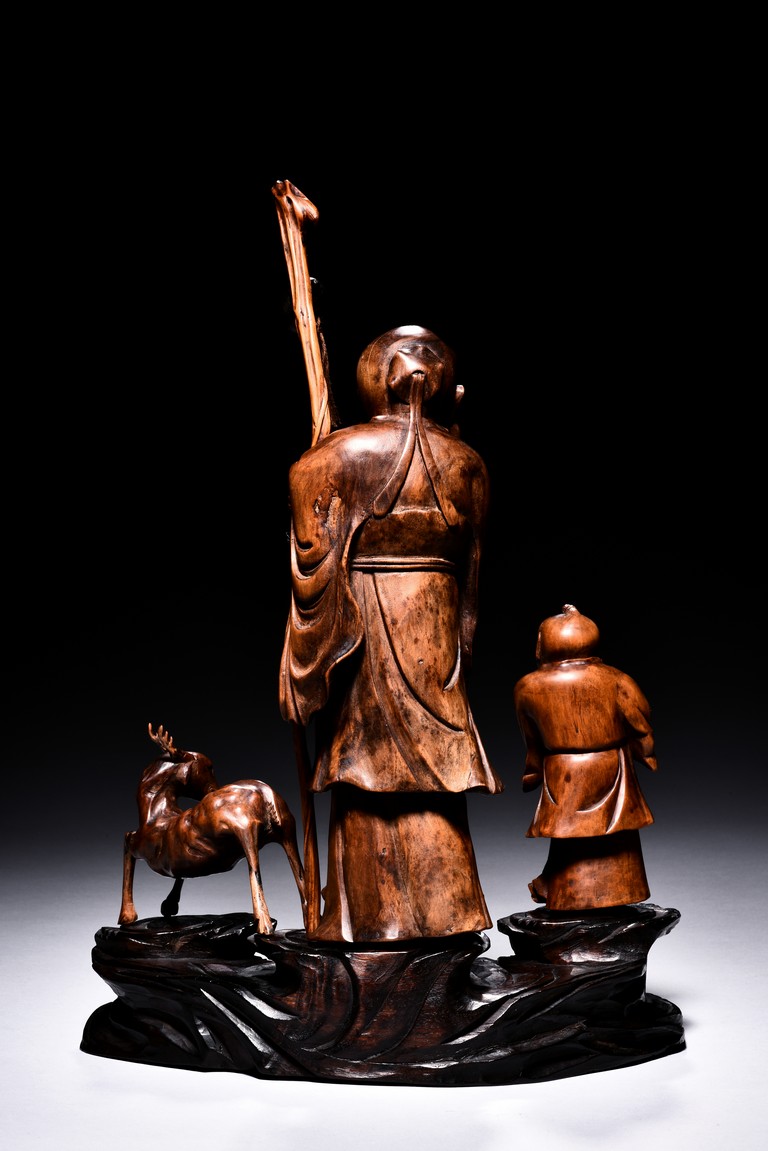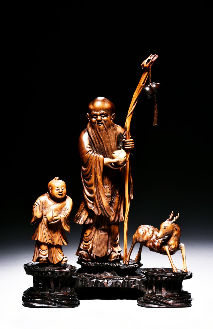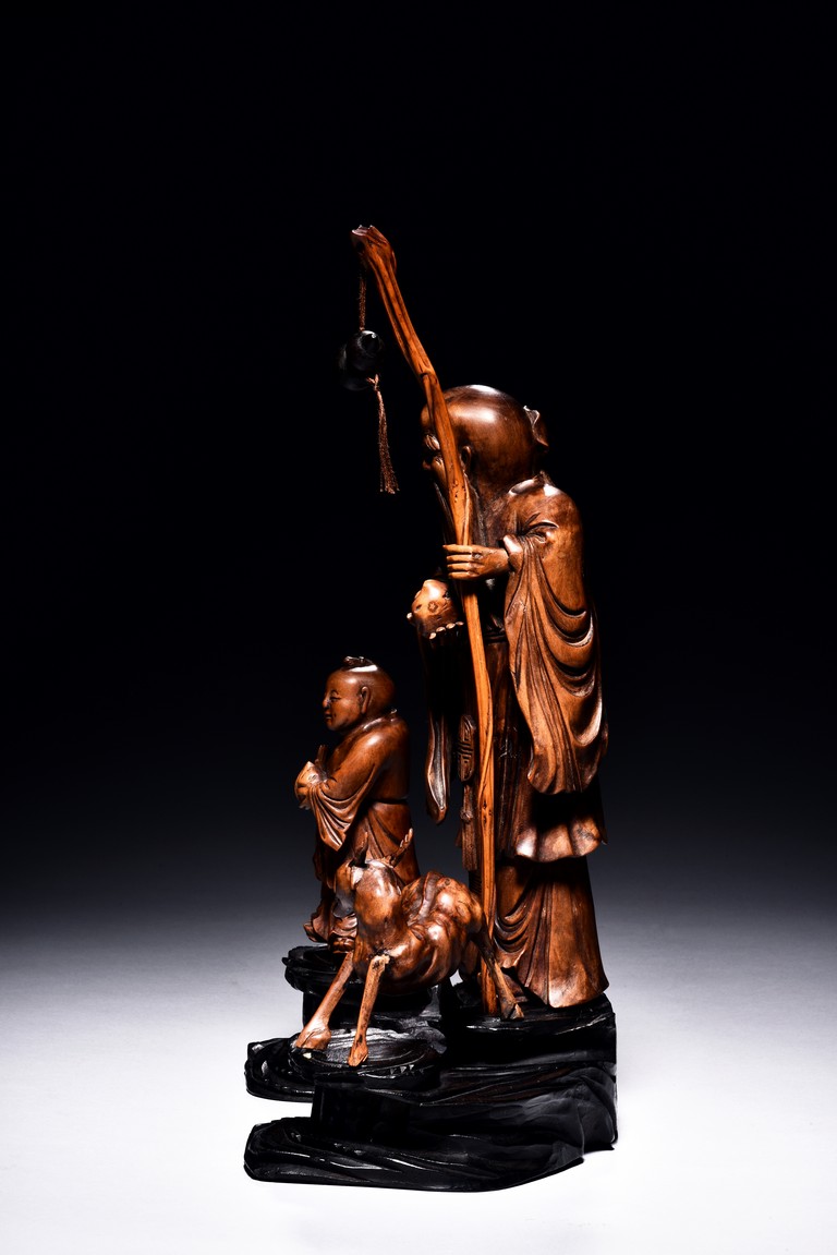 The figural group is finely carved with the longevity immortal standing at center holding a tall staff and peach, his long beard and mustache finely detailed with incised lines, accompanied by a deer to his left and a young boy to his right, all supported on a lacquered wooden stand. Late Qing Dynasty period.