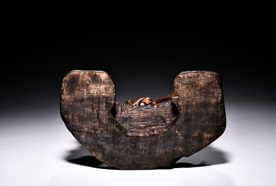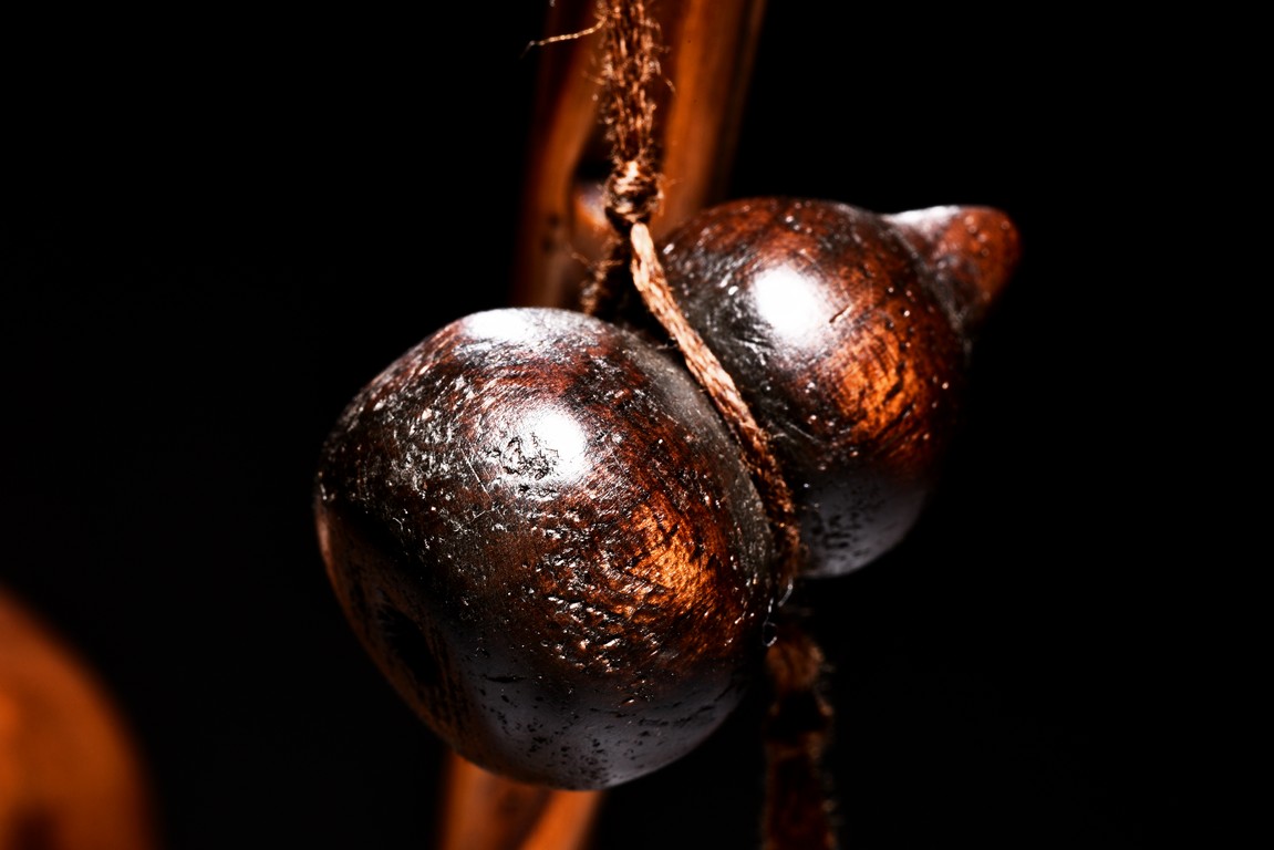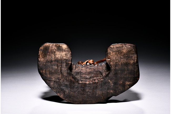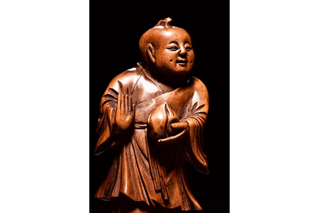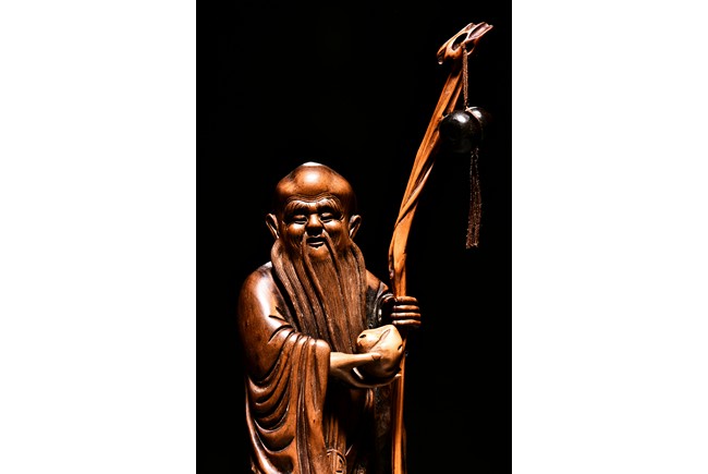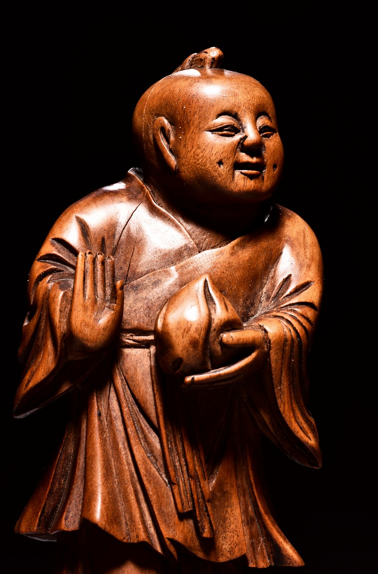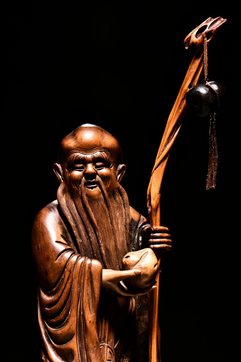 The figural group is finely carved with the longevity immortal standing at center holding a tall staff and peach, his long beard and mustache finely detailed with incised lines, accompanied by a deer to his left and a young boy to his right, all supported on a lacquered wooden stand. Late Qing Dynasty period.