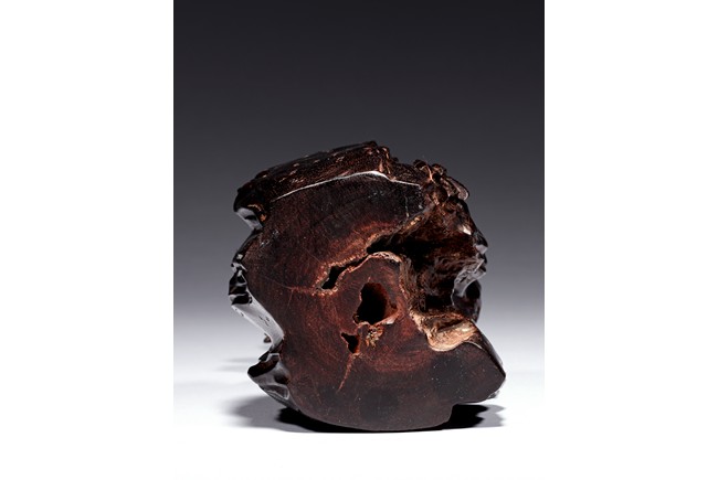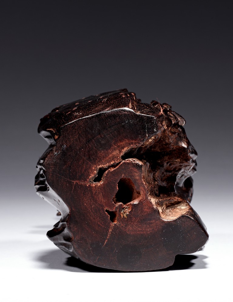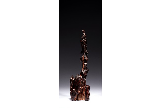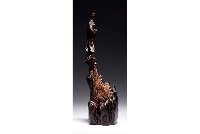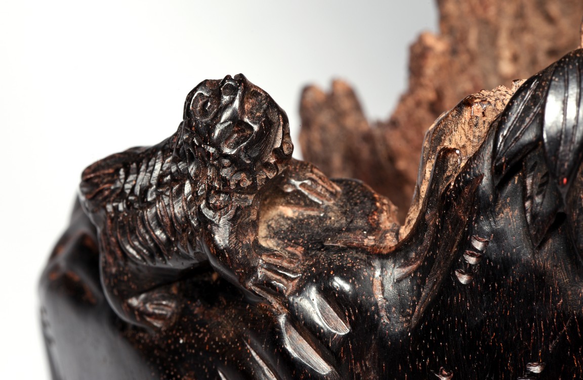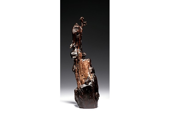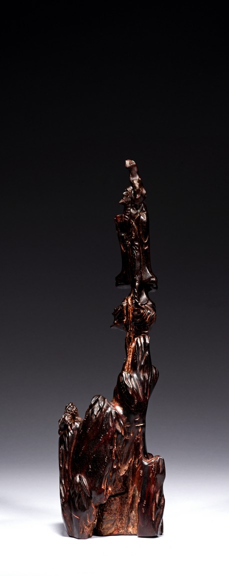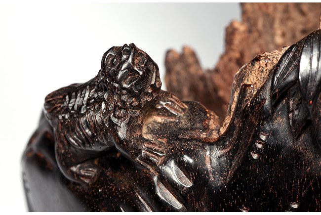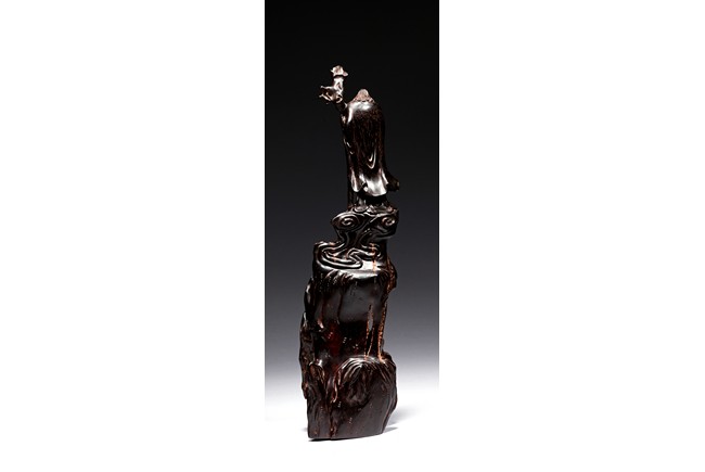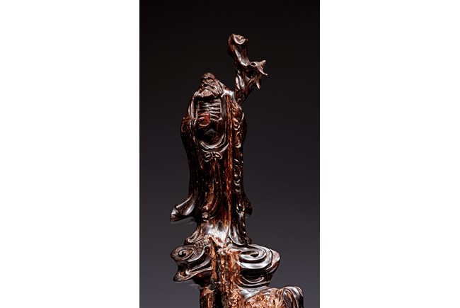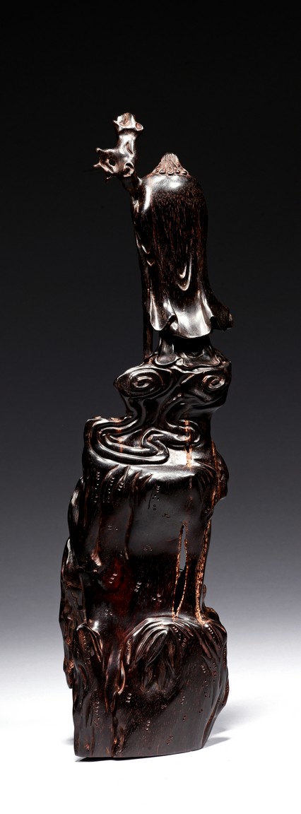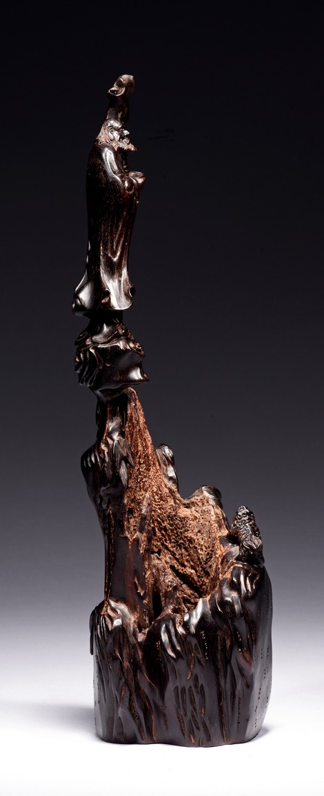 Skillfully carved, the immortal is shown standing on top of the rockwork with scrolled design to depict clouds, he is shown holdng a tall staff with left hand, wearing long robe revealing ribbed chest, his face with bushy beard and mustache, and the lower side a Buddhist lion cub is shown looking upward at the immortal. Republic period.