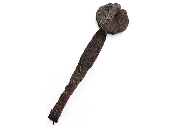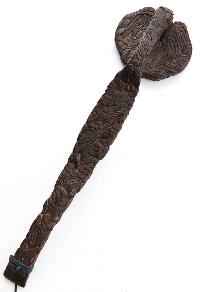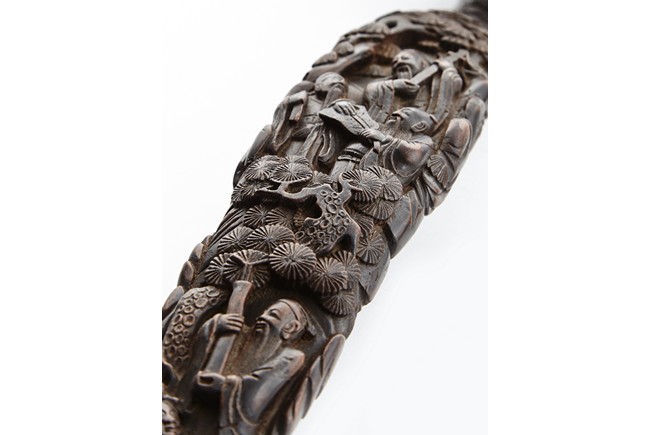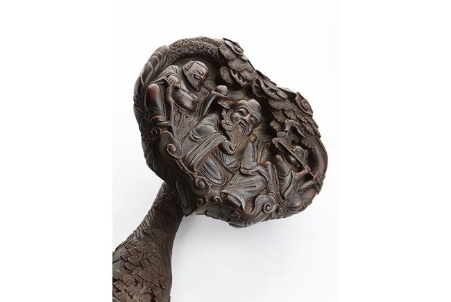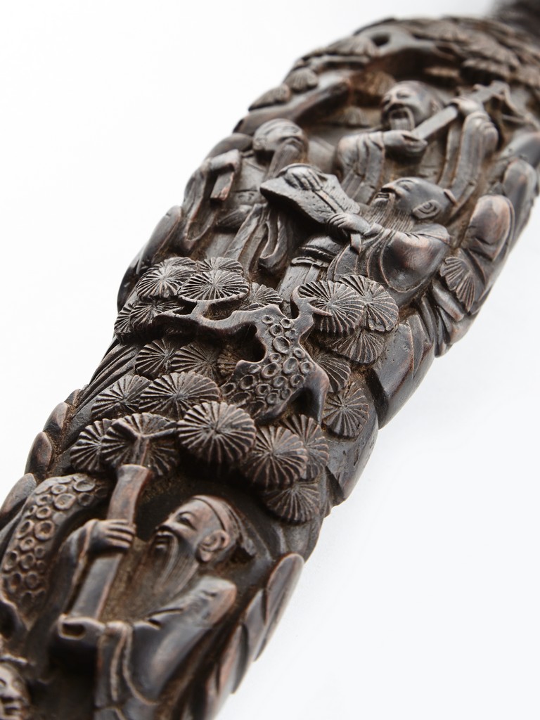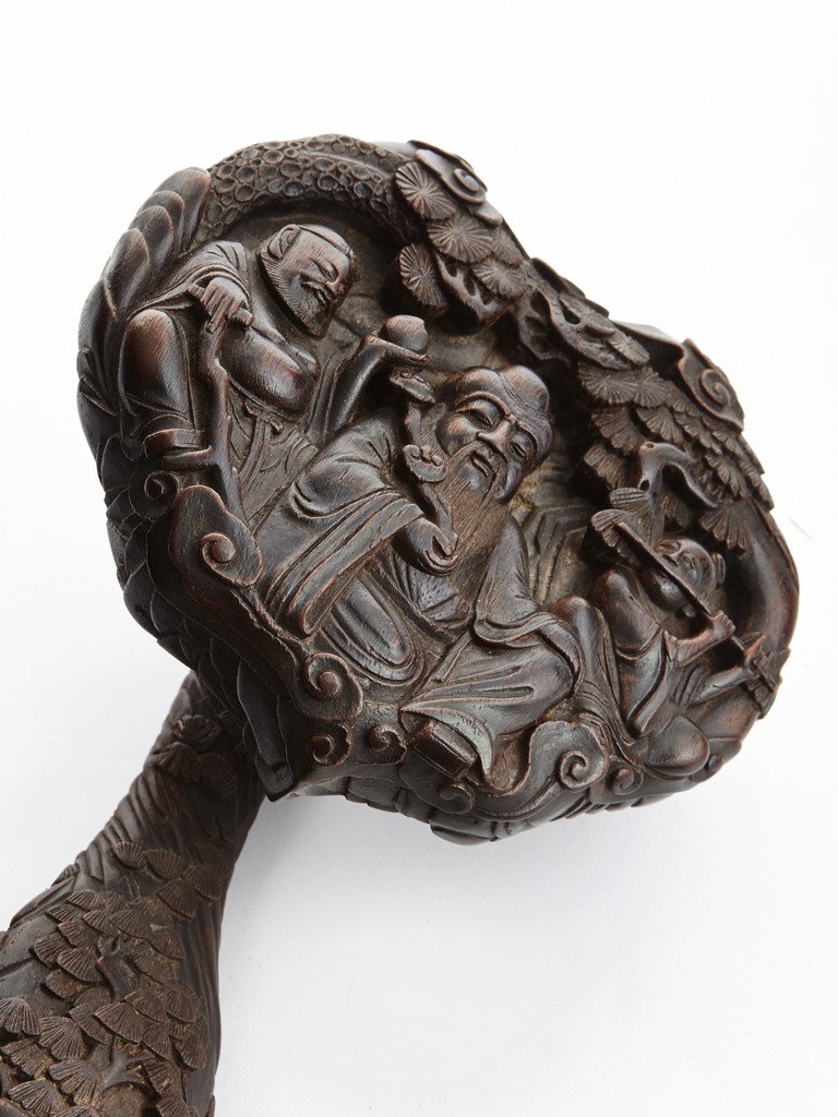 The ruyi scepter is finely carved in relief with the seated Shou longevity immortal holding a ruyi scepter accompanied by two attendants under pine, one raising a peach and the other playing flute on the ruyi head; the shaft with three elderly immortals in a conversation amid a mountainous landscape; the lower end further carved with an immortal holding a scroll with two young attendants, all amongst pines and rocks. Qing Dynasty period.