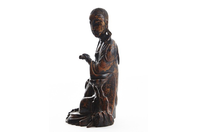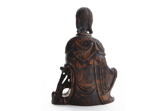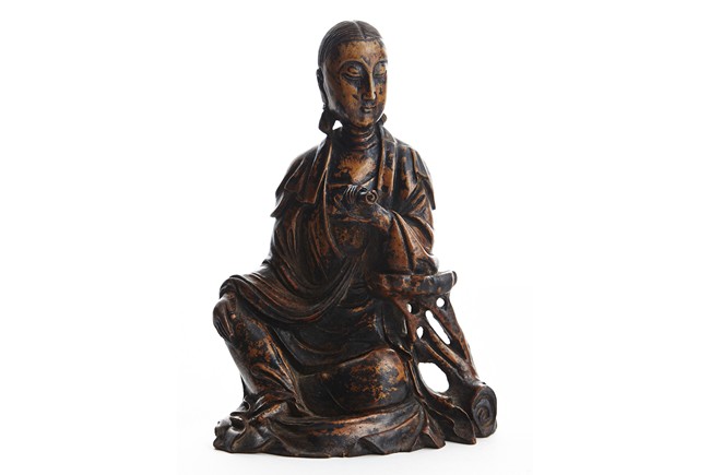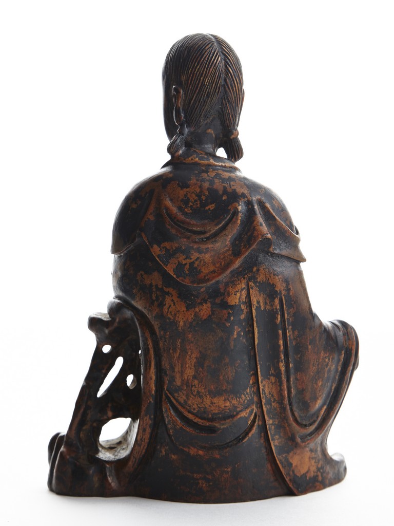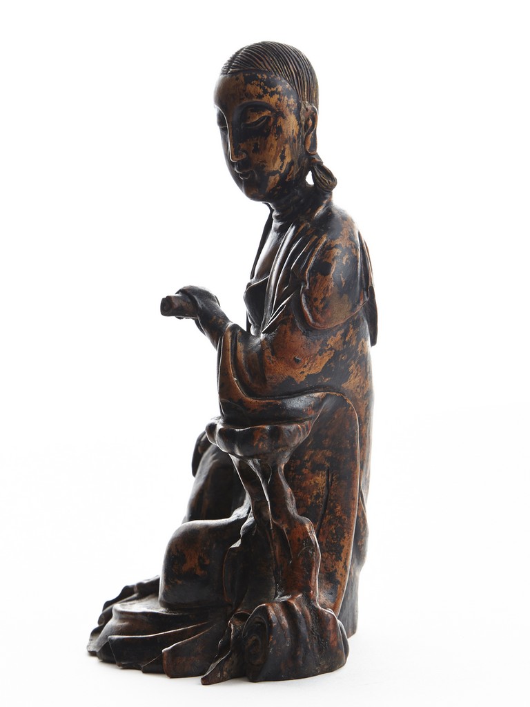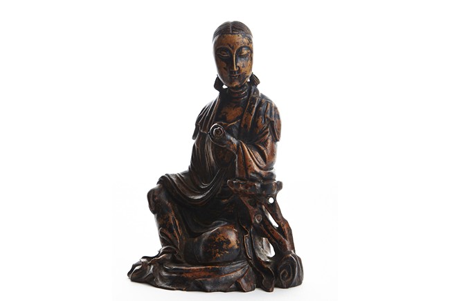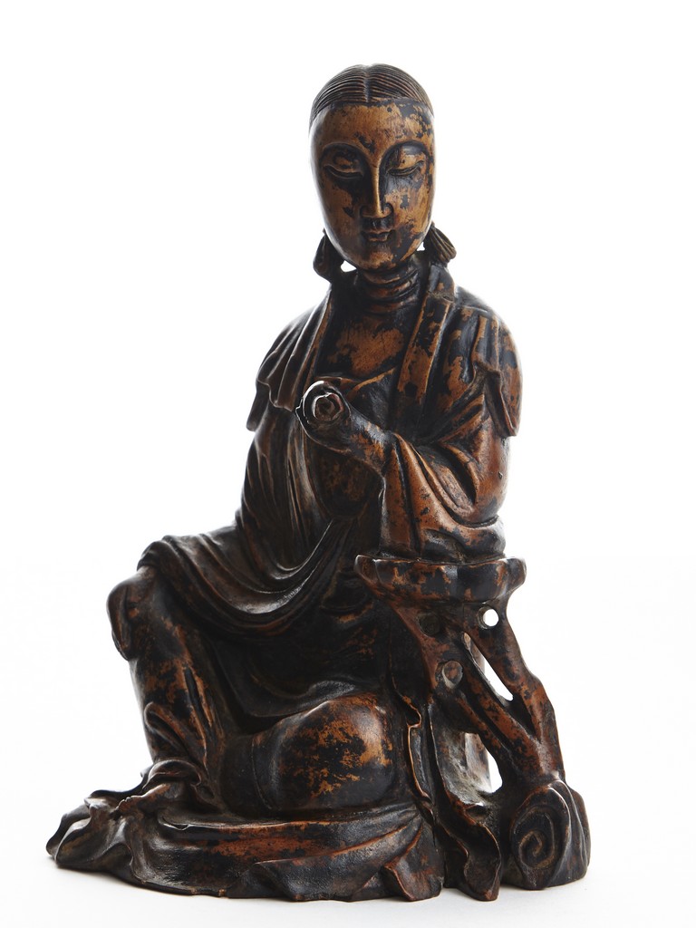 Shown seated in royal ease, her left hand holding a scroll, right hand rested on knee, wearing robe falling in elegant folds, hair detailed with incised lines. Qing Dynasty period.