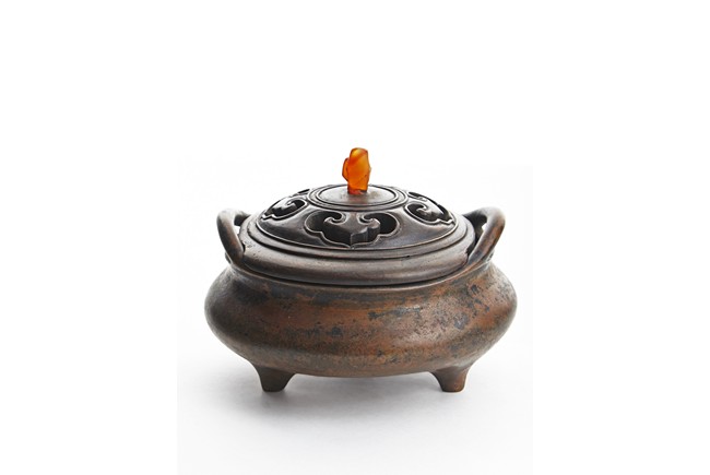 Of compressed globular form, the censer is supported on three short feet with two raised handles, the base cast with a four character 'Yu Tang Qing Wan' mark, fitted with a reticulated cover and surmounted with a oblong red agate finial. Qing Dynasty period.