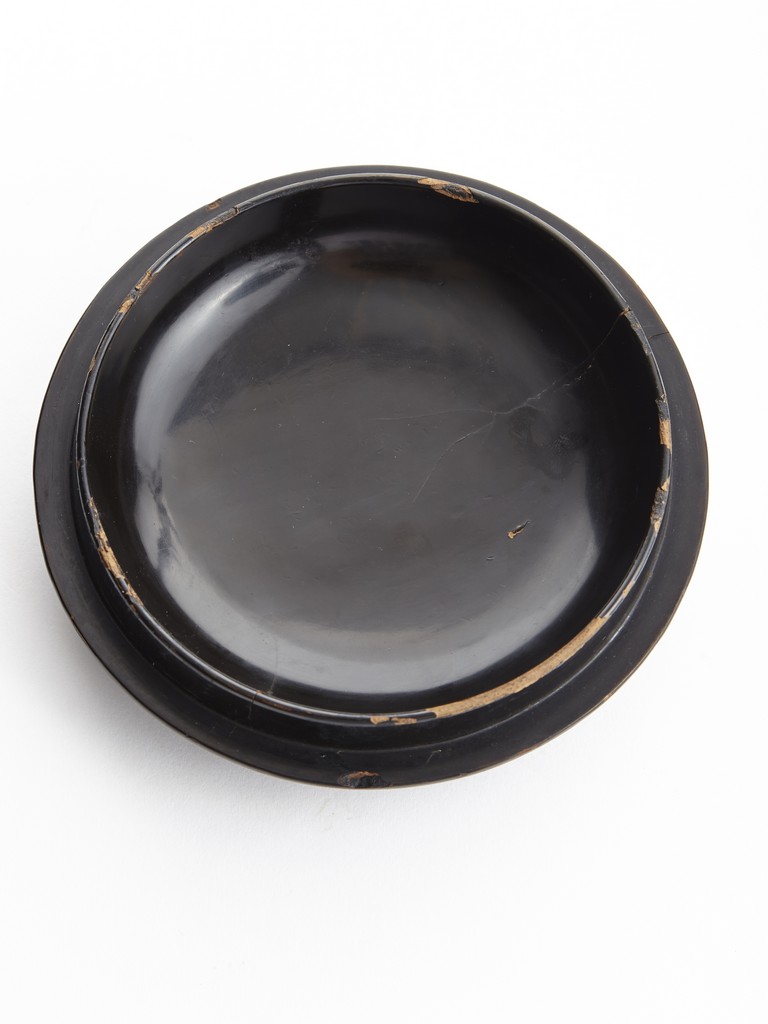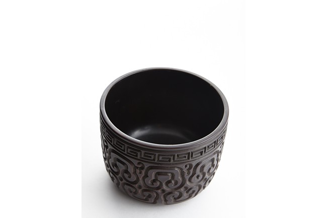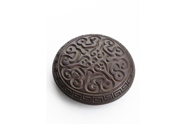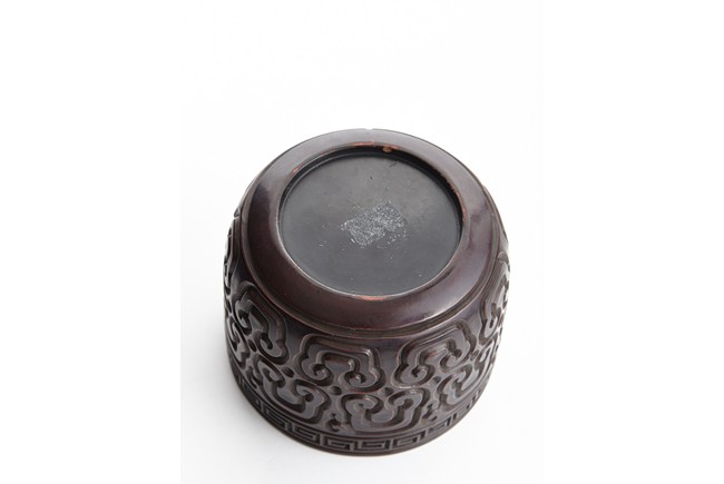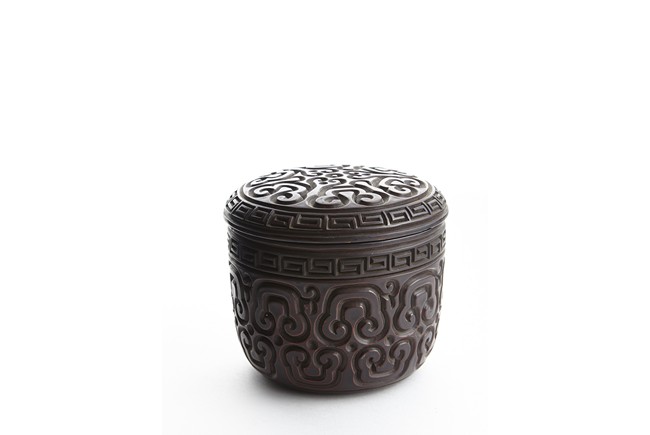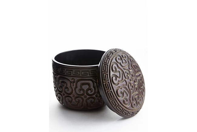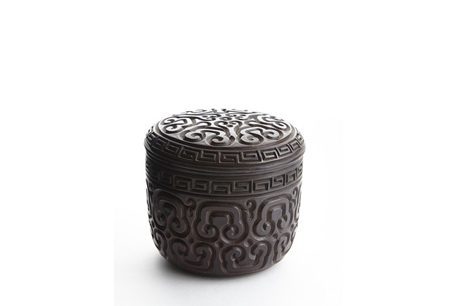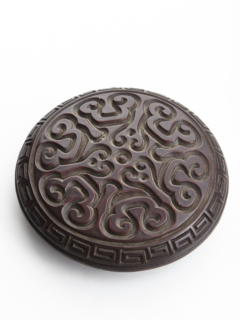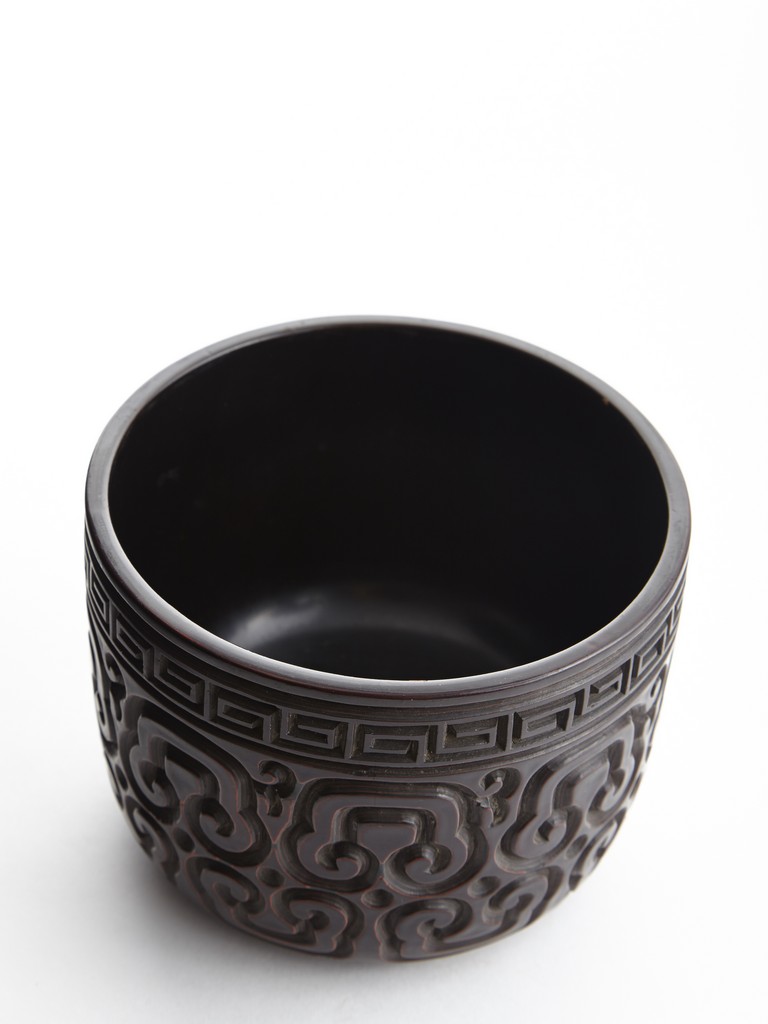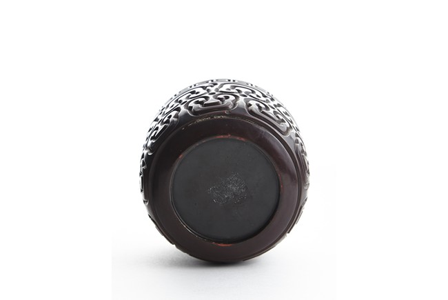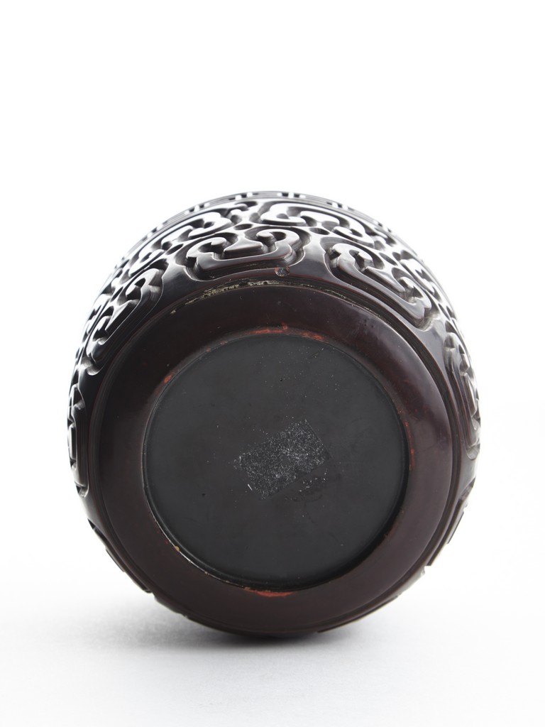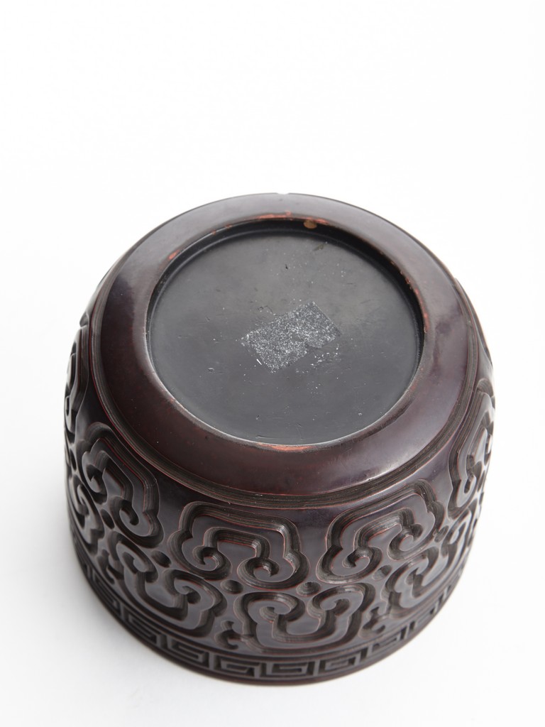 Of round section, the body deeply carved in relief through severallayers of alternating black and red lacquer in a repeating bands of ruyi scrolls, with a key-fret band encircling the mouth. The cover further carved with similar ruyi scroll patterns. Ming Dynasty period.