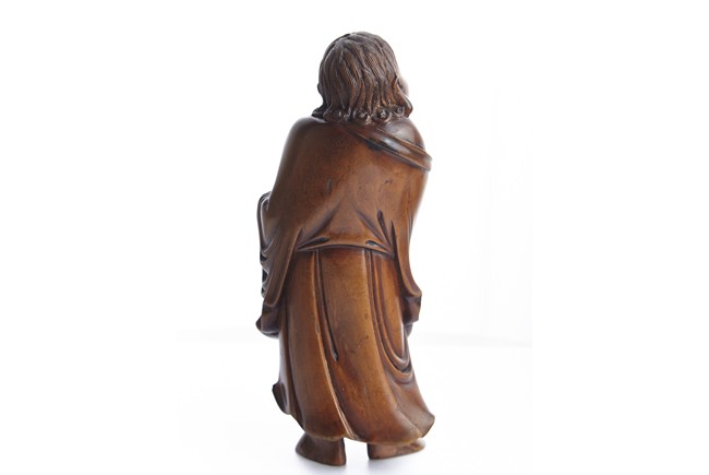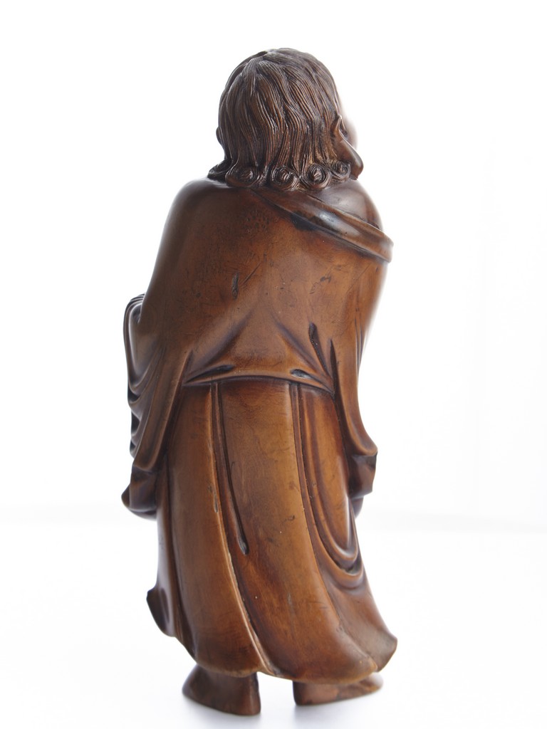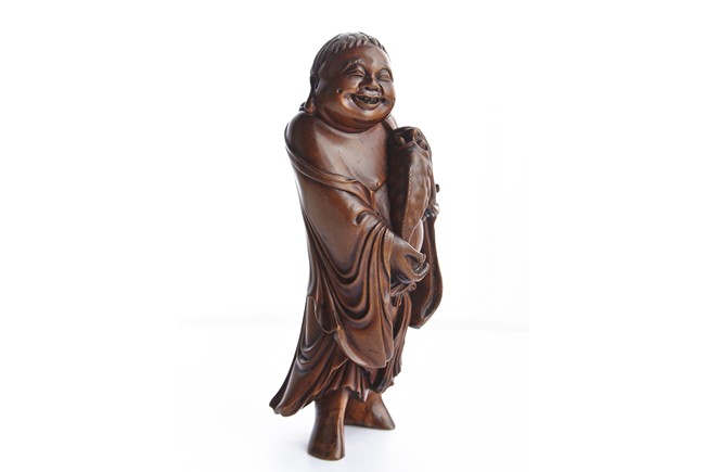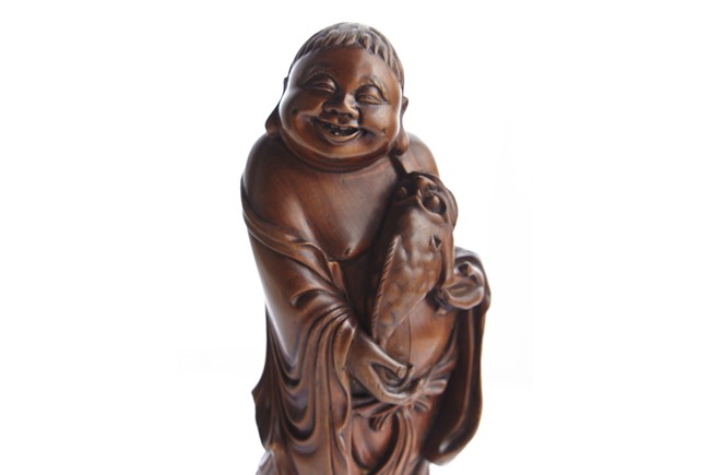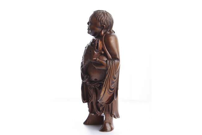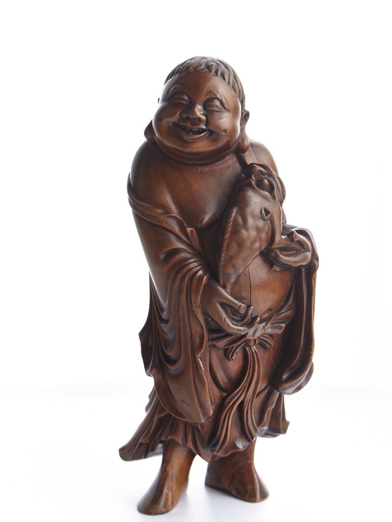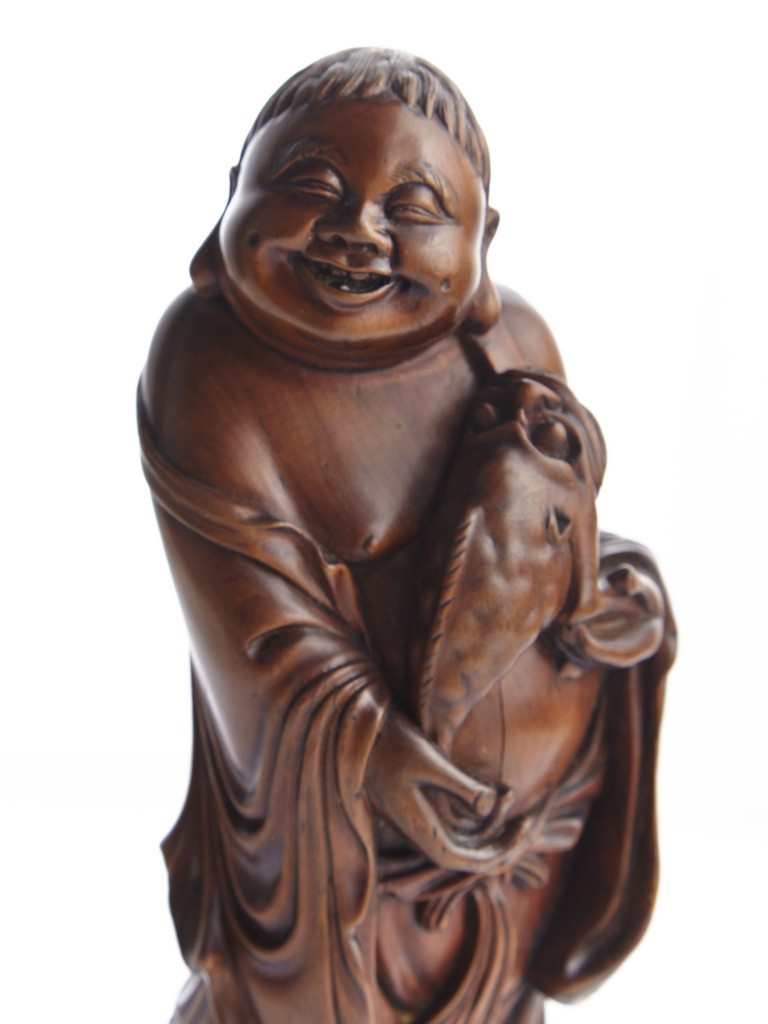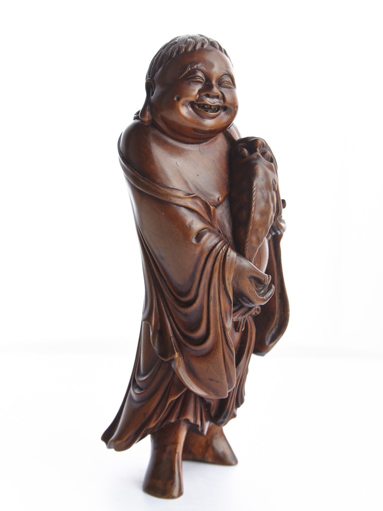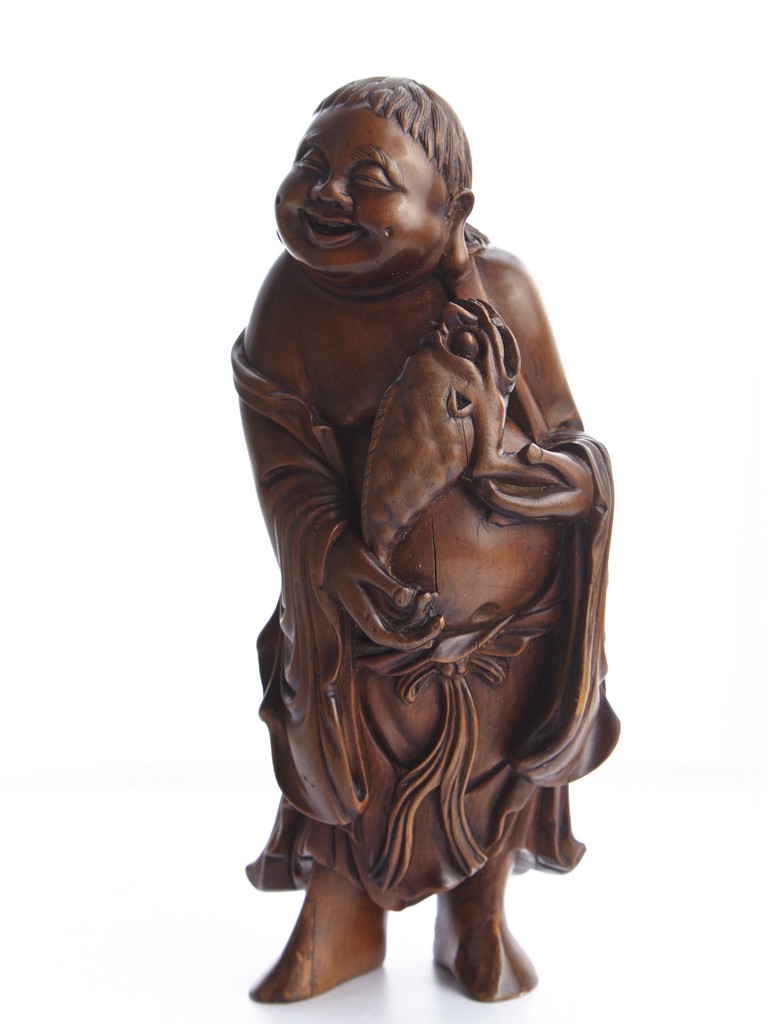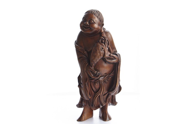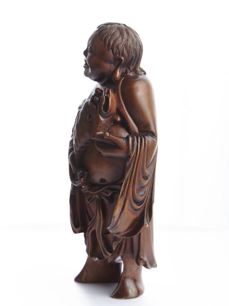 An exquisitely carved, 18th century, HuangYangMu statue of Liu Hai with his golden frog. Includes original stand. Mid Qing Dynasty period.