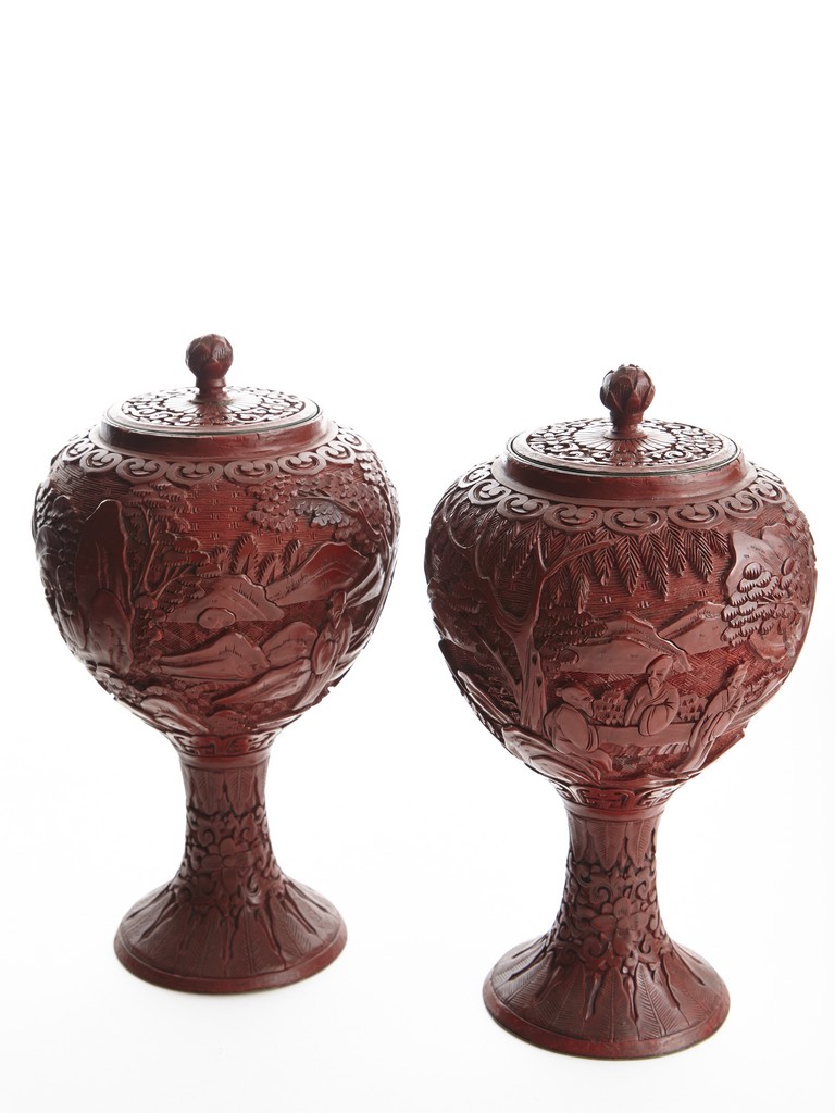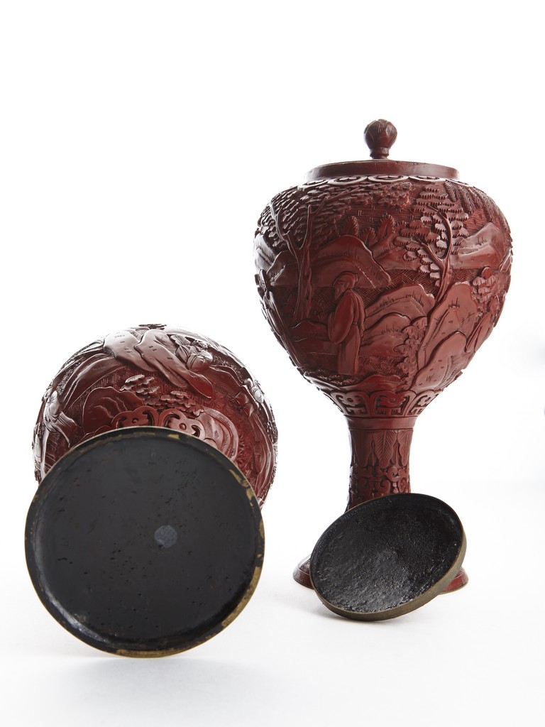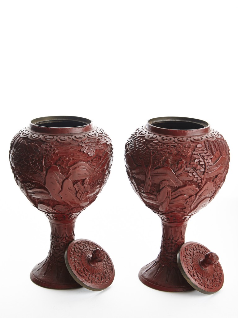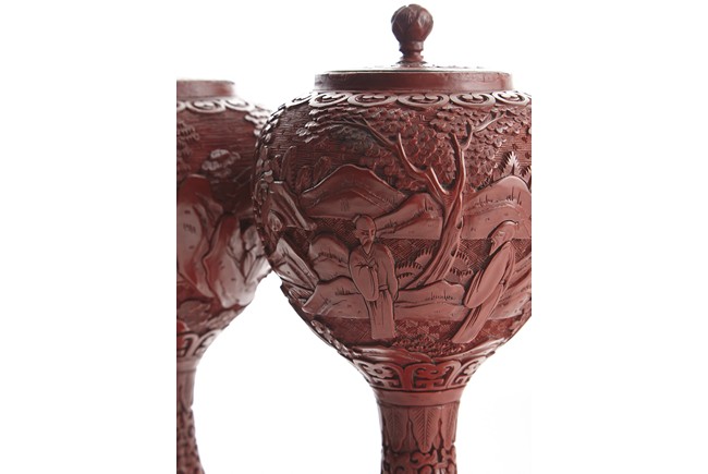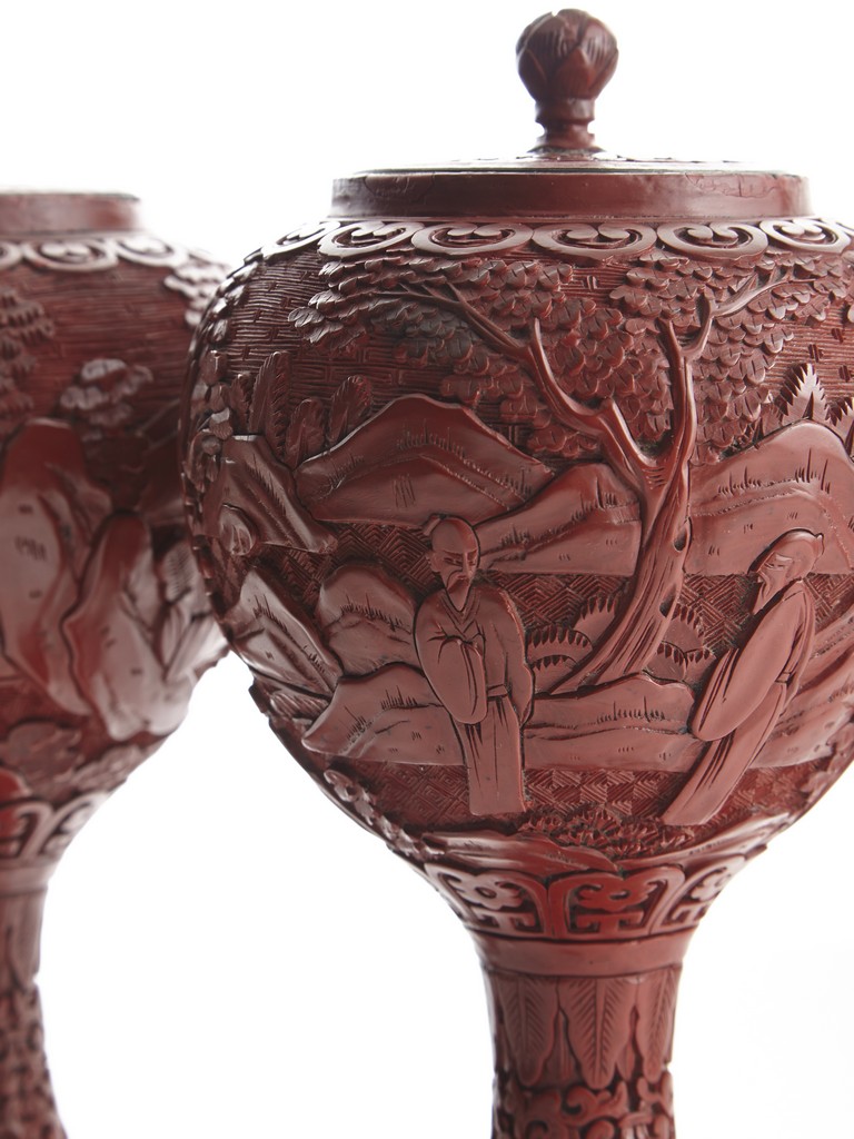 Each of globular form, the exterior finely carved with a continous scene of elderly gentlemen in conversation and appreciating the scenery amongst tall wutong, pine, willows, and rockworks, with mountains to the distance, all reserved on dense diaper ground, the mouth rim encircled by a ruyi-shaped band. The lower body carved with lotus scrolls flanked by two bands of leaves. The fitted cover decorated with floral scrolls and surmounted with a lotus bud finial. Qing Dynasty period.