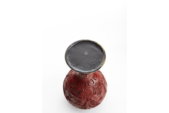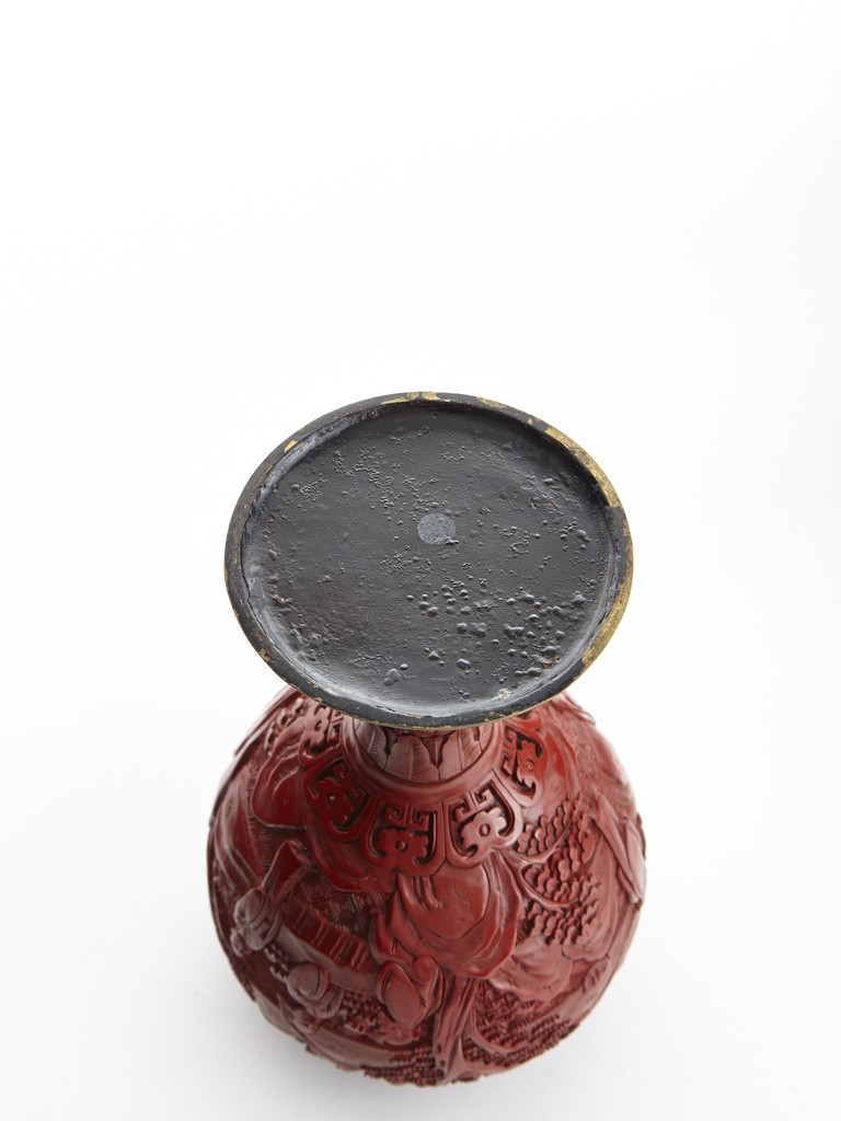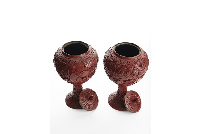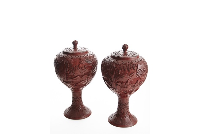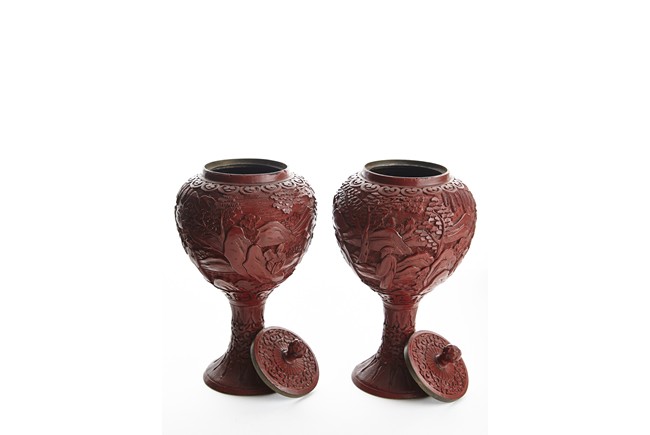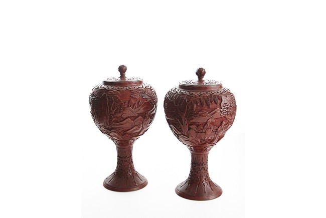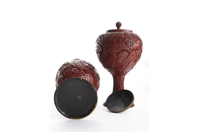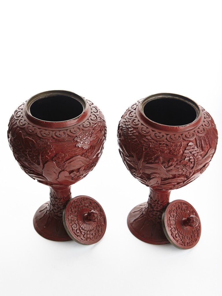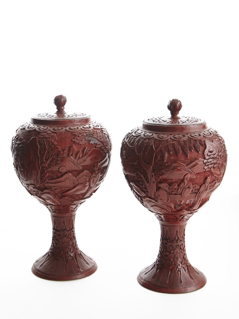 Each of globular form, the exterior finely carved with a continous scene of elderly gentlemen in conversation and appreciating the scenery amongst tall wutong, pine, willows, and rockworks, with mountains to the distance, all reserved on dense diaper ground, the mouth rim encircled by a ruyi-shaped band. The lower body carved with lotus scrolls flanked by two bands of leaves. The fitted cover decorated with floral scrolls and surmounted with a lotus bud finial. Qing Dynasty period.