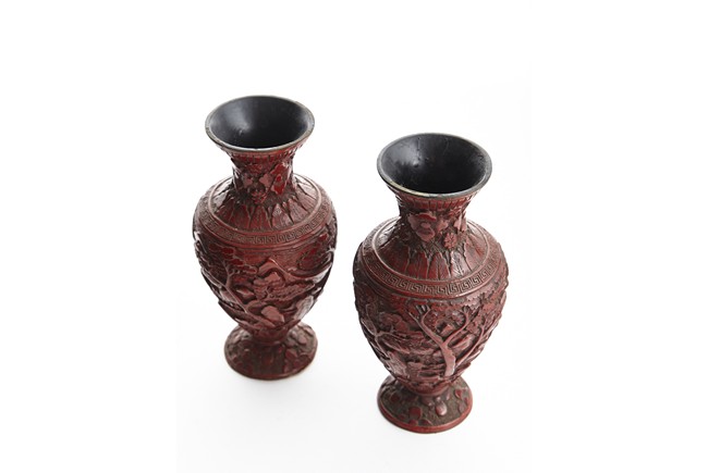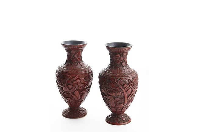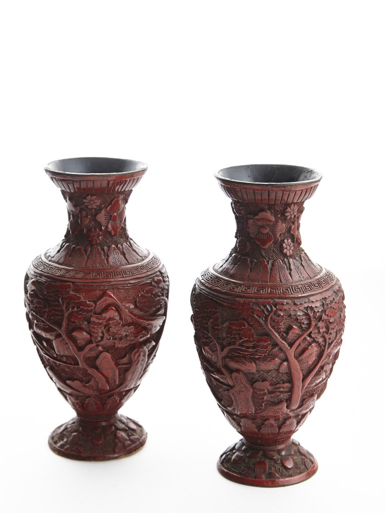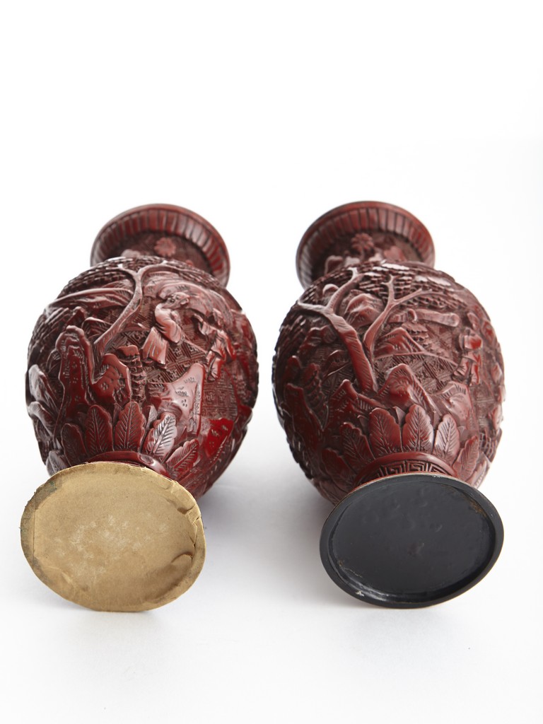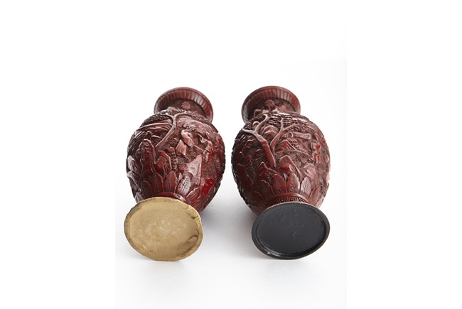 Each of baluster form, the body carved with a continous garden scene of tall wutong trees and various rockworks flanked between leaf and key-fret band, the neck further carved with flower motifs, all reserved against dense diaper ground. Qing Dynasty period.