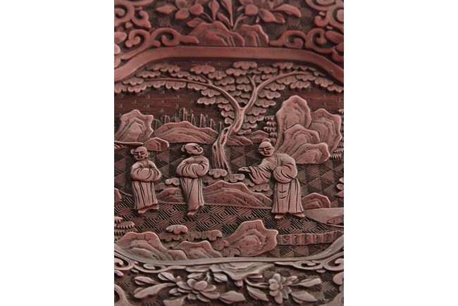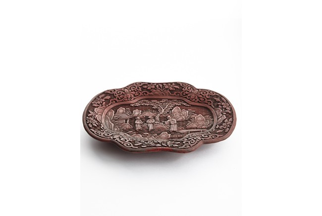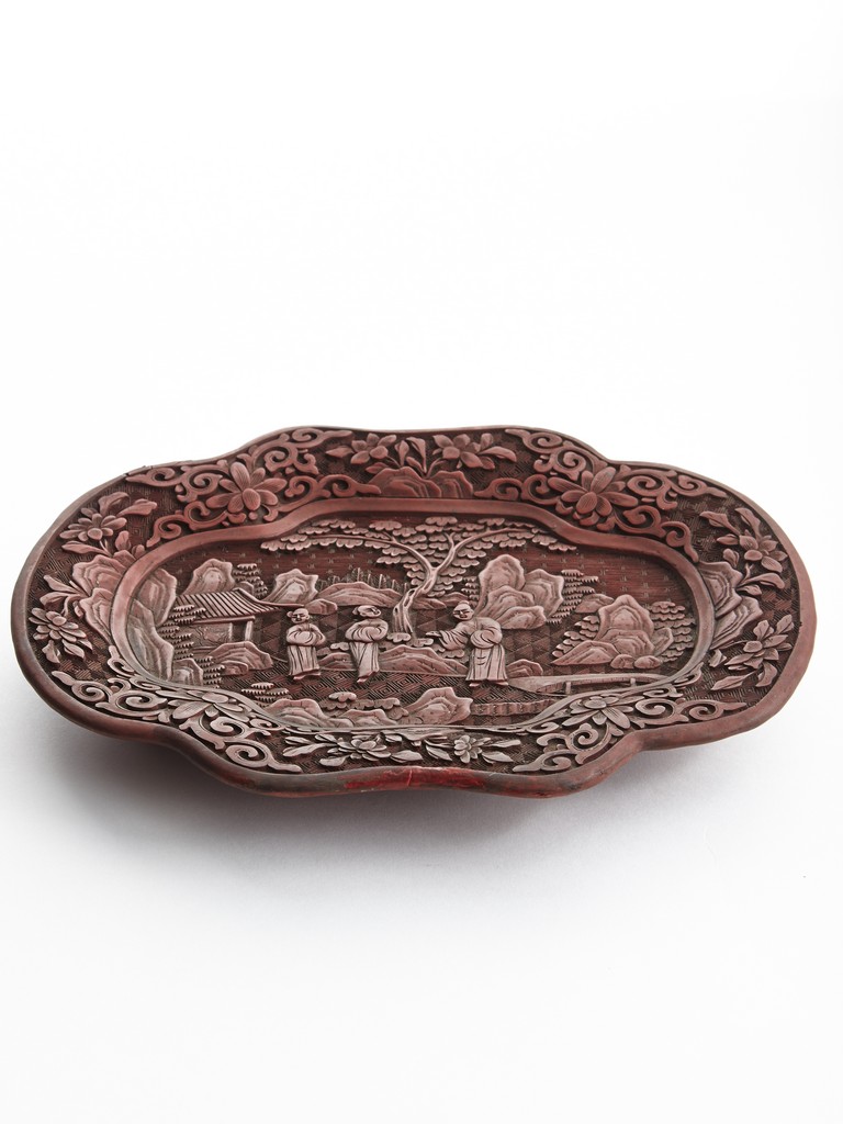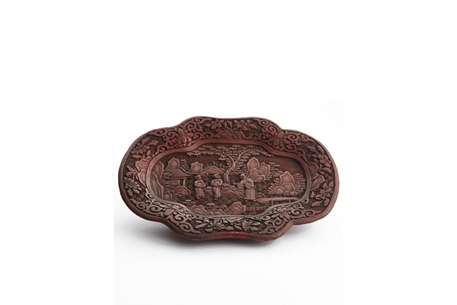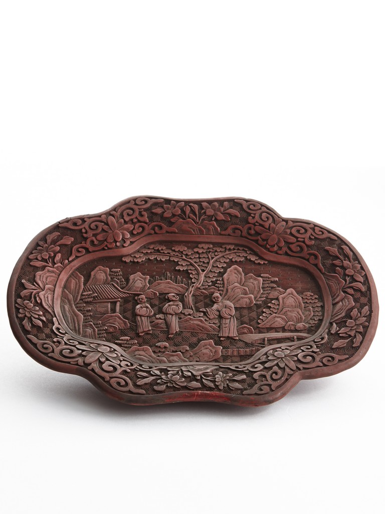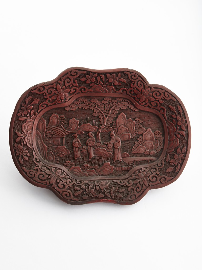Of lobed form, the dish is finely carved with three figures in a conversation under a wutong tree in a garden setting, among pavillion, bridge, and various mountains to the far distance, all enclosed within a band of scrolled floral pattern and flowers issuing from rocky outcrops. Qing Dynasty period.