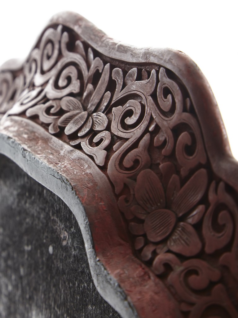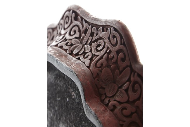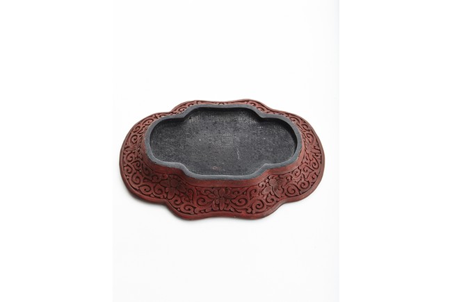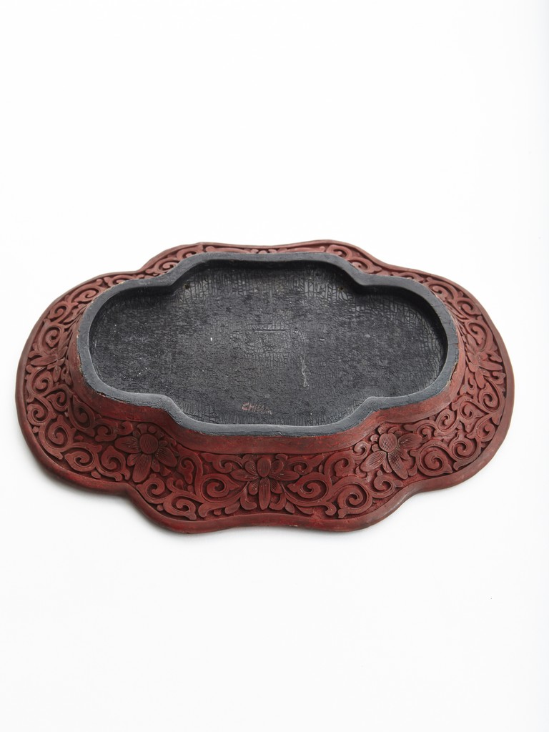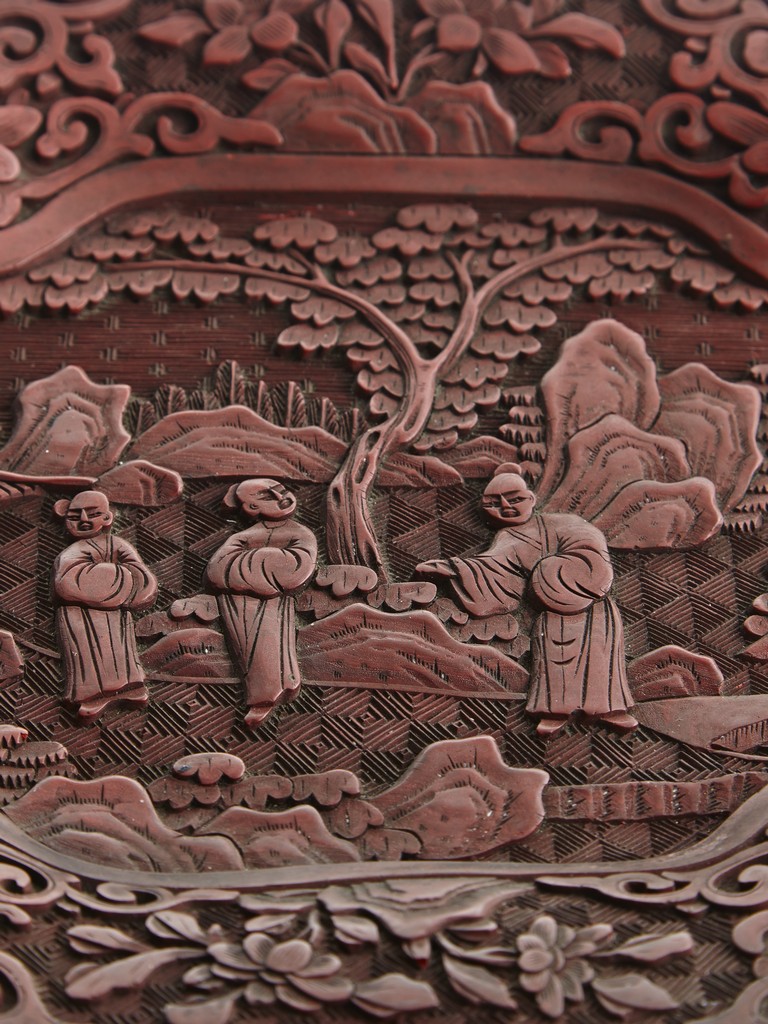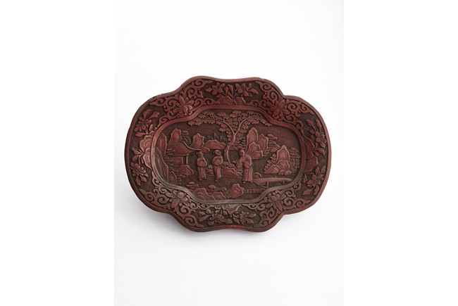 Of lobed form, the dish is finely carved with three figures in a conversation under a wutong tree in a garden setting, among pavillion, bridge, and various mountains to the far distance, all enclosed within a band of scrolled floral pattern and flowers issuing from rocky outcrops. Qing Dynasty period.